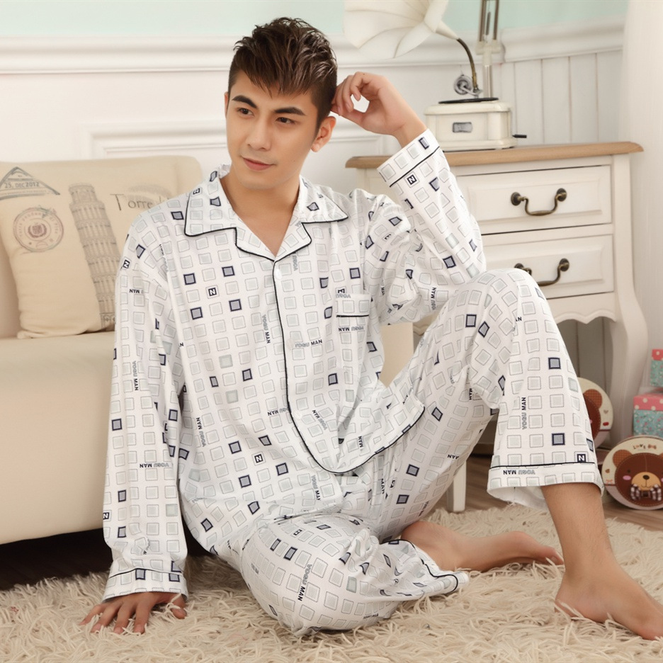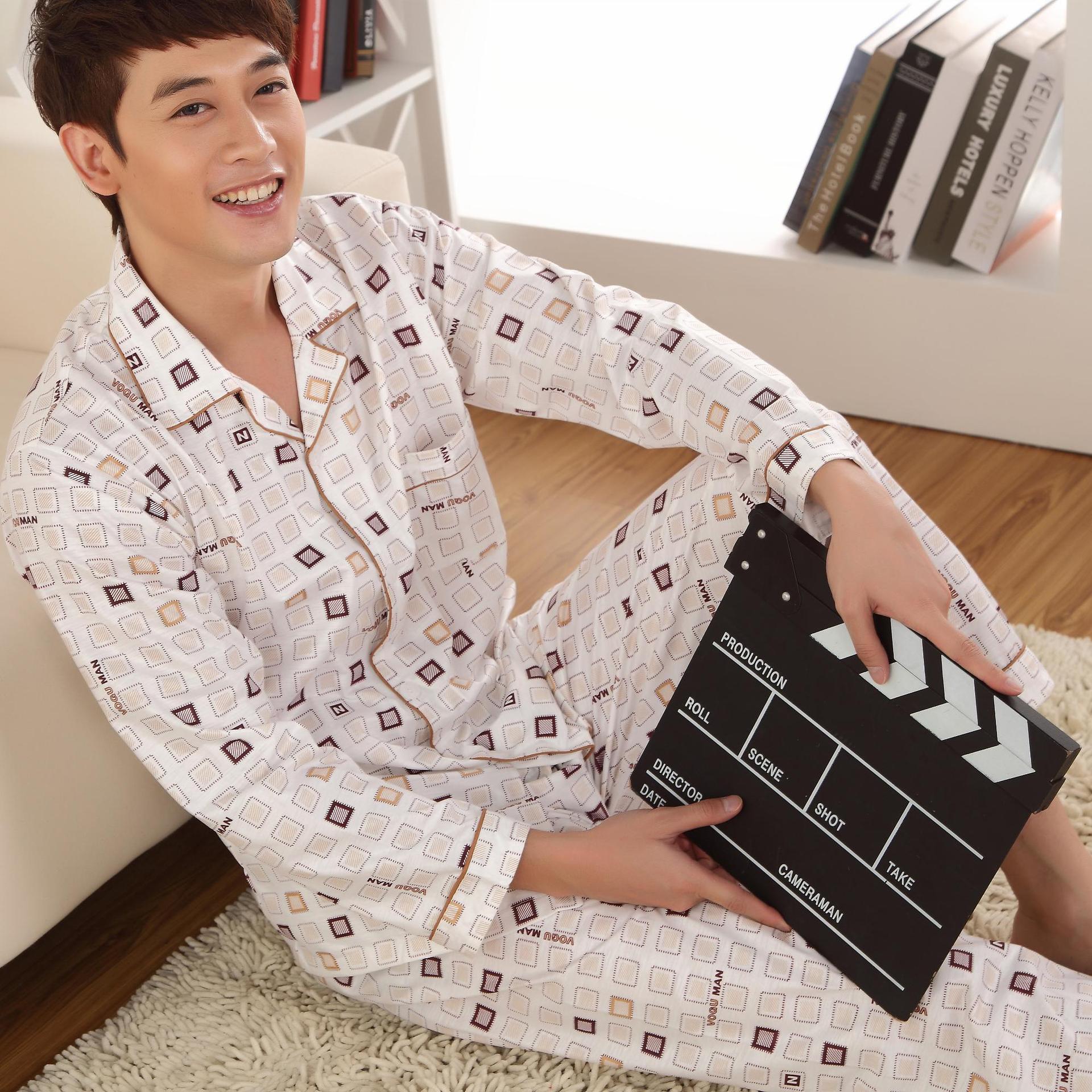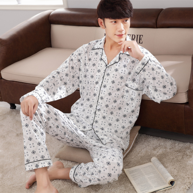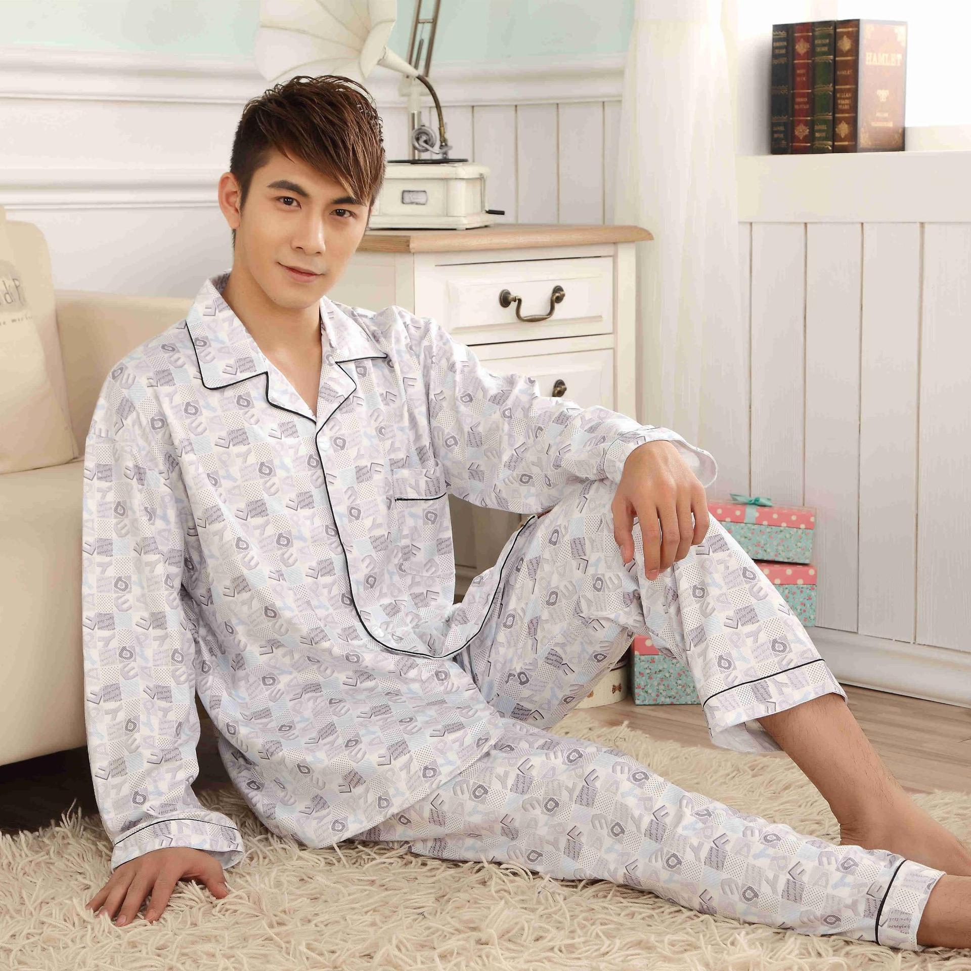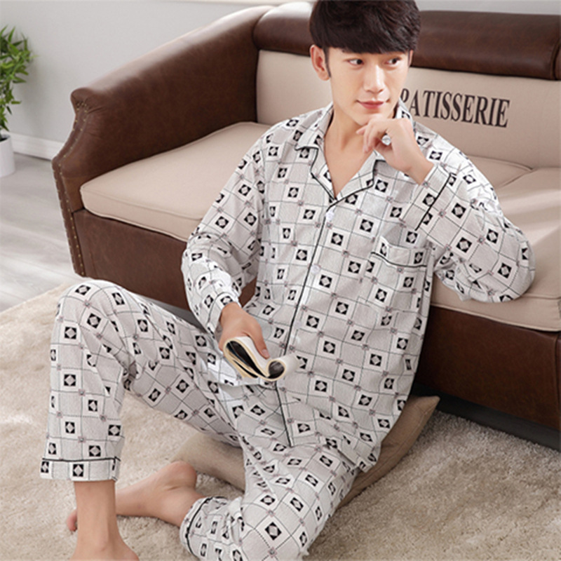 新品睡衣男士春秋冬季新款长袖长裤开衫翻领套装针织棉休闲家居服