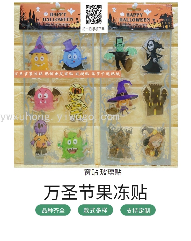 窗贴它透明、是最新的装饰产品,环保无毒,用它来装饰你的环境点缀你的生活;此产品造型新异、款式丰富可贴于任何光滑物体表面,可在玻璃,镜子,电脑,等表面任意的发挥创意,美化生活。它易于剥离和重复使用。目前已有适合圣诞节、情人节、万圣节、等各种节日的产品。 警告:不得作为3岁以下的小孩子的玩具。不可食用产品规格:30.5*15cm 包装:每个OPP袋装 特性:质地细腻,色彩逼真,立体感超强。可贴在手机、文具盒、电脑、墙上、玻璃上、家具上、瓷砖等相关介质。也可用于幼儿园小朋友的奖励贴和玩耍的小玩具
