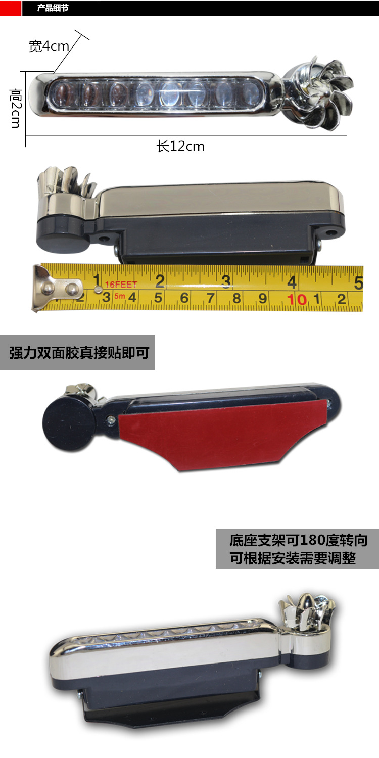 (注意:车 主朋友们,用嘴轻轻一吹,就可以亮,这个最能证明的就是灯是没有质量问题的。装在车上不亮,先了解它的原理:风带动风扇转动,风扇转动带动马达发电,马达 产生电能使灯发光。行驶的时候,灯不亮,只有一个原因,风扇的转速不够,不能带动马达发电,安装时请将风扇方向对准正迎风的方向,并尽量向外,不要装到中 网里面去了,越容易吹到风越好,万一出现灯不亮的情况,请调节风扇方向和风力灯的安装位置再次尝试)