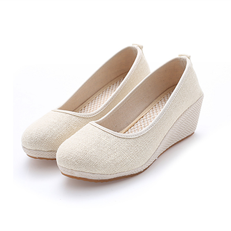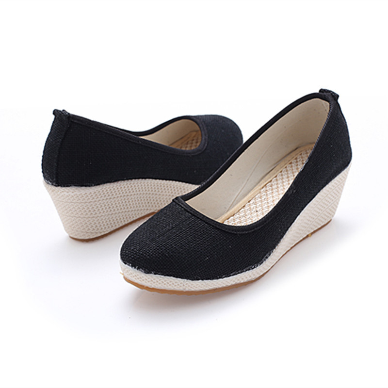 老北京布鞋绣花鞋亚麻高跟牛筋底纯黑白色护士鞋工作鞋女春秋单鞋