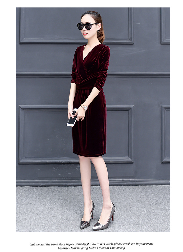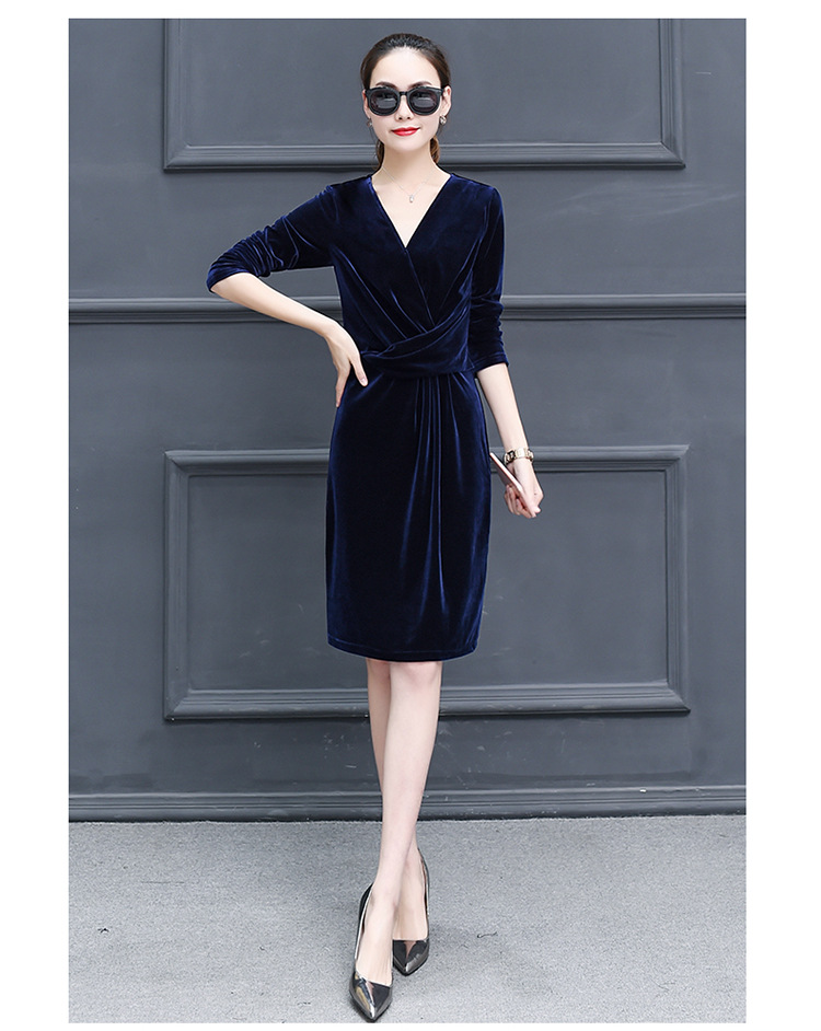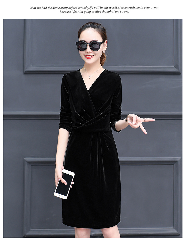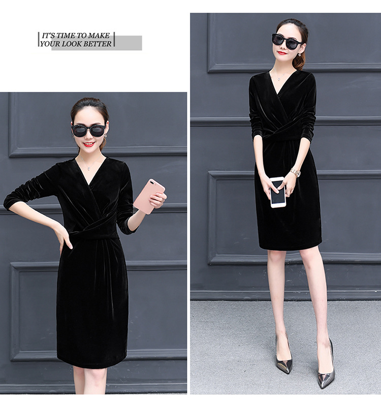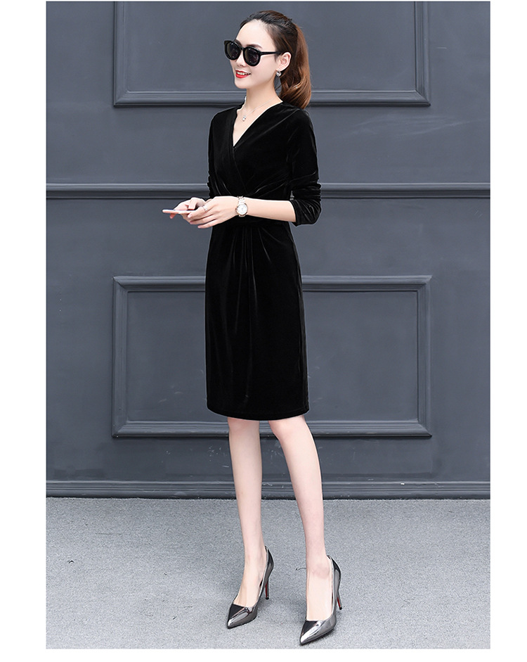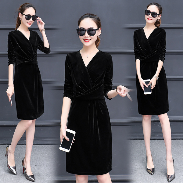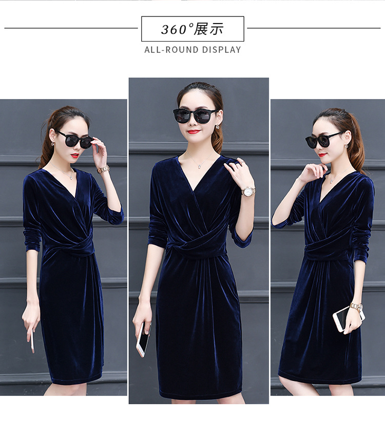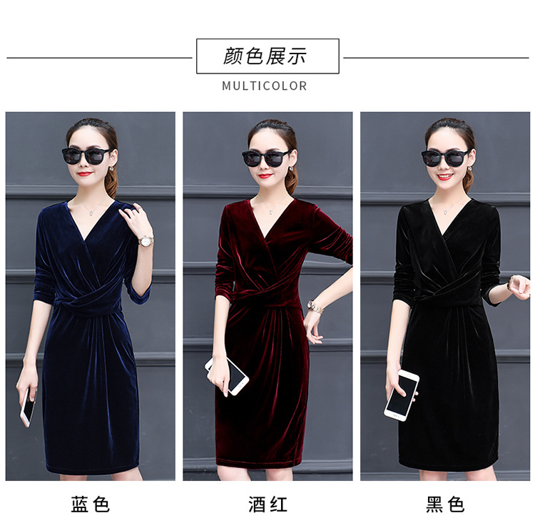 现货供应女装修身显瘦长袖金丝绒秋冬V领连衣裙连身裙子