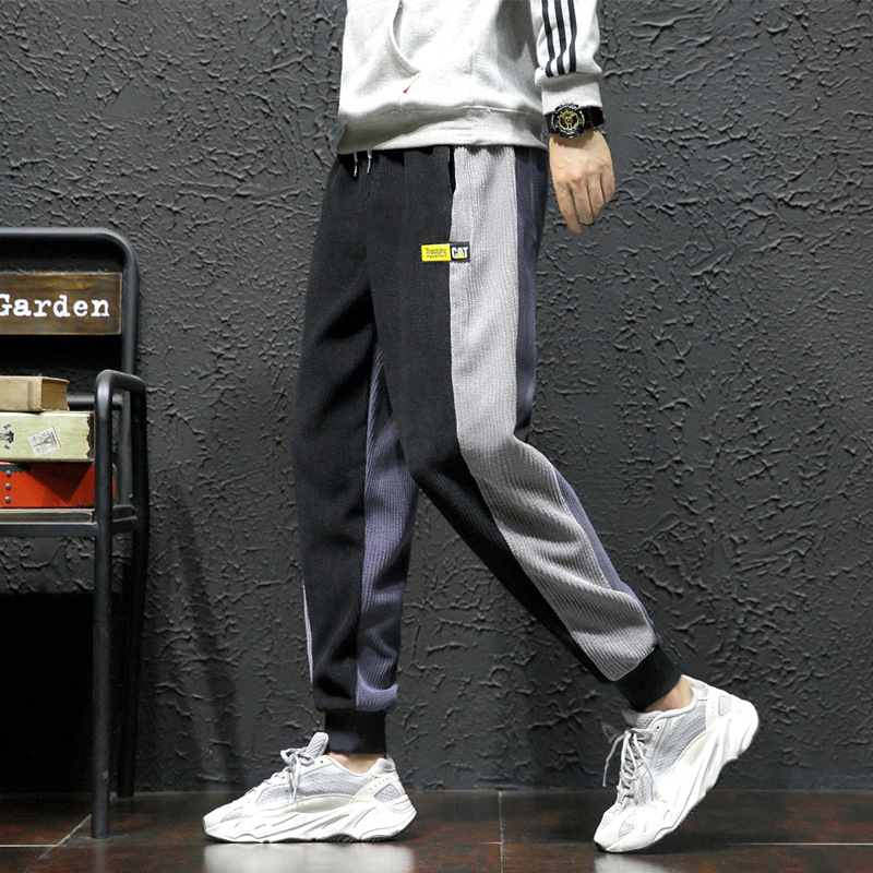 港风秋季大码宽松灯芯绒休闲裤韩版潮流男士条纹拼接束脚九分裤