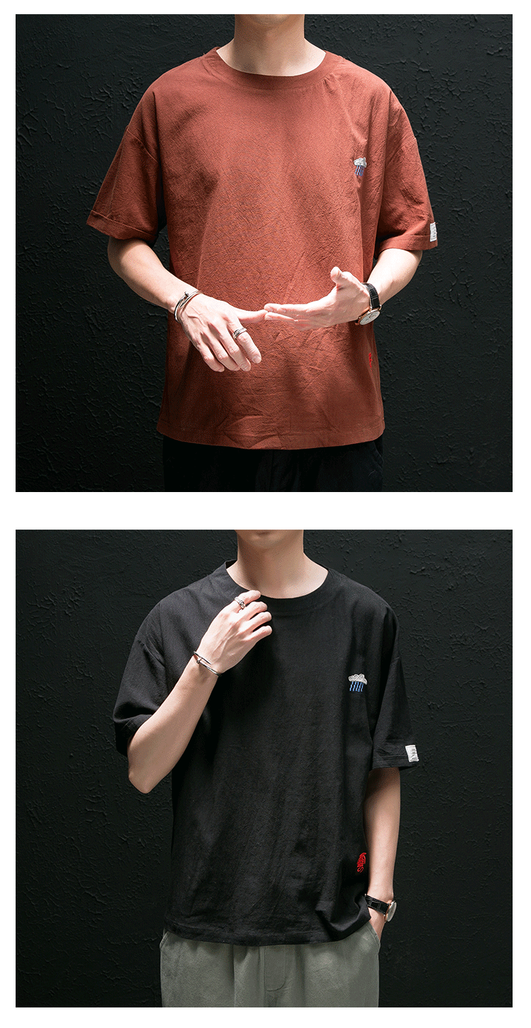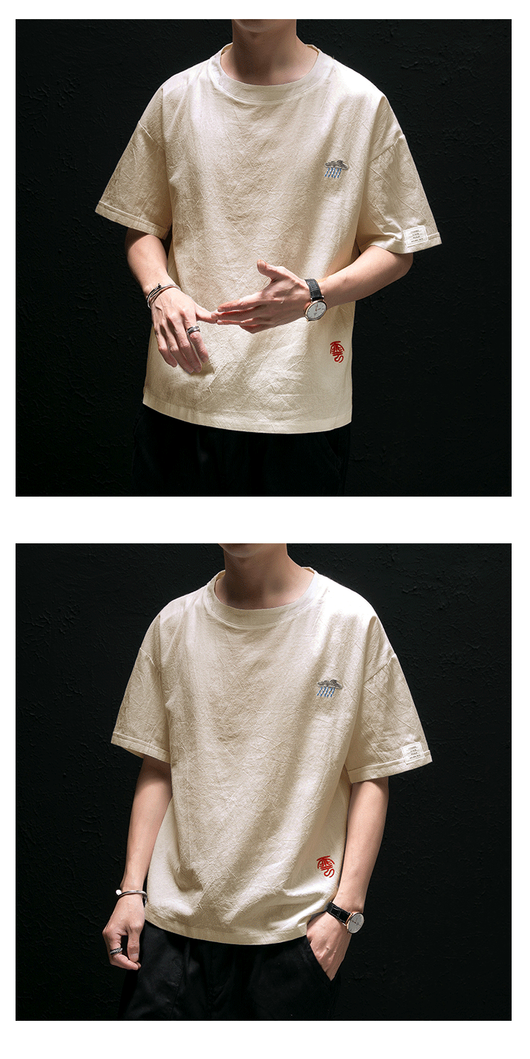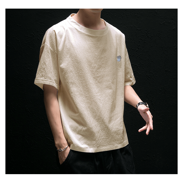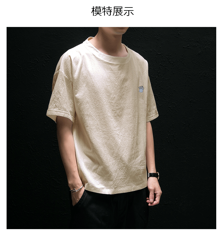 亚麻短袖T恤男夏季刺绣纯色薄款棉麻宽松大码男装圆领体恤上衣潮t