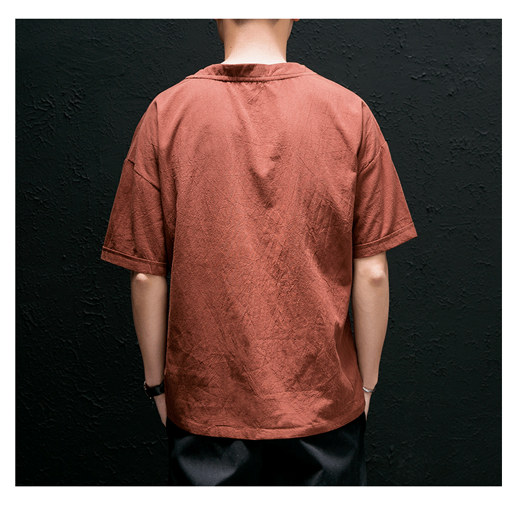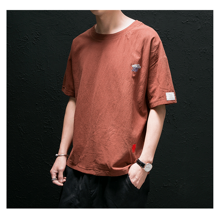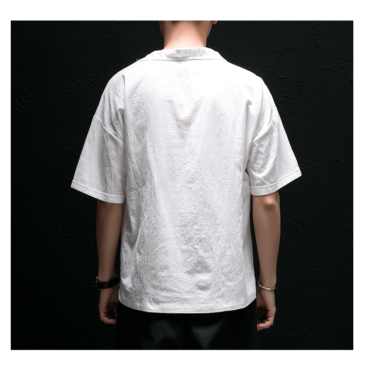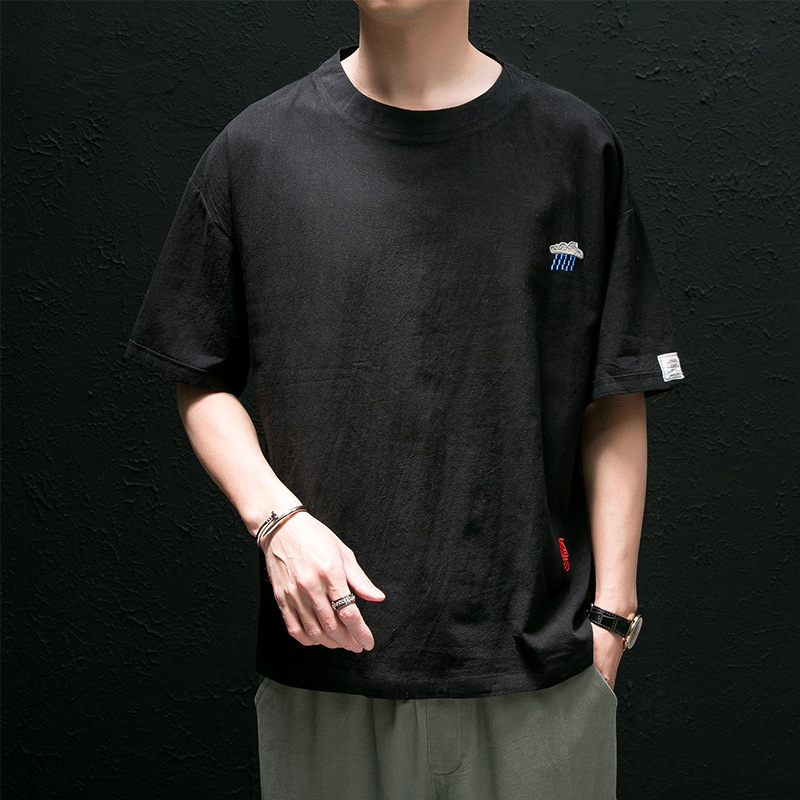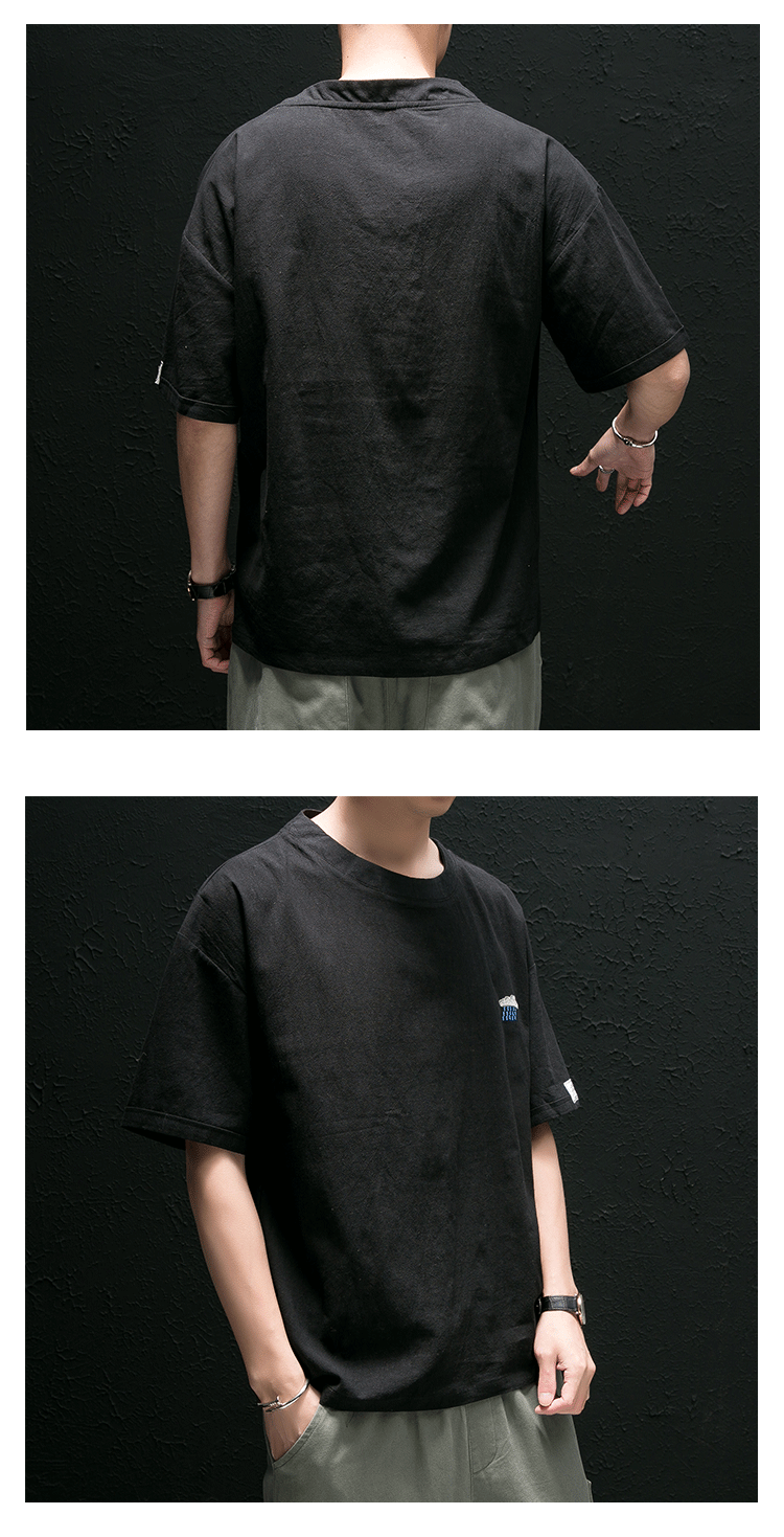 亚麻短袖T恤男夏季刺绣纯色薄款棉麻宽松大码男装圆领体恤上衣潮t