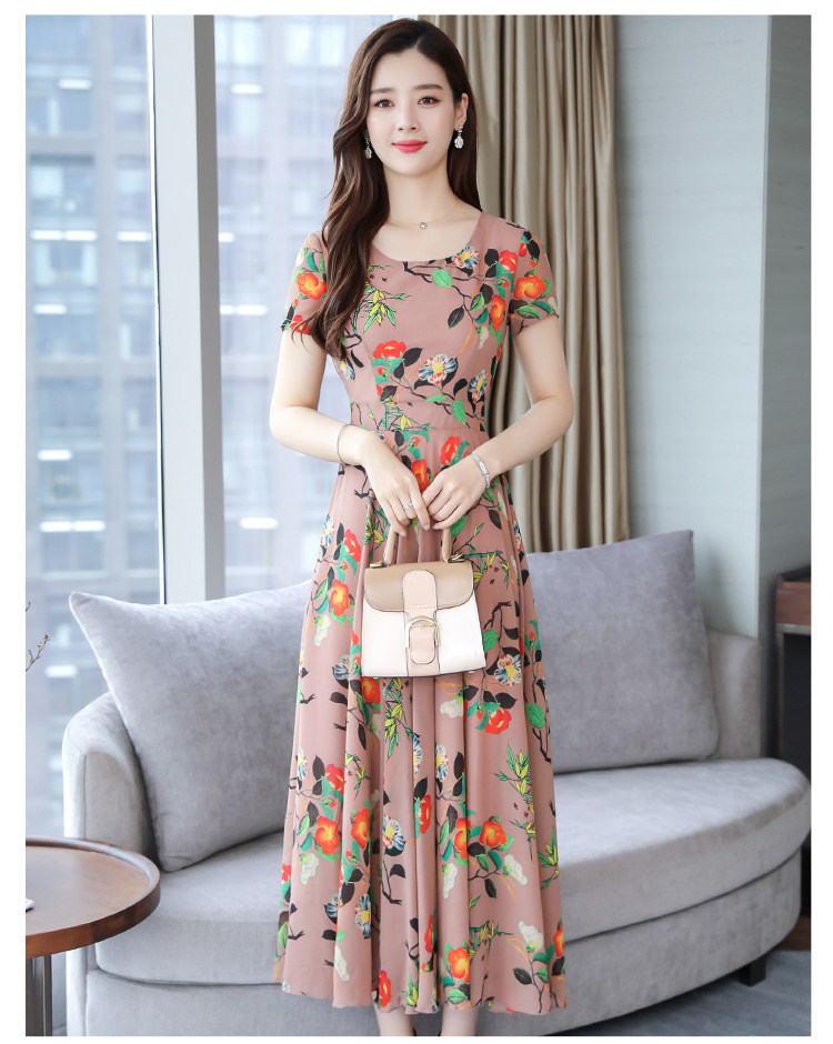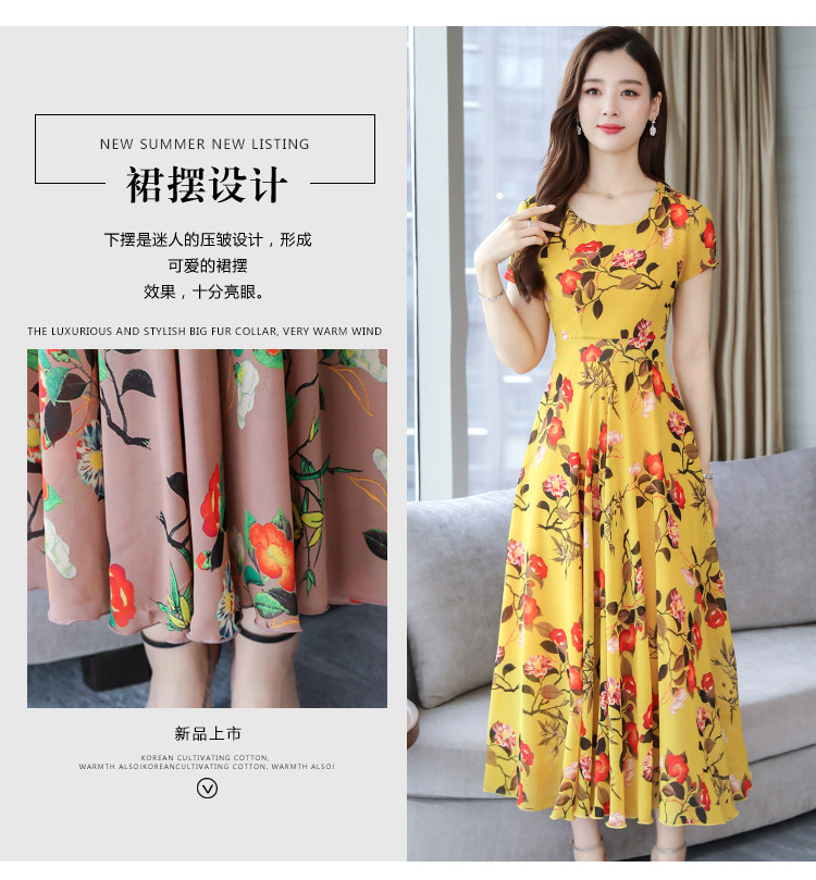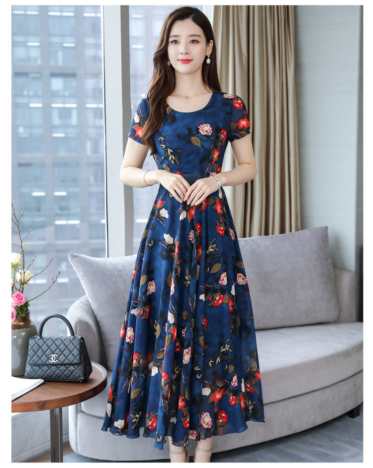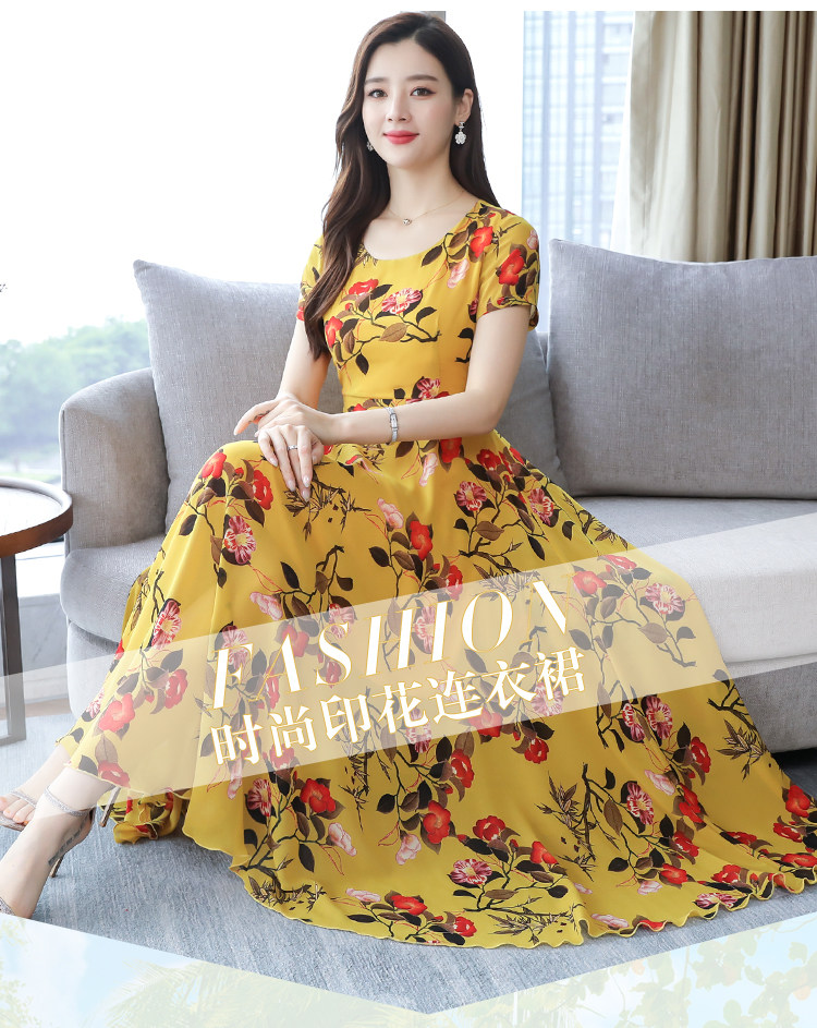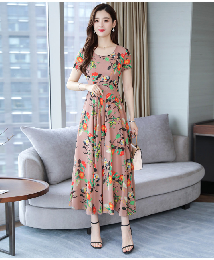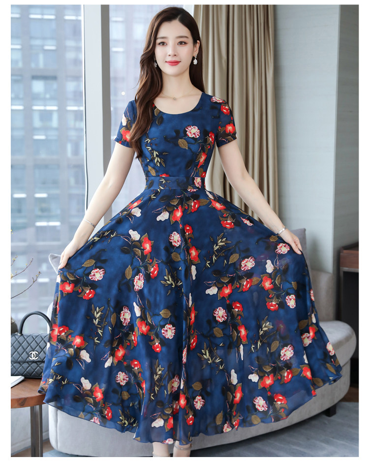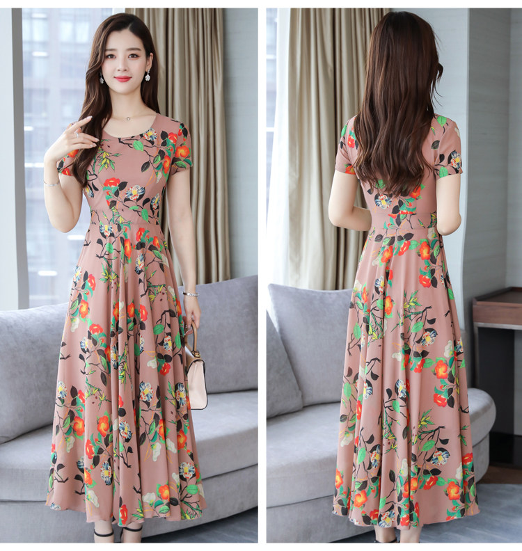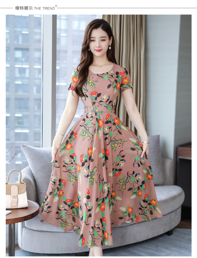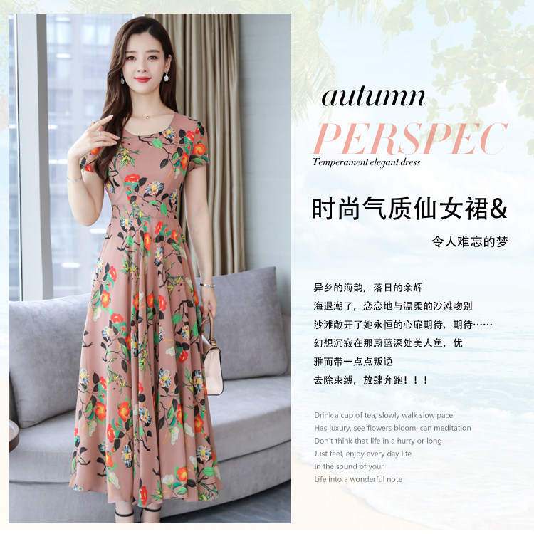 碎花大摆过膝显瘦超仙流行长裙圆领短袖显瘦女长连衣裙