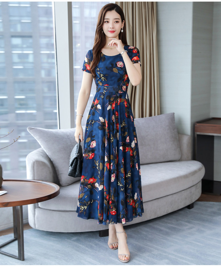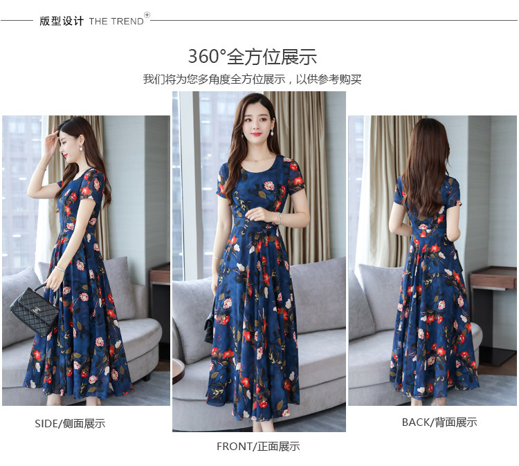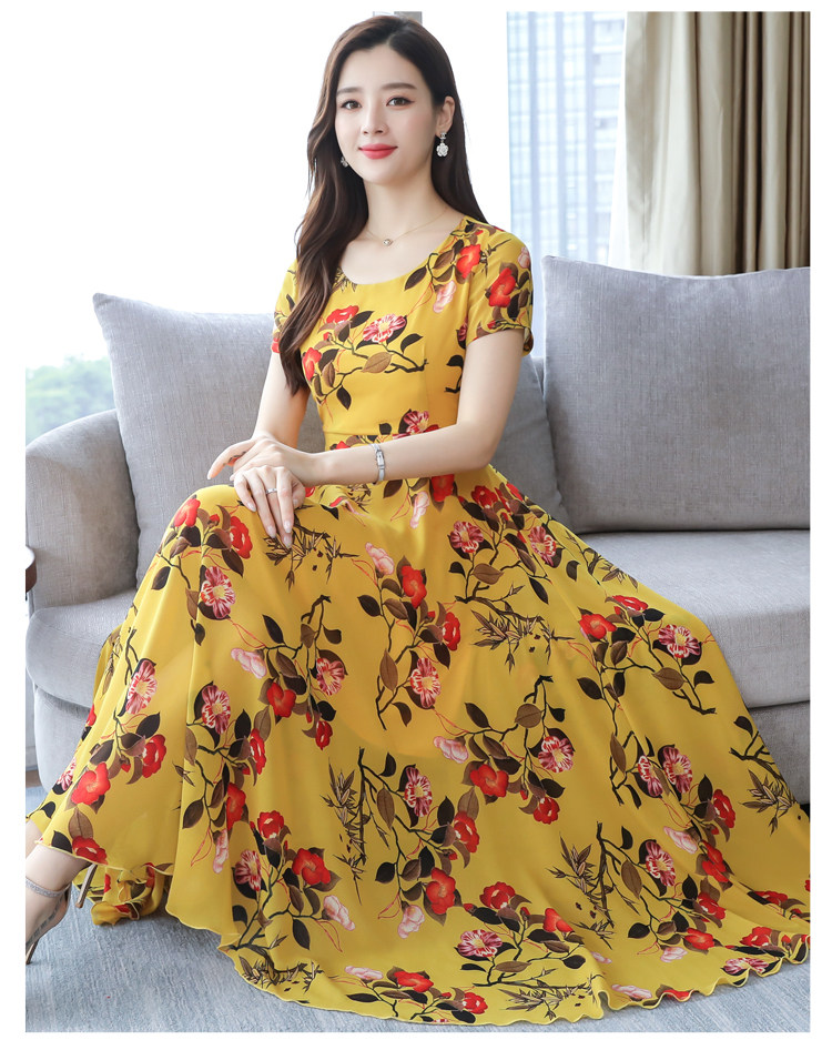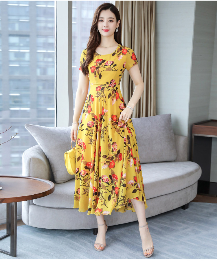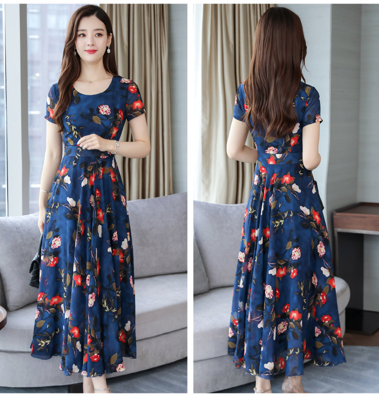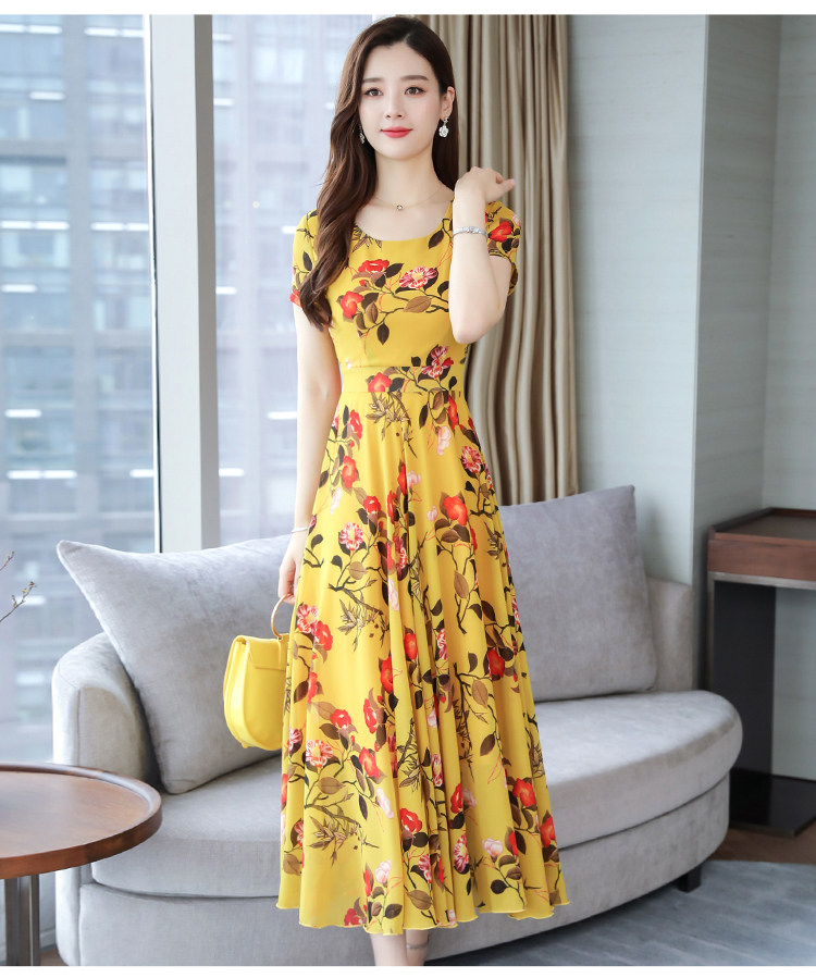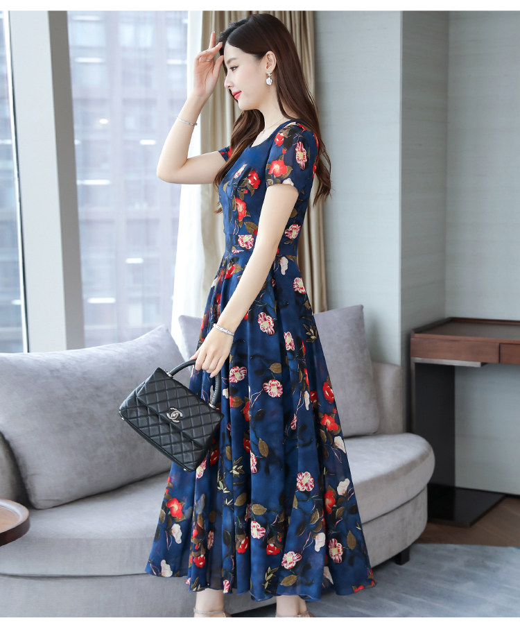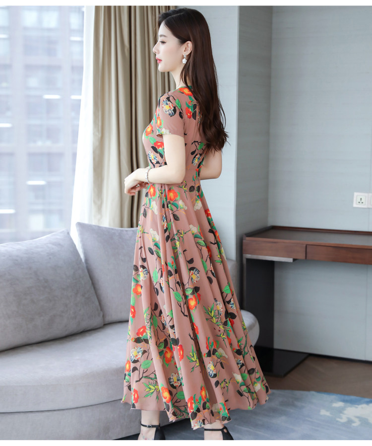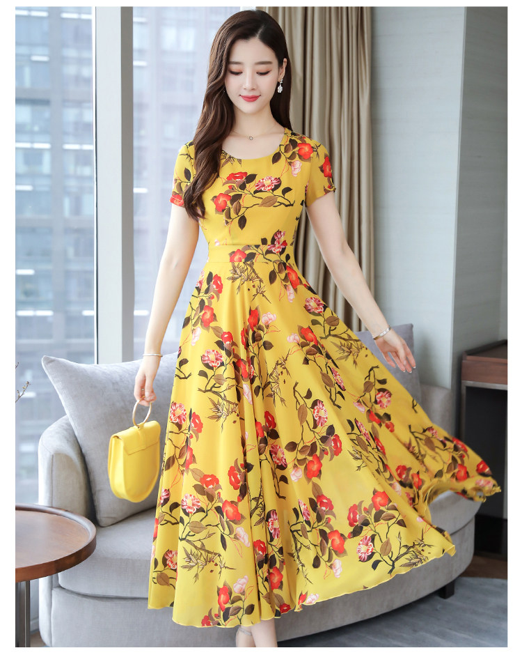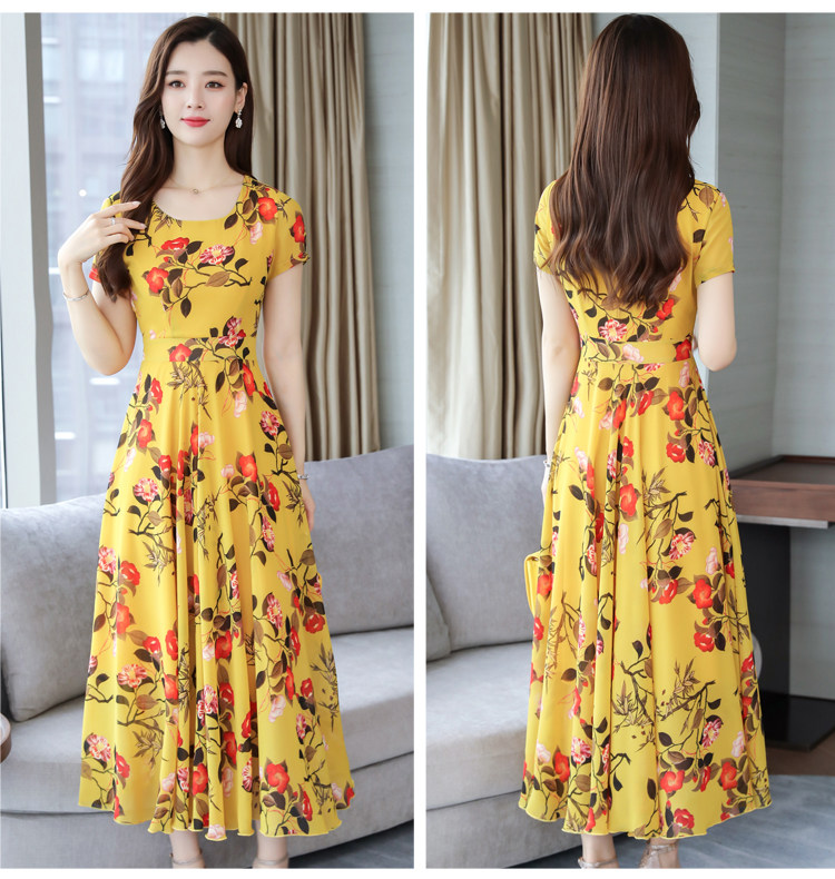 碎花大摆过膝显瘦超仙流行长裙圆领短袖显瘦女长连衣裙