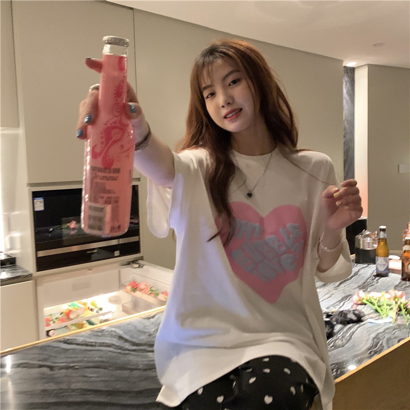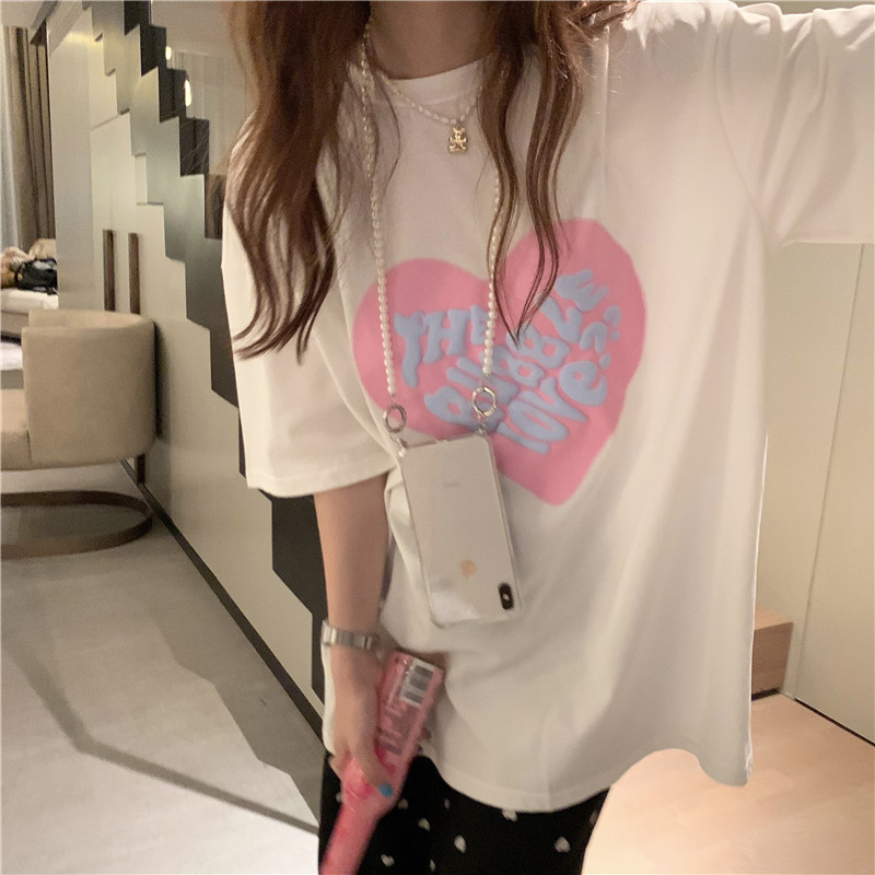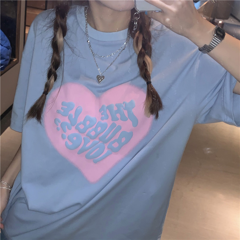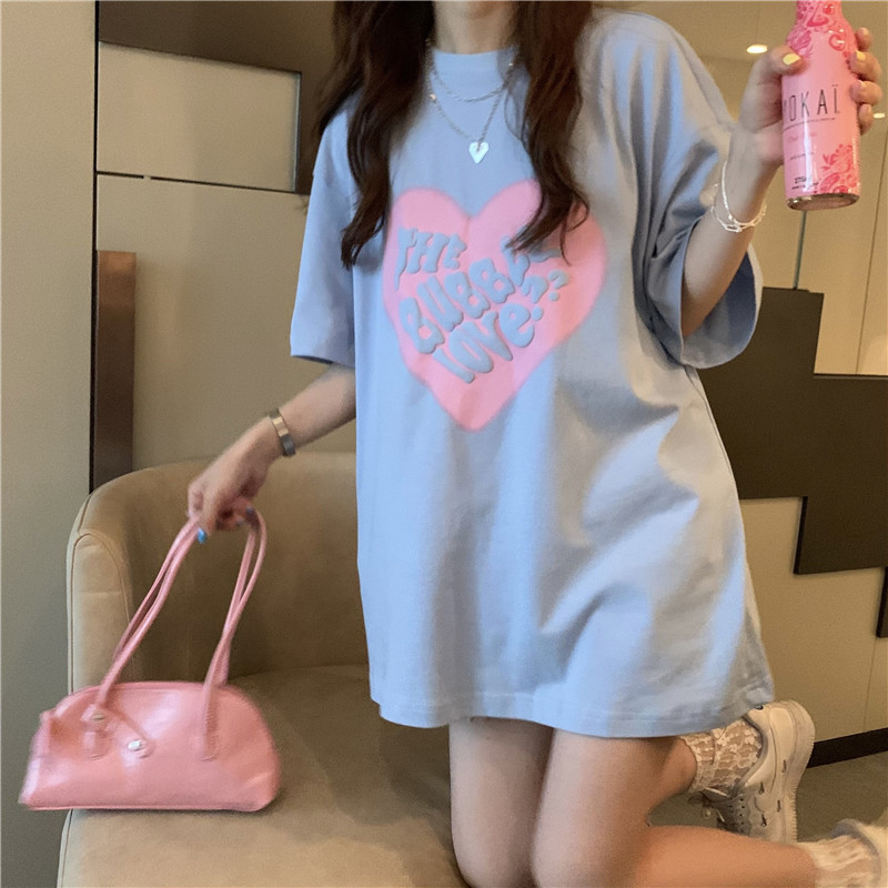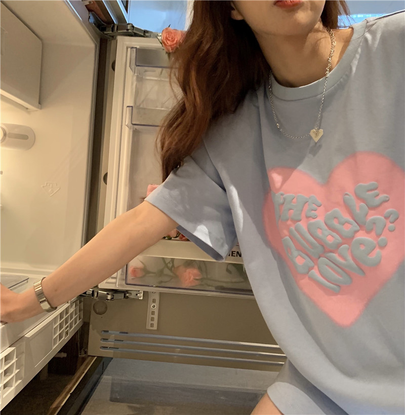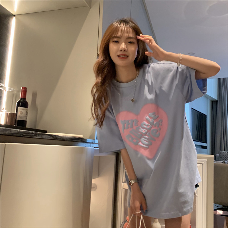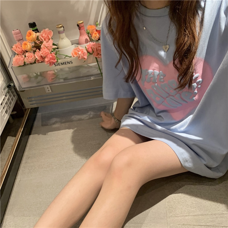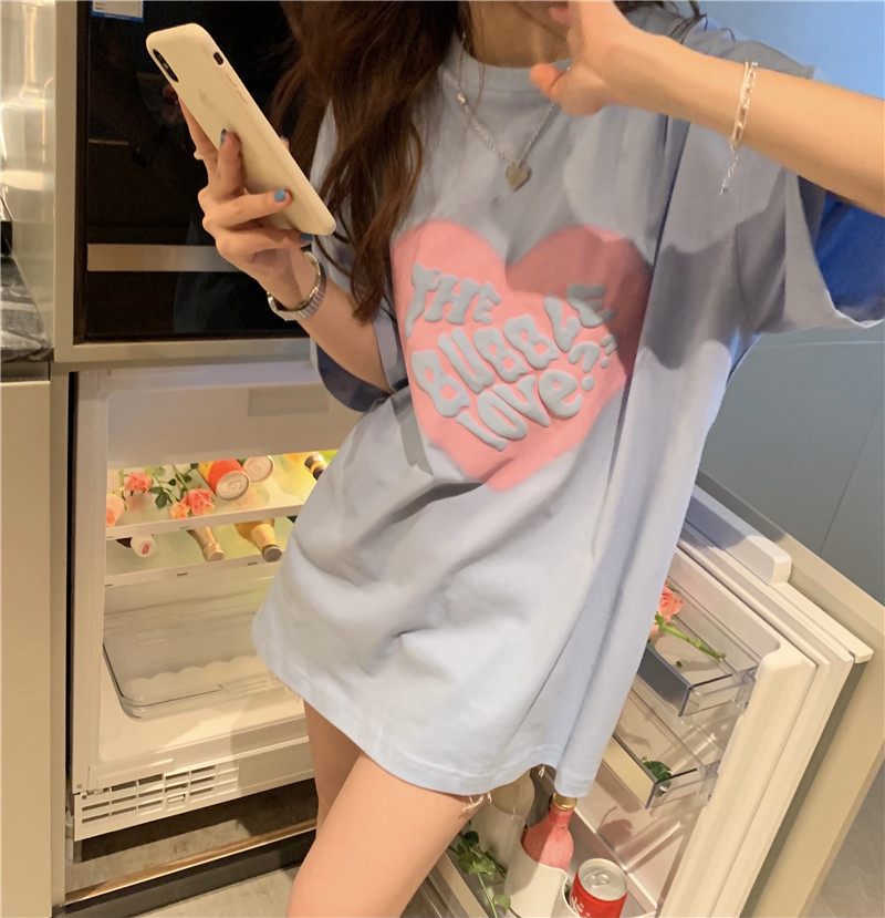 夏季棉质上衣中长款宽松爱心发泡印花短袖T恤女打底衫