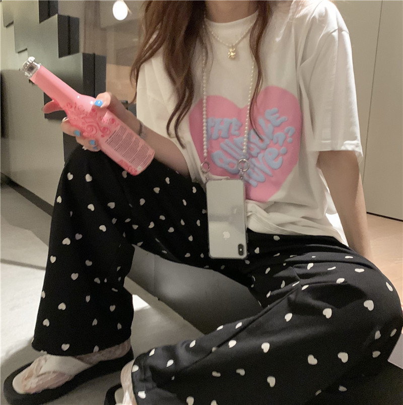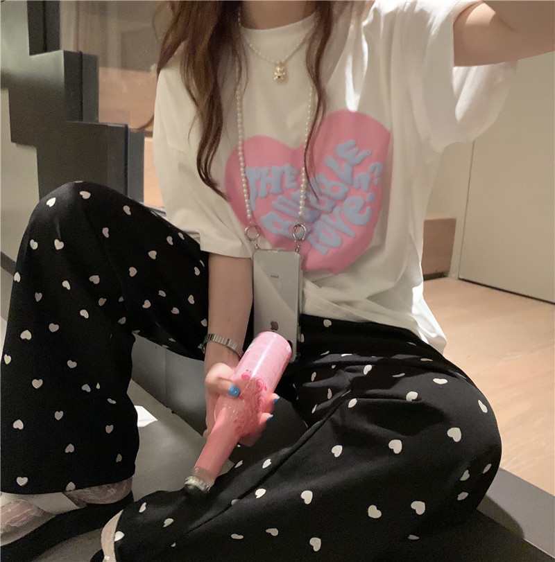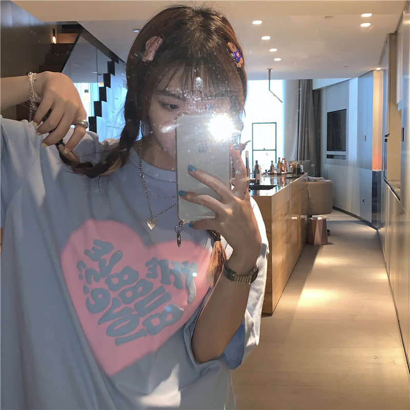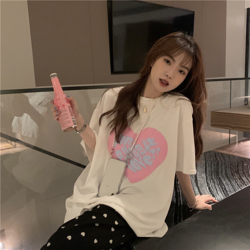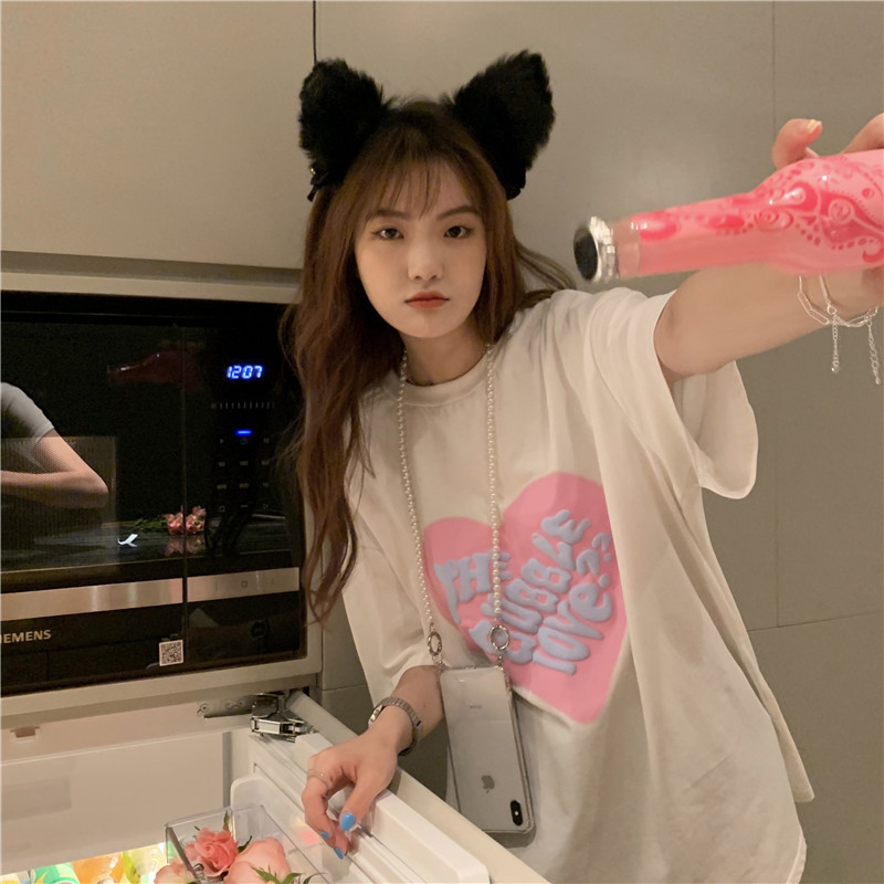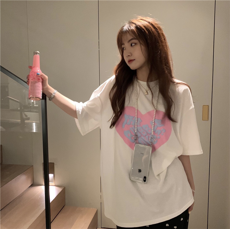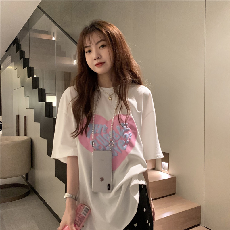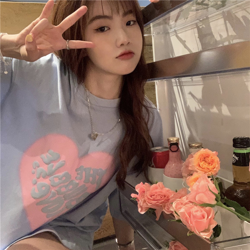 夏季棉质上衣中长款宽松爱心发泡印花短袖T恤女打底衫