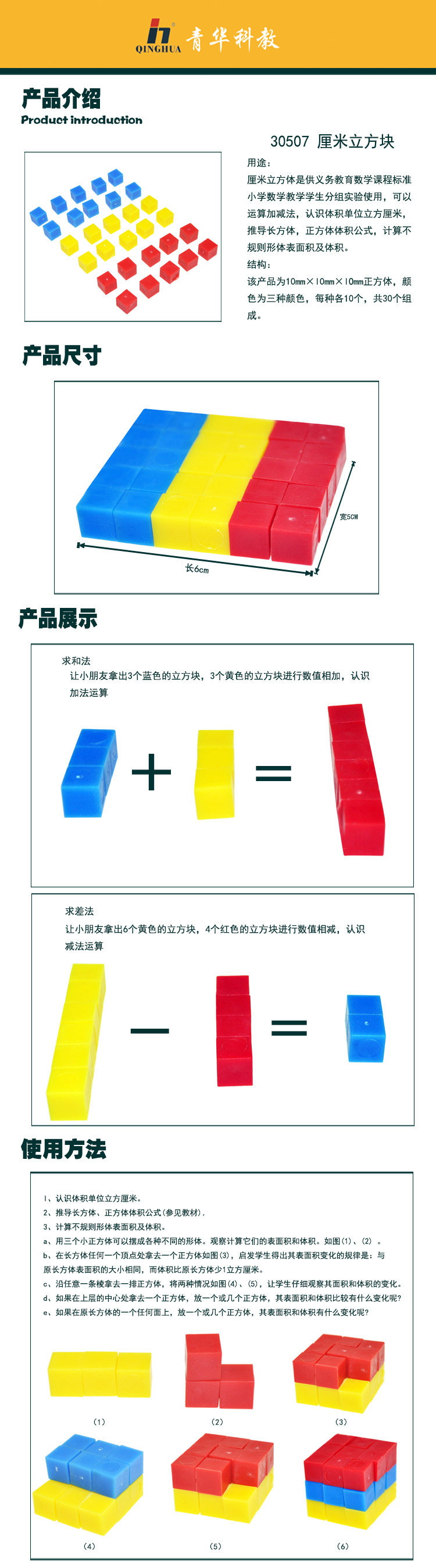 三色蒙氏正方体积木 1CM厘米立方块几何立方体 小学数学教具仪器