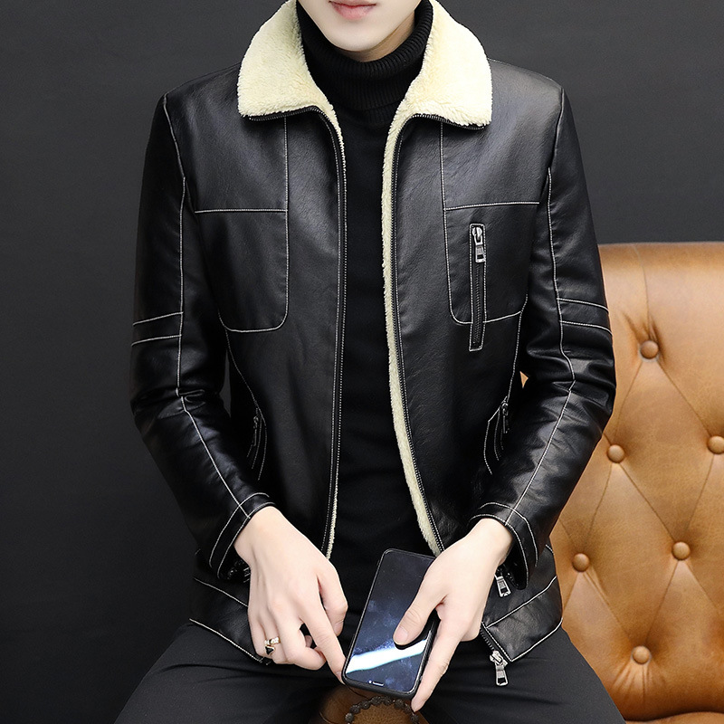 artificial leather coat men‘s fleece-lined thickened youth fur integrated fur lapel pu leather jacket lambswool coat winter