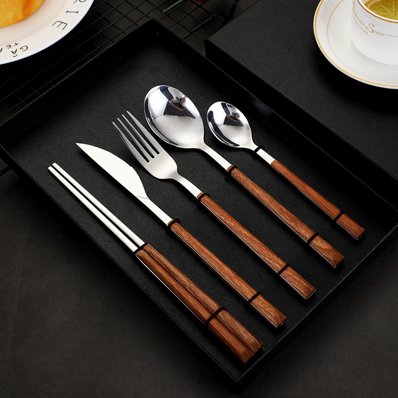 430仿木纹柄不锈钢刀叉勺西餐餐具套装日韩餐具四件套牛排刀筷子