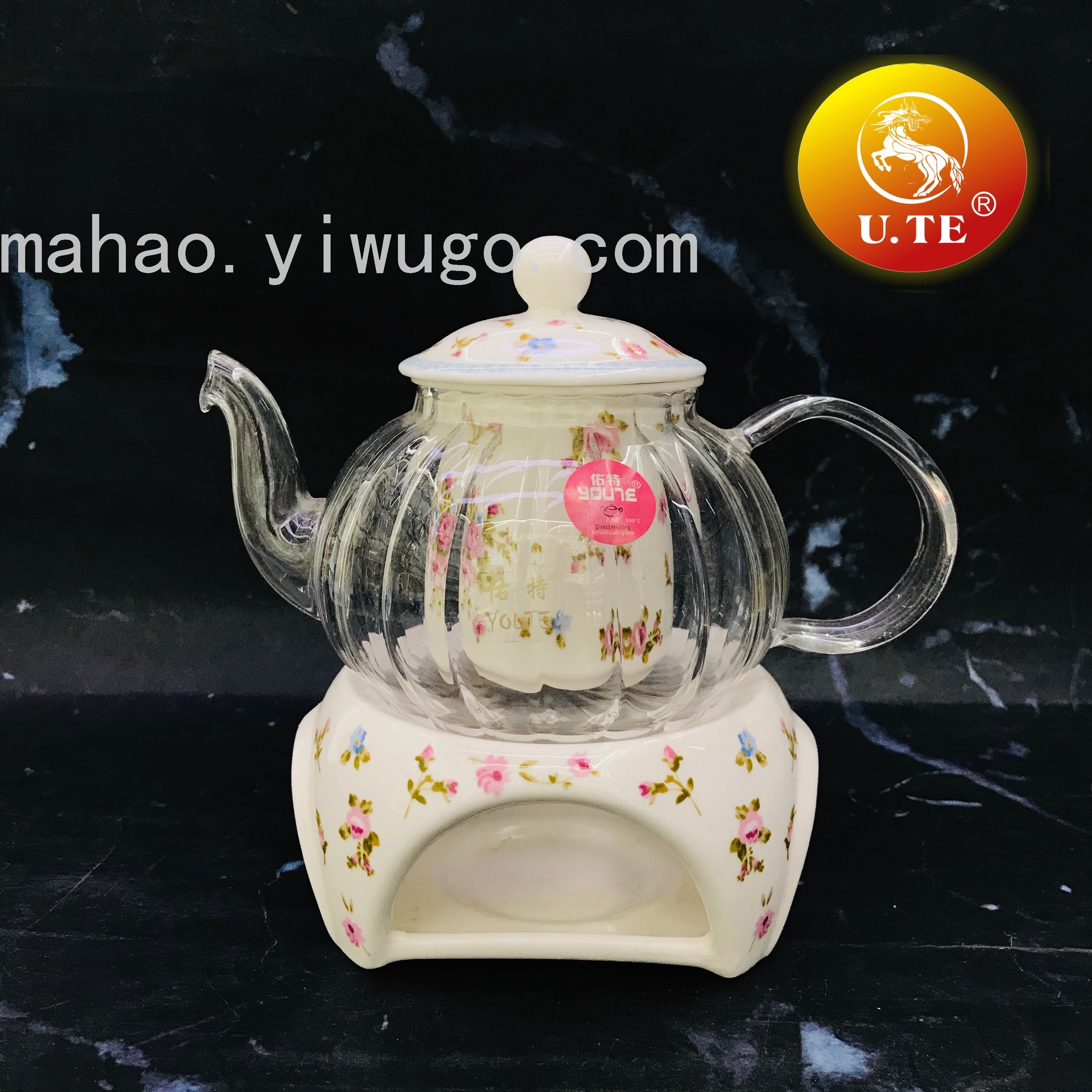 Ceramic Vertical Pattern Glass Flower Teapot Candle Heating Base Teapot