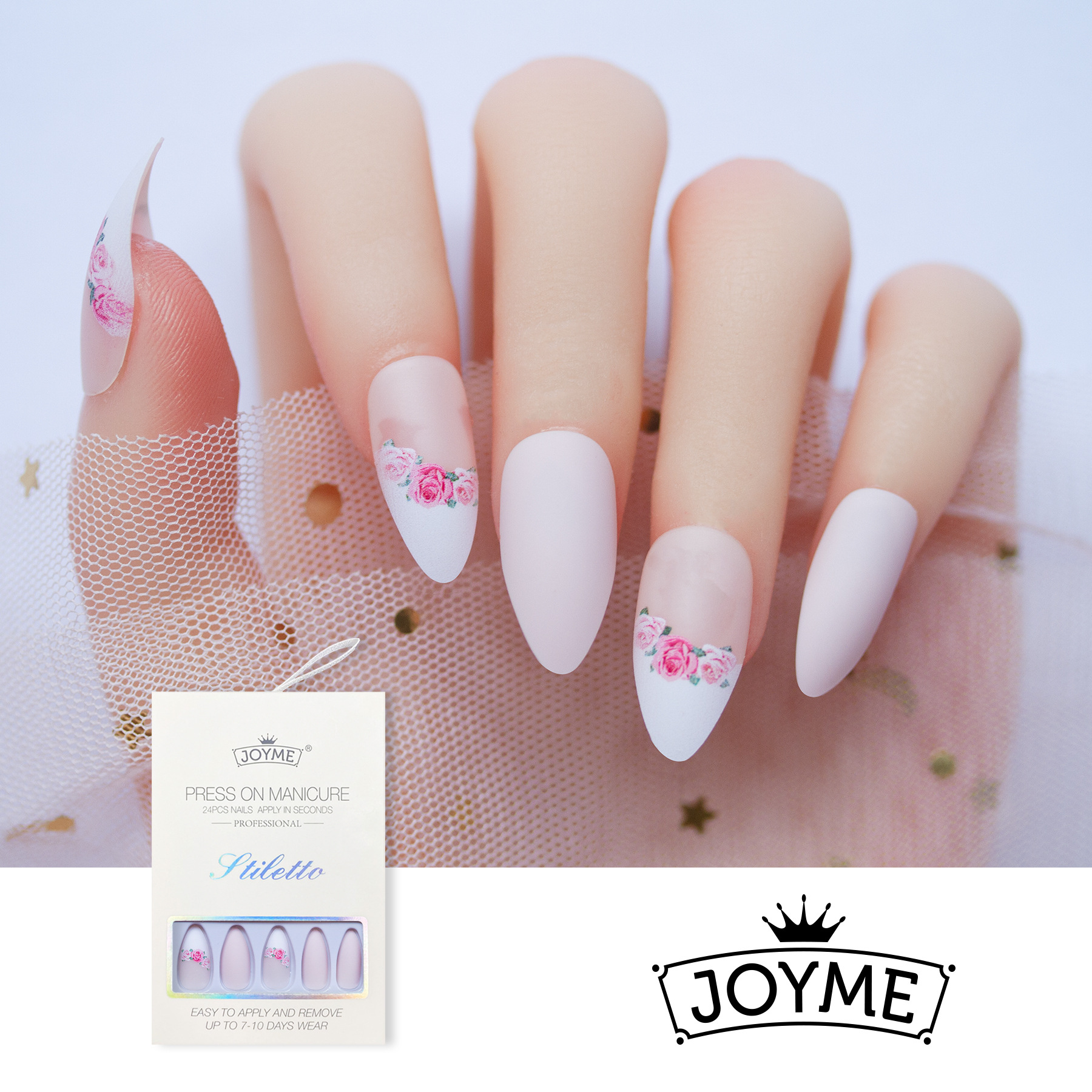 现货欧美假指甲尖头法式玫瑰甲片丝带挂空丝滑包装美甲贴片厂家