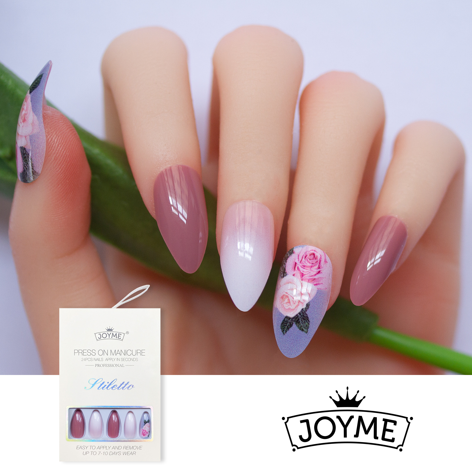 欧美热销24片尖头美甲丝带包装成品假指甲豆沙色玫瑰渐变穿戴甲