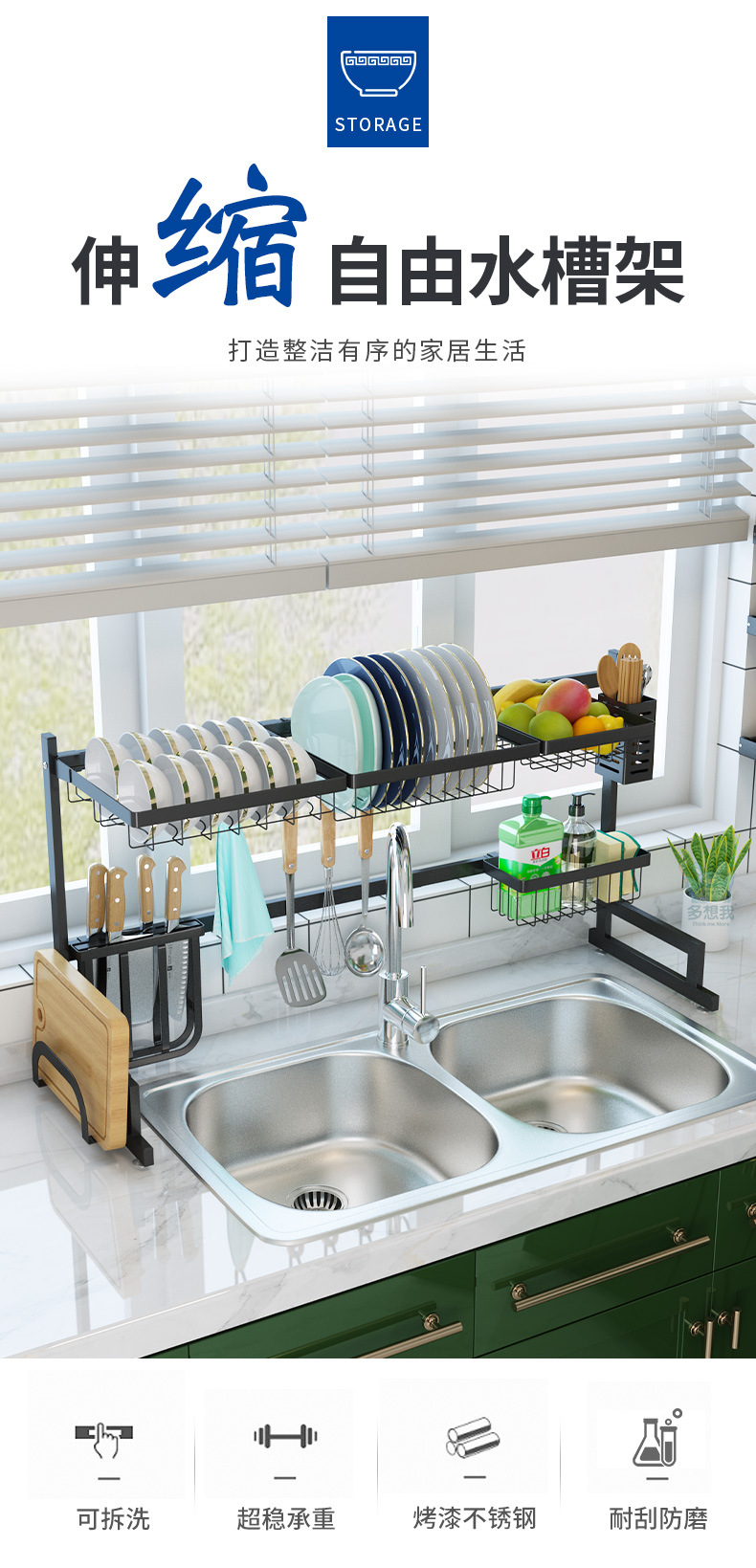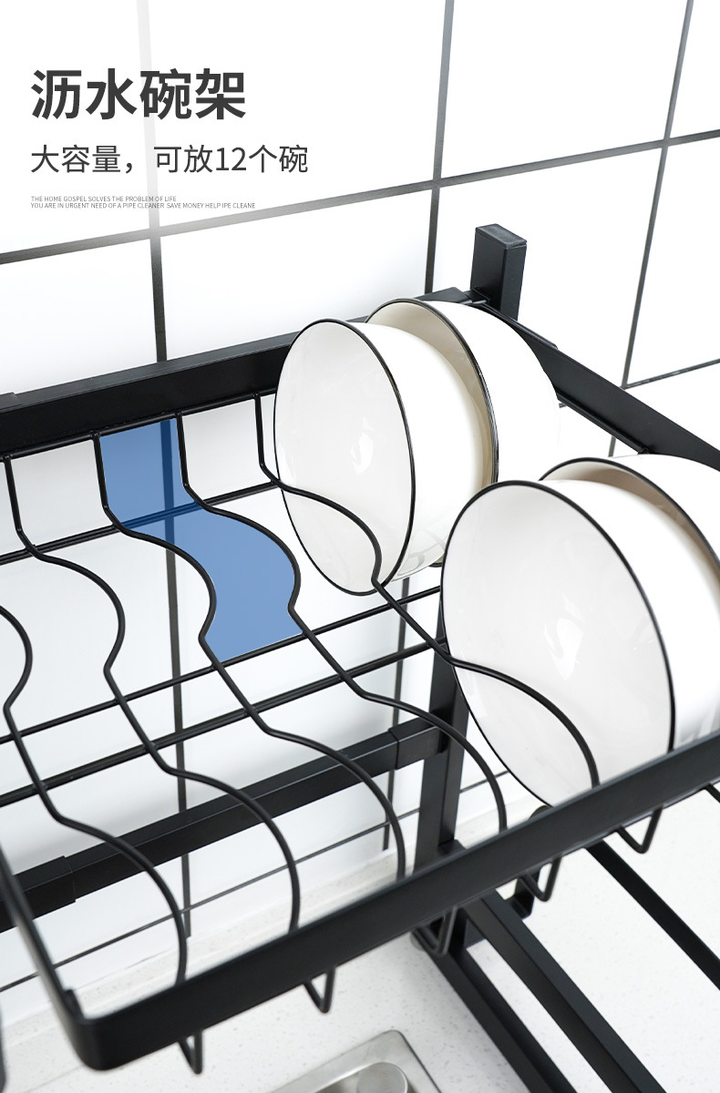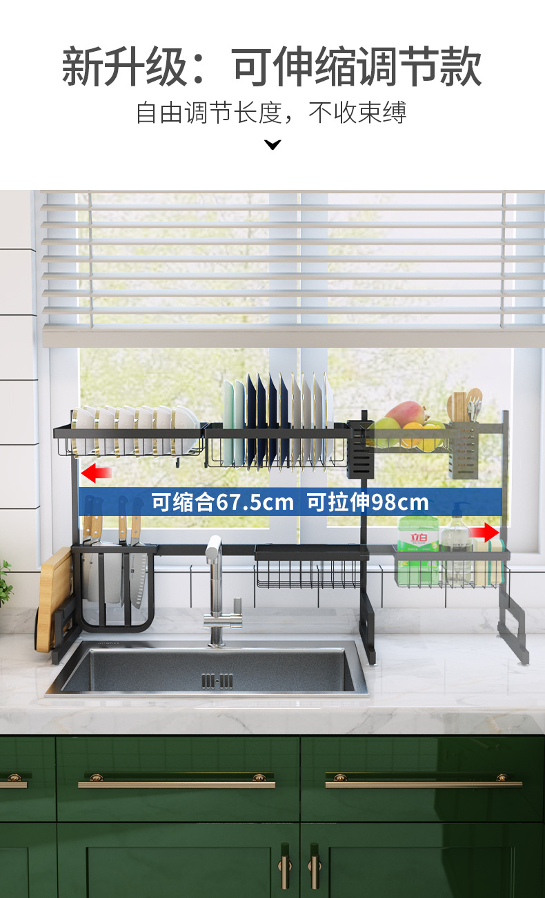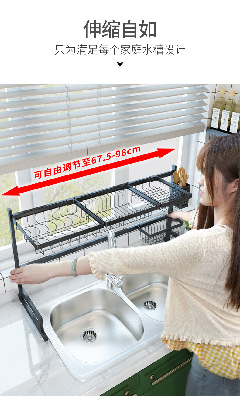 水槽上方置物架厨房伸缩黑色洗水池家用晾碗碟筷子刀具沥水收纳架