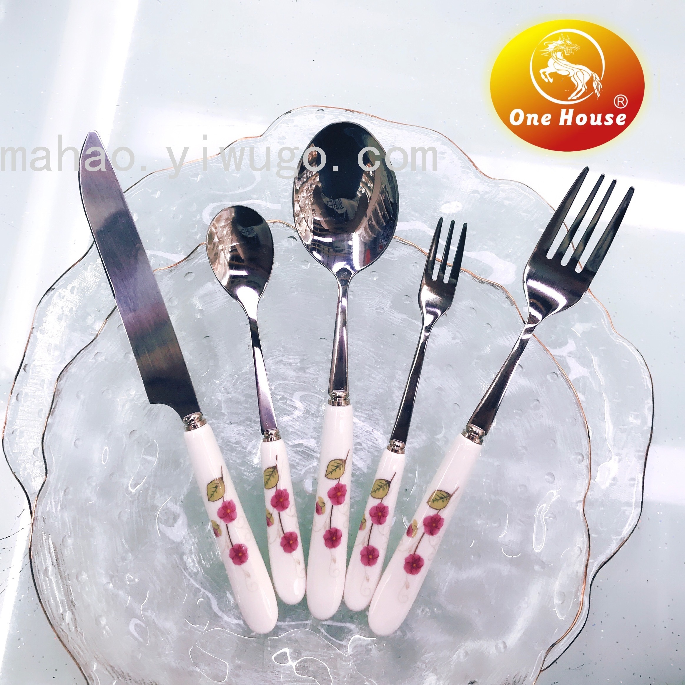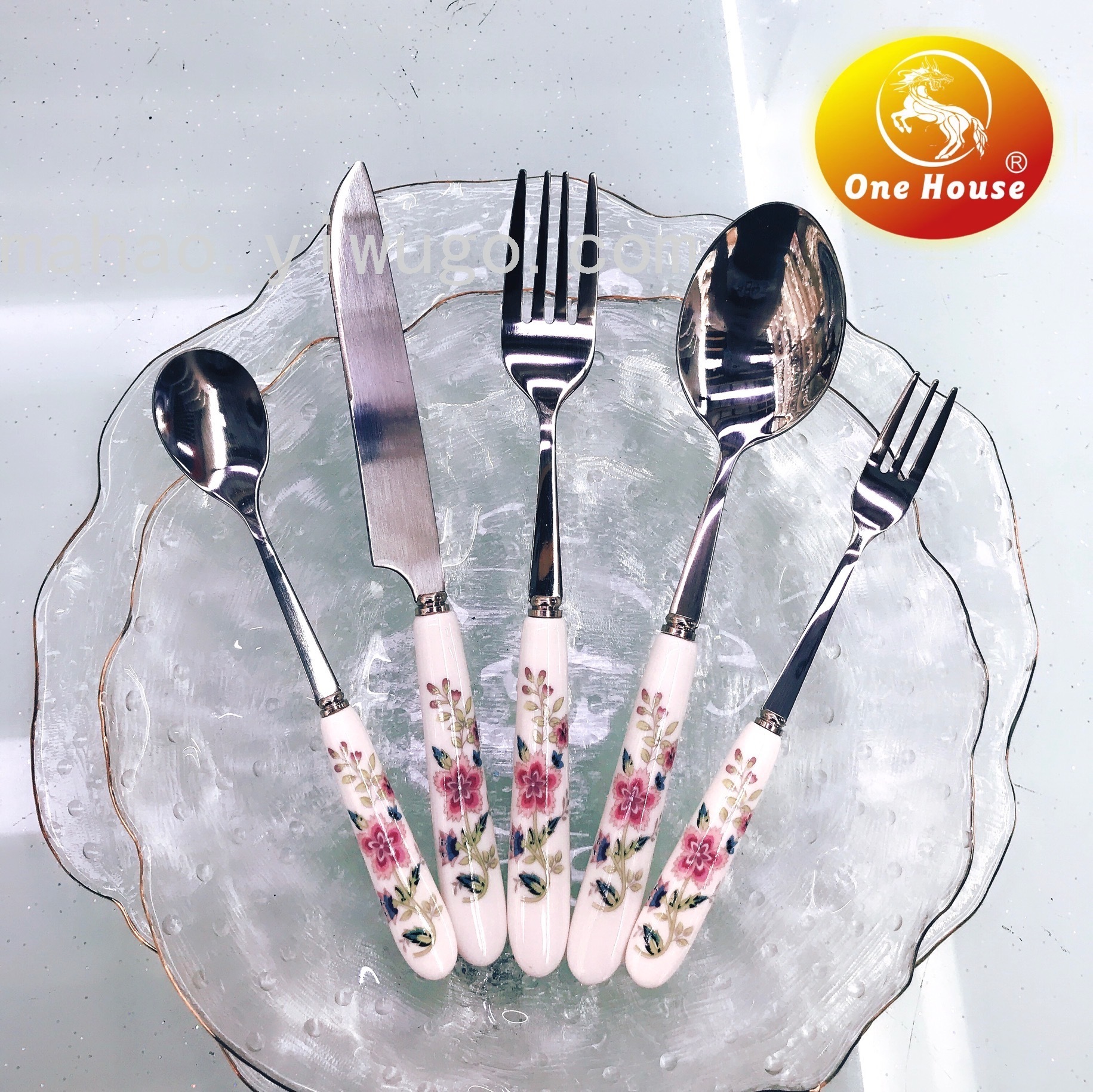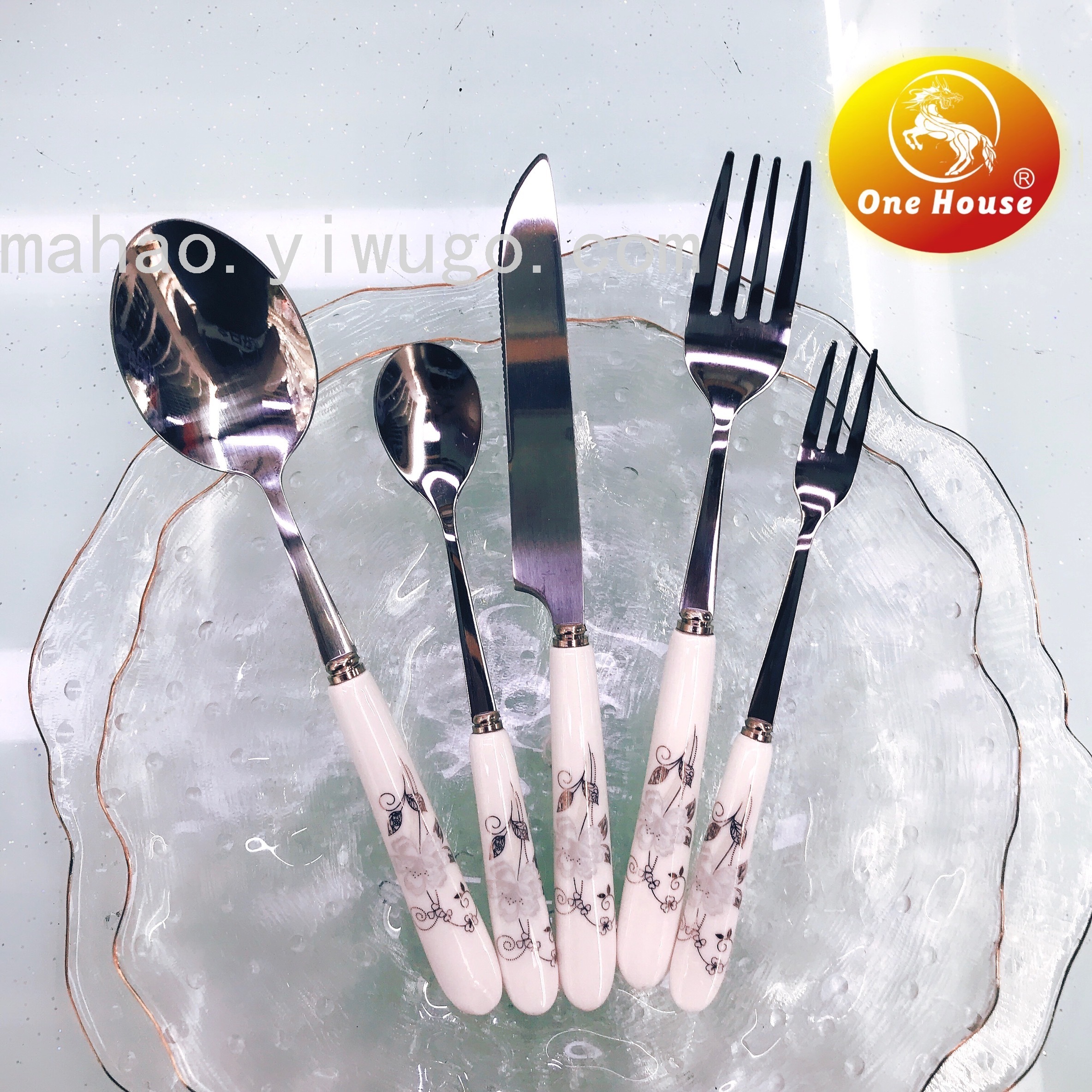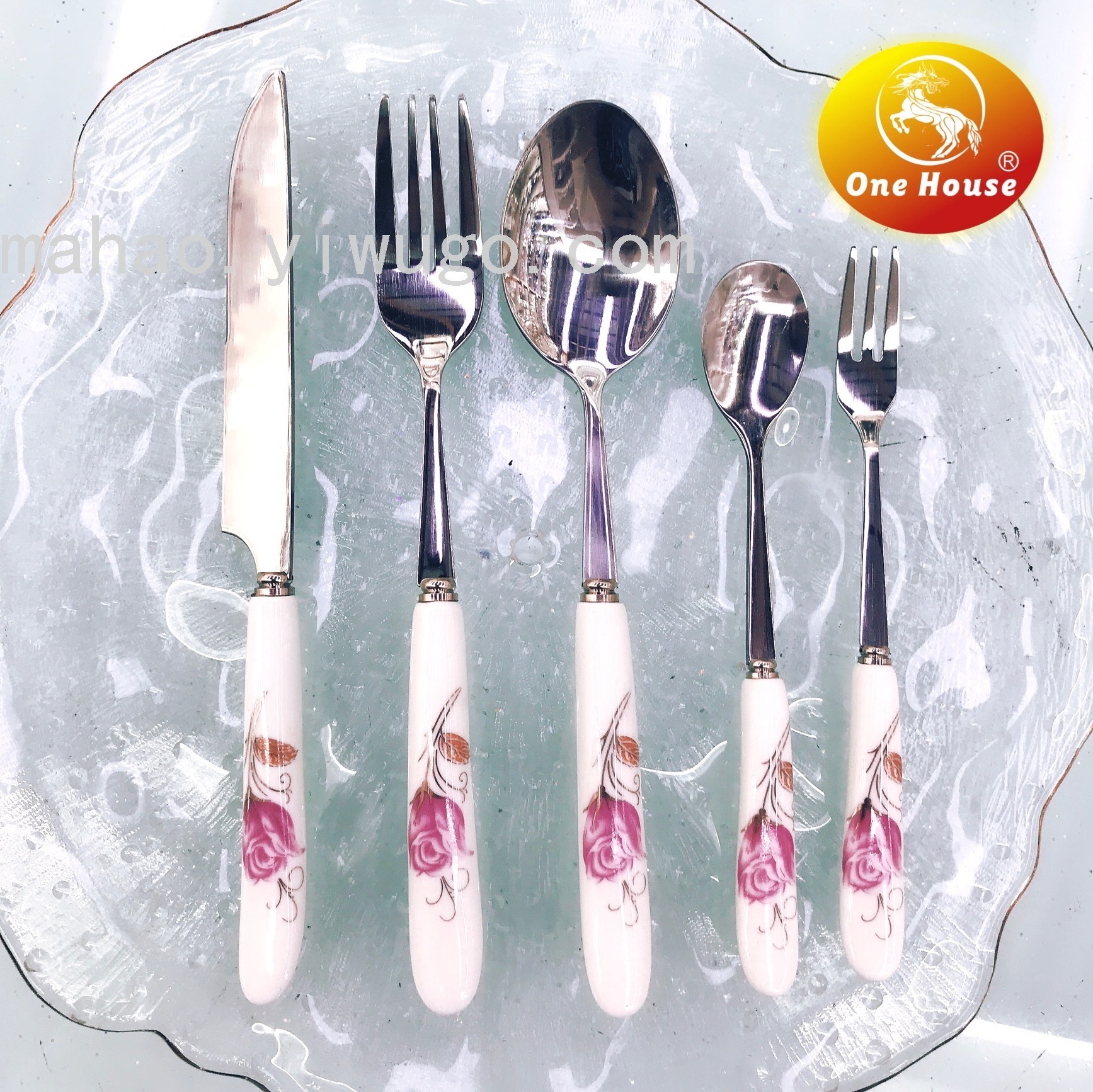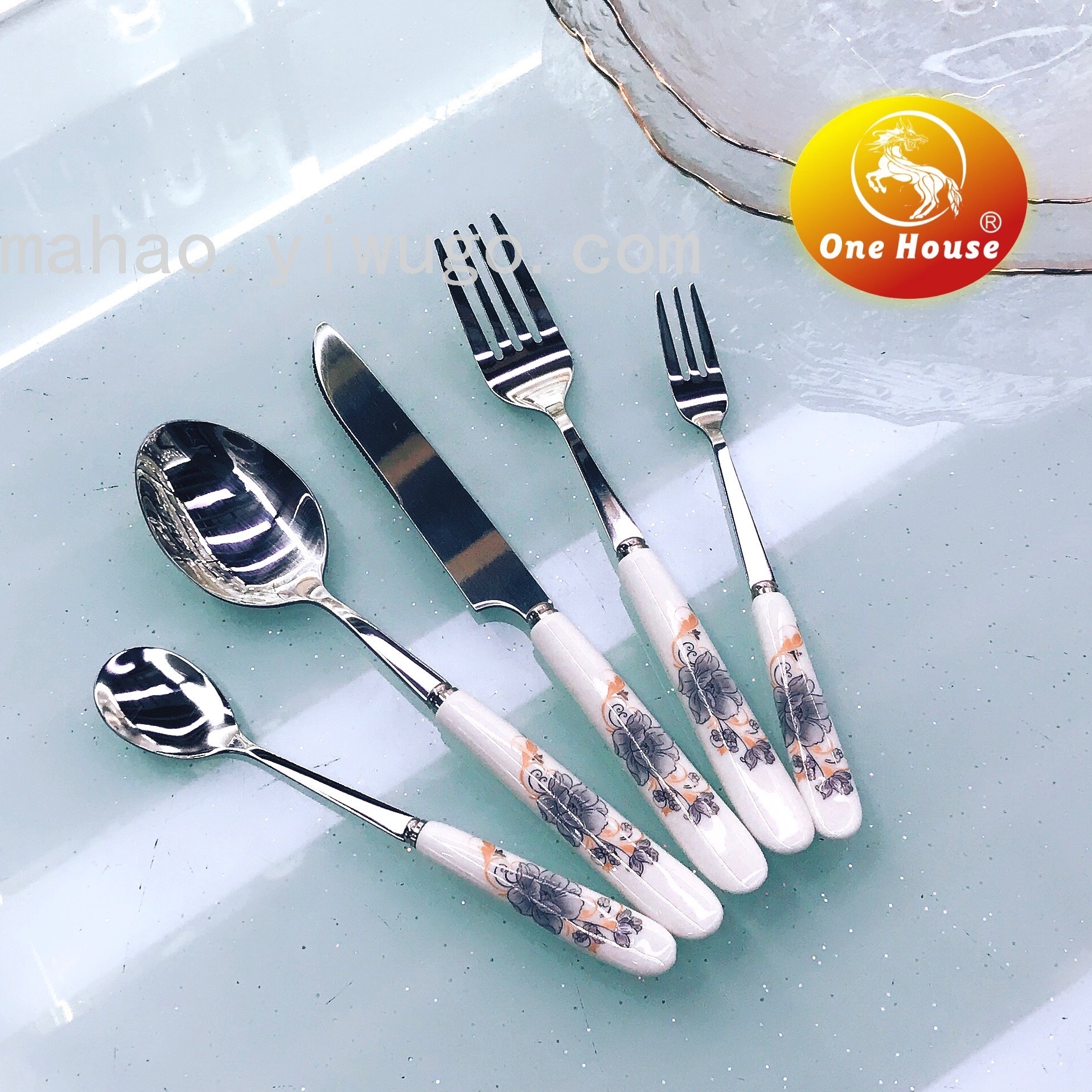 晶致厂家直销陶瓷柄不锈钢餐具创意色釉刀叉勺套装酒店西餐餐具