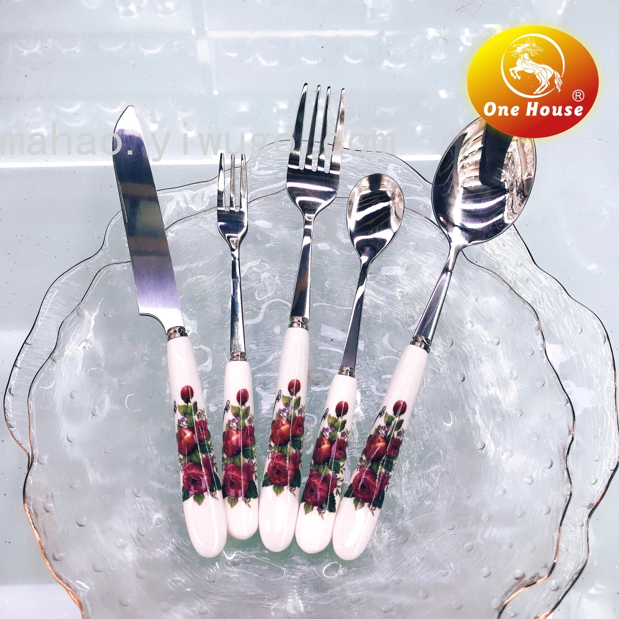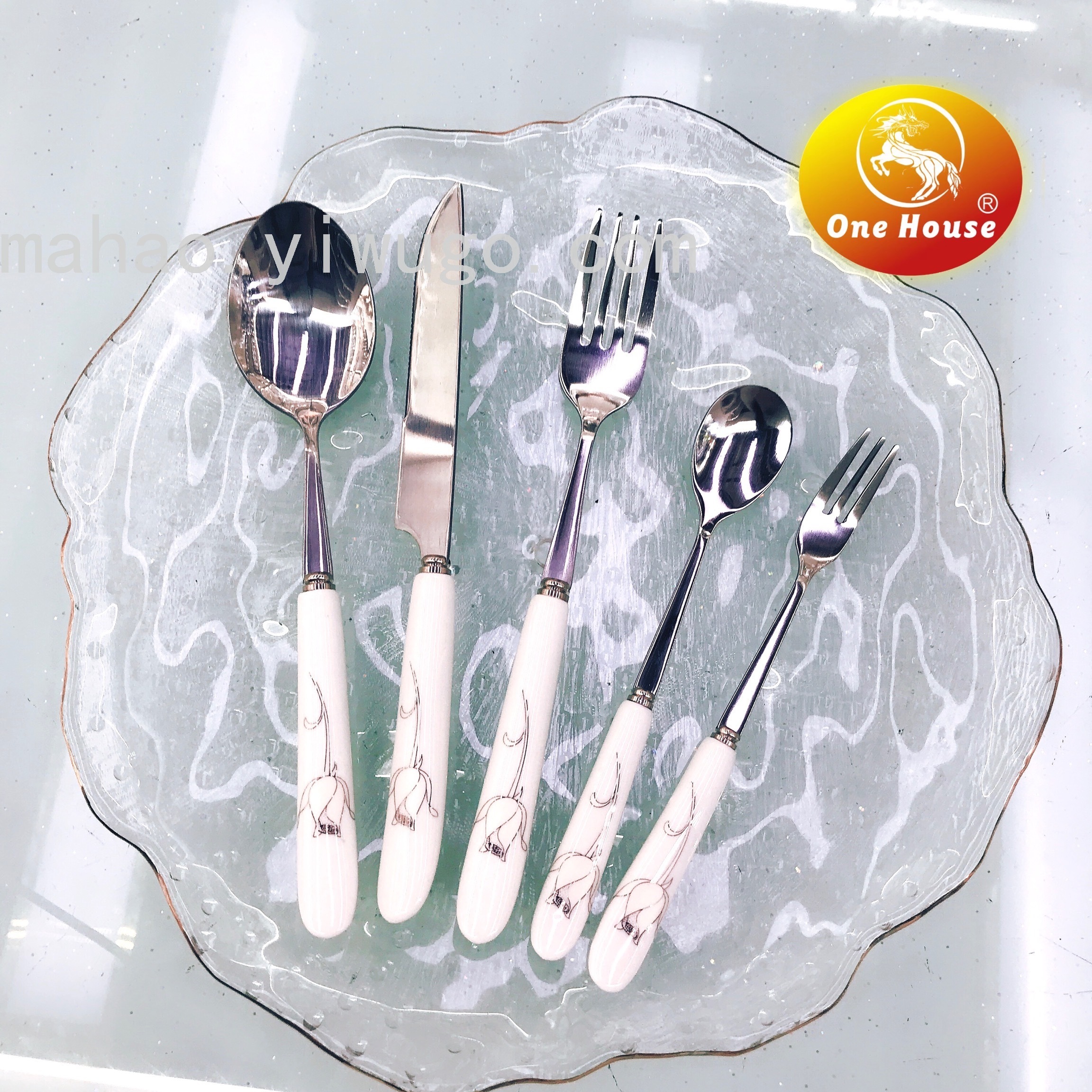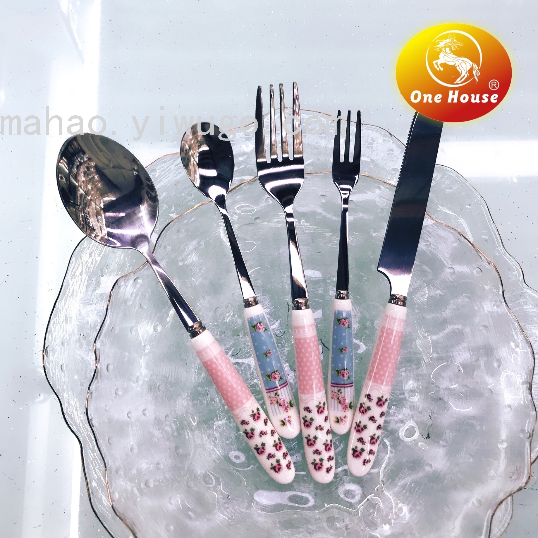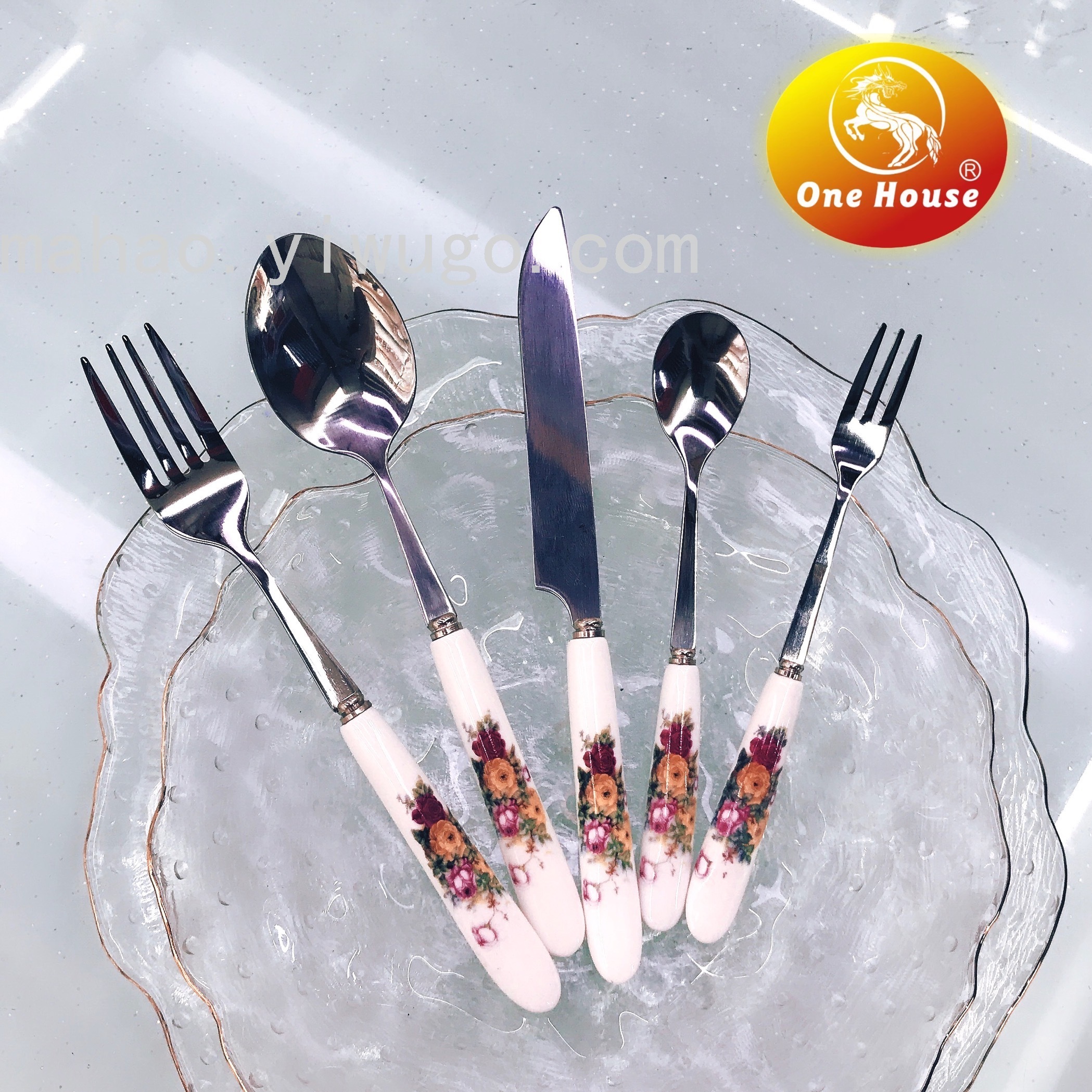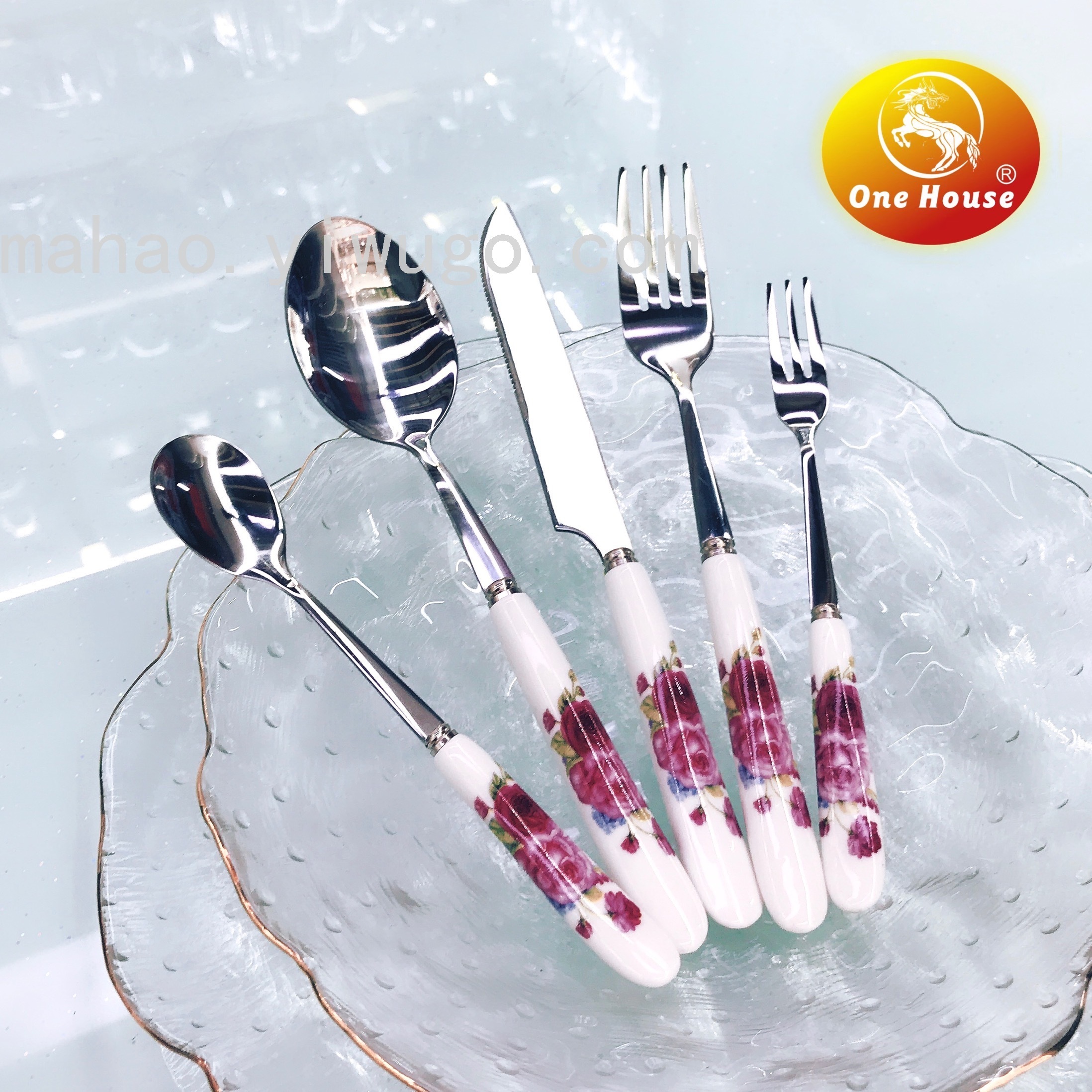晶致厂家直销陶瓷柄不锈钢餐具创意色釉刀叉勺套装酒店西餐餐具