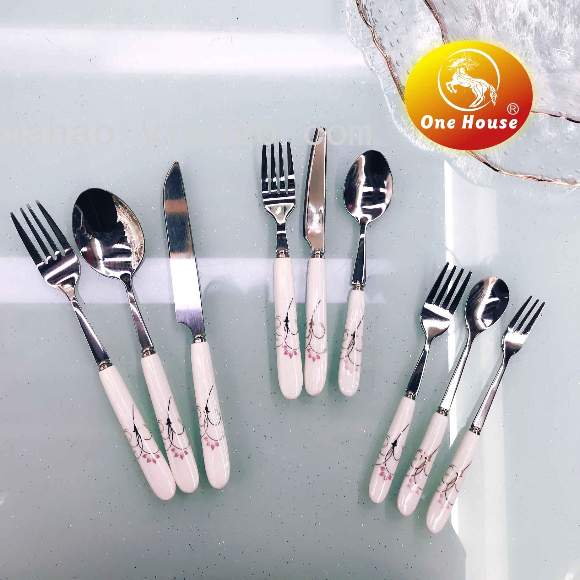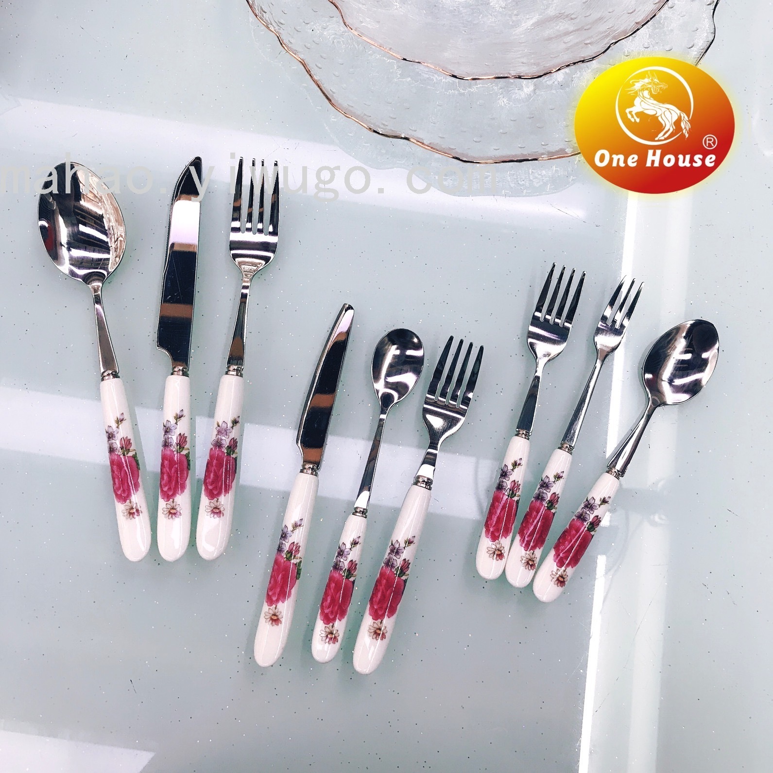 晶致厂家直销陶瓷柄不锈钢餐具创意色釉刀叉勺套装酒店西餐餐具