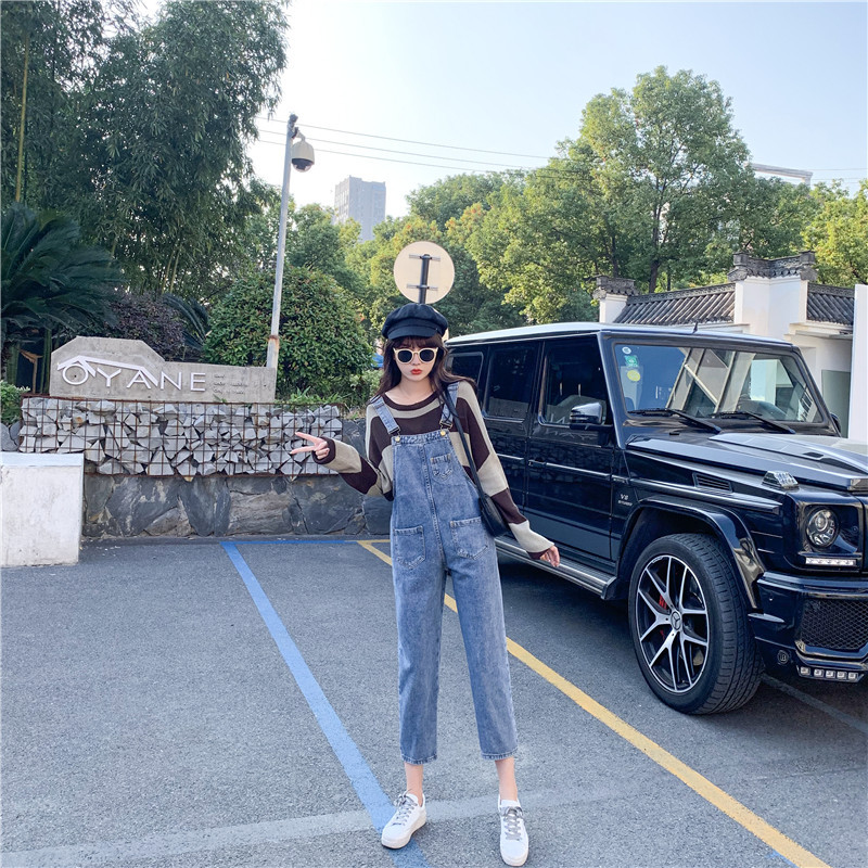 大码女装牛仔背带裤秋冬季新款宽松显瘦加肥胖妹妹九分直筒哈伦裤