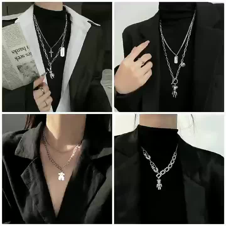 钛钢几何星星月亮项链嘻哈气质双层小熊项链女锁骨链毛衣链批发