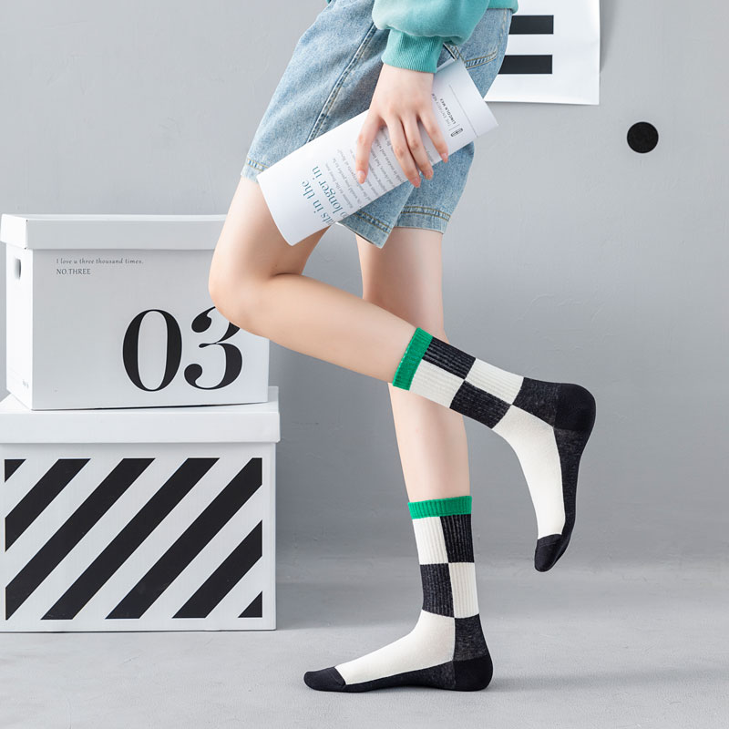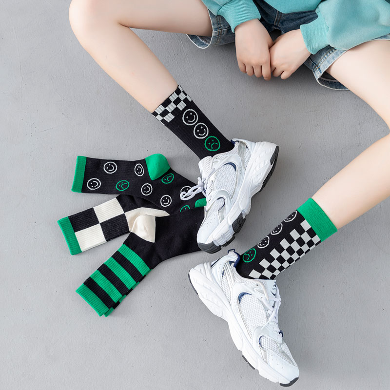 棋盘格袜子绿色潮ins中筒袜女街头运动笑脸黑白方格个性条纹情侣