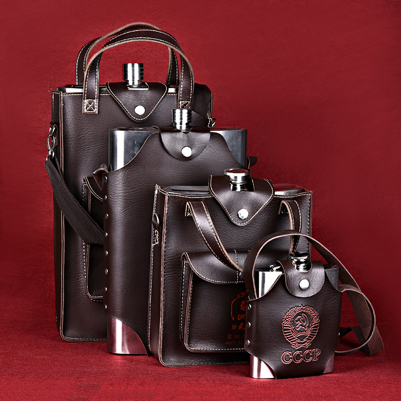 优质皮革手提酒袋 不锈钢酒壶皮包 户外酒水包装袋加工定制 直销