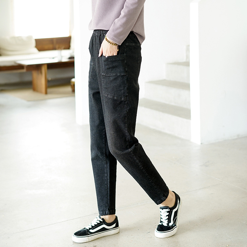 女装高腰牛仔裤女秋季宽松黑色弹力烟管裤松紧腰休闲女裤