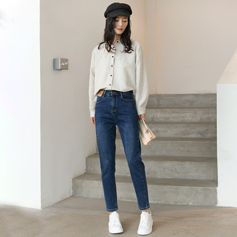 休闲女装高腰牛仔裤女秋季蓝色弹力小脚老爹萝卜裤批发