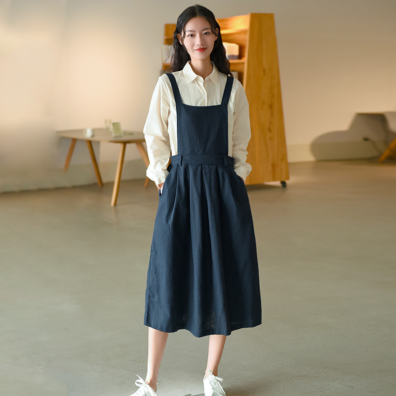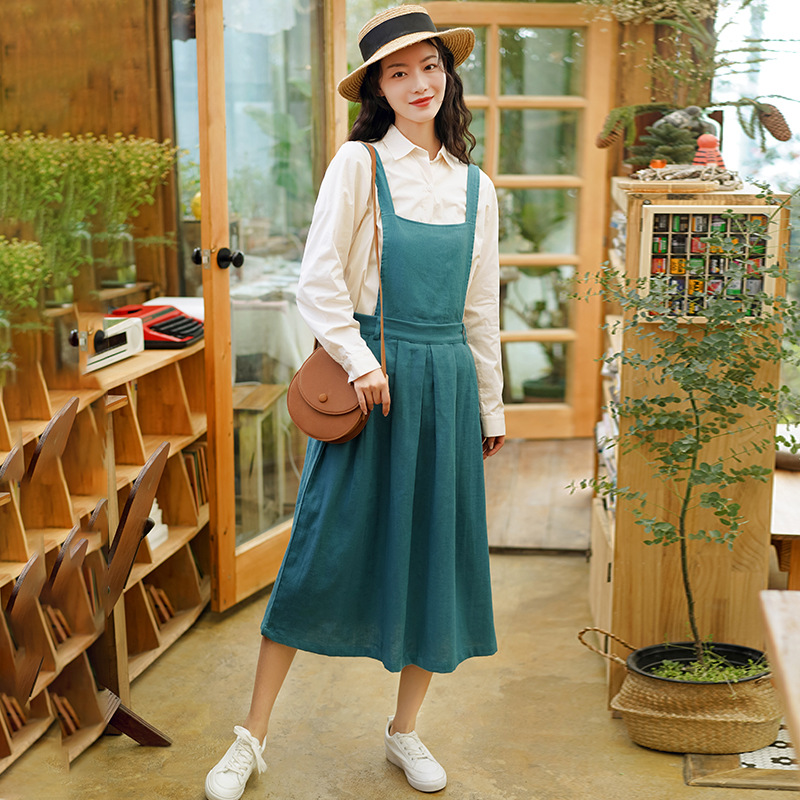 文艺棉麻女装春季背带裙复古宽松收腰无袖大摆吊带连衣裙