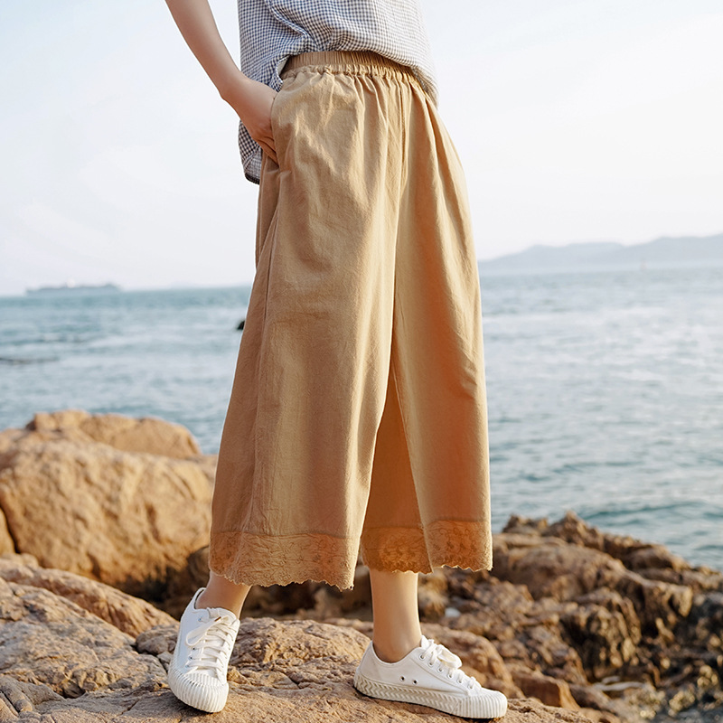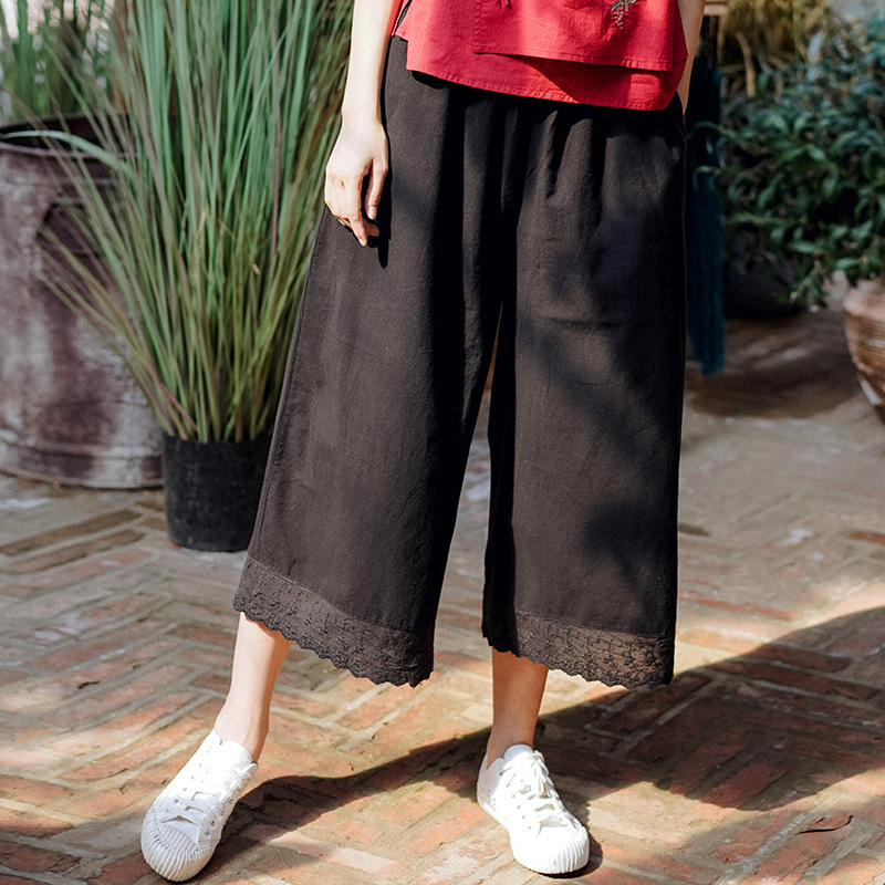 女装高腰阔腿裤女2020夏新款黑色宽松大码花边九分休闲裤裤批发