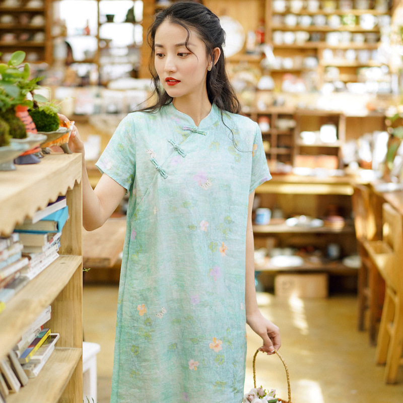 棉麻女装复古短袖苎麻连衣裙夏别致小个子中国风改良旗袍
