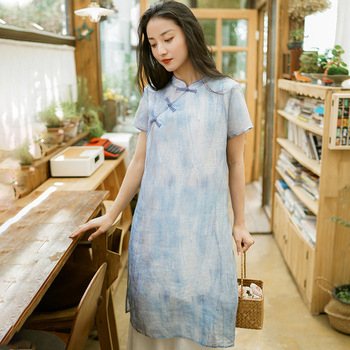 棉麻女装短袖复古苎麻连衣裙 夏季中国风改良旗袍碎花裙