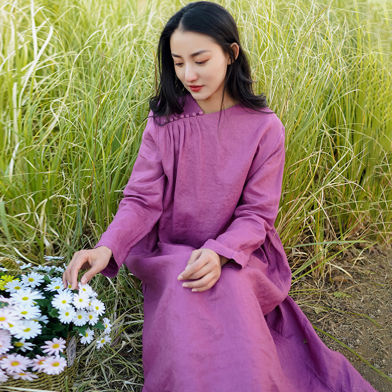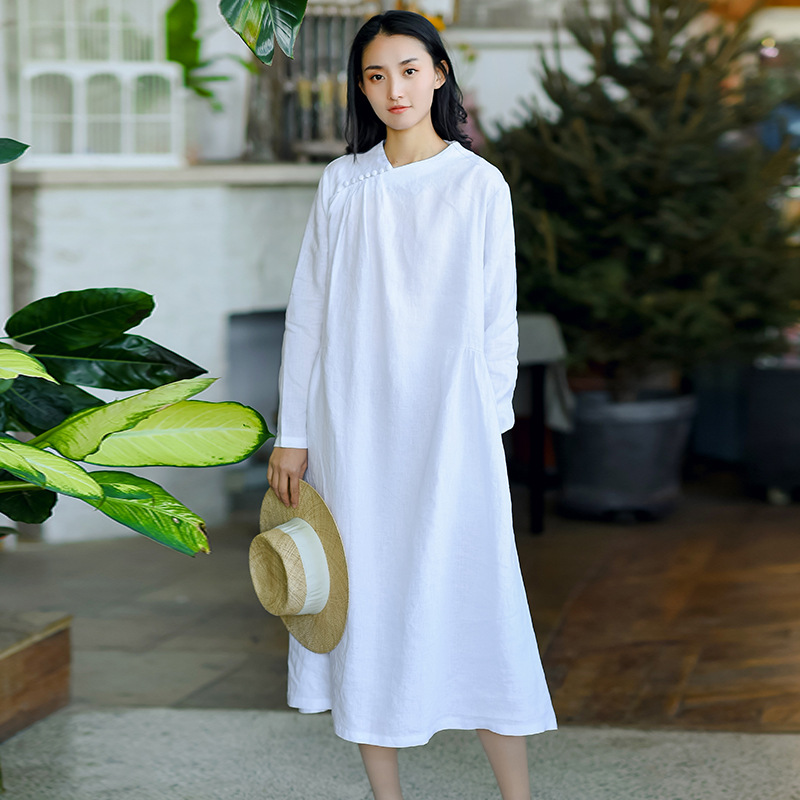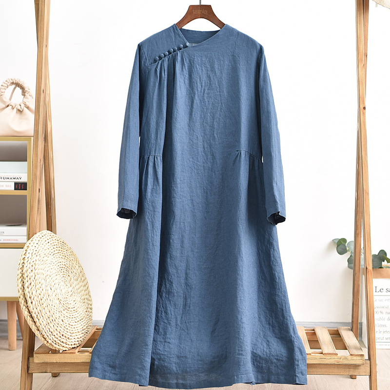 文艺棉麻女装 春季亚麻连衣裙女宽松气质a字复古过膝长裙