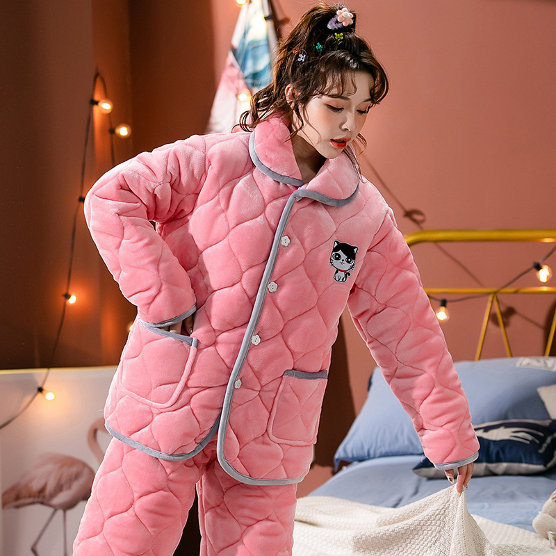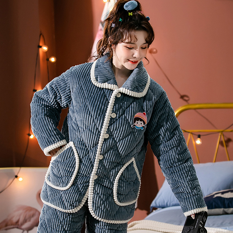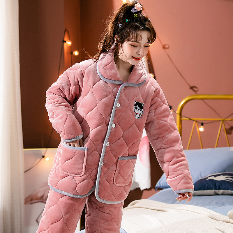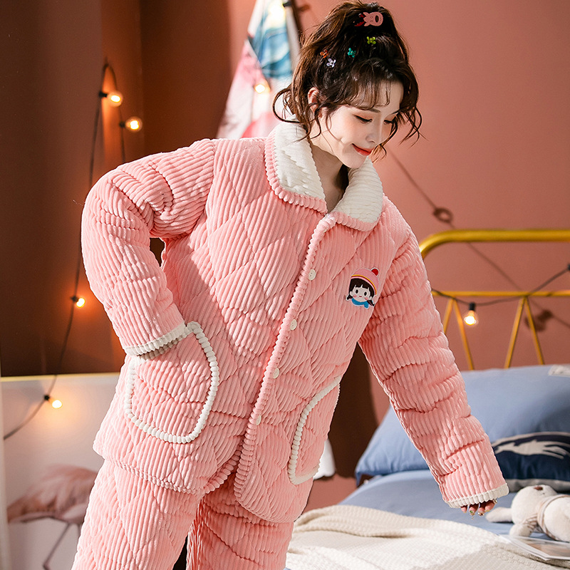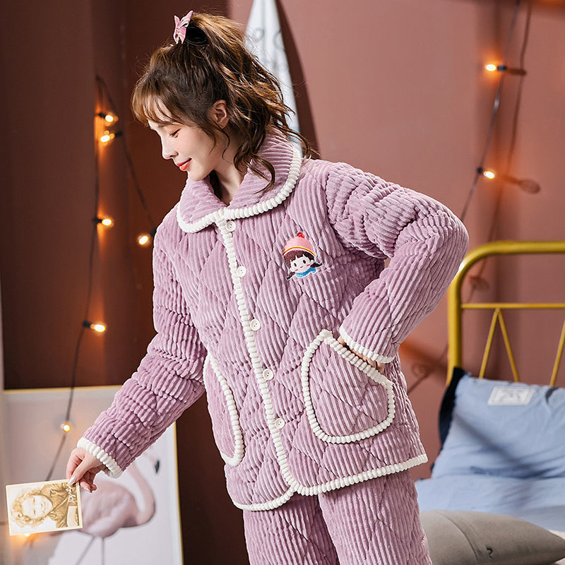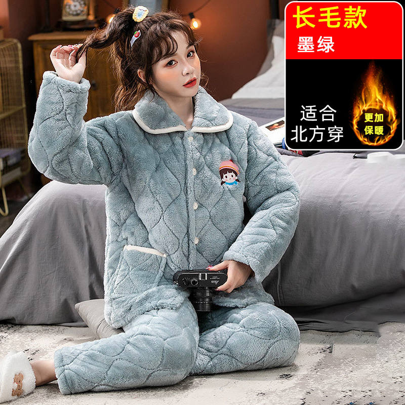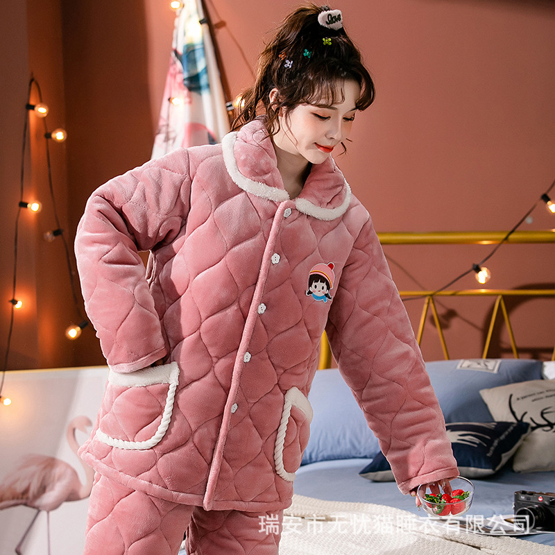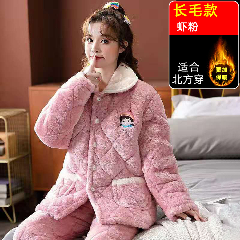 睡衣女冬季加绒加厚三层夹棉保暖甜美水晶绒套装法兰绒女士家居服