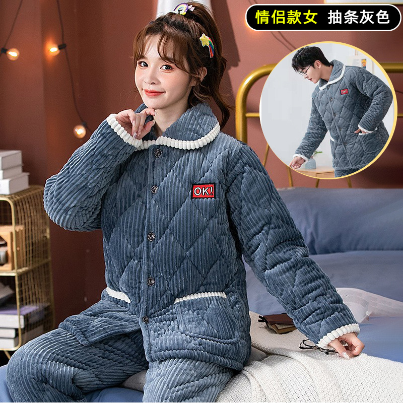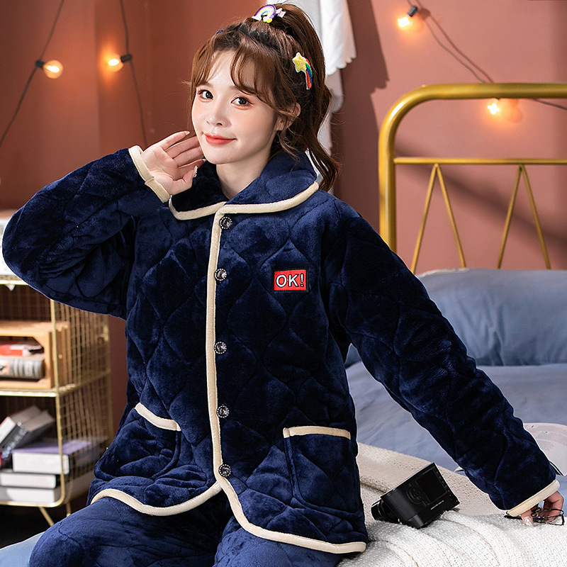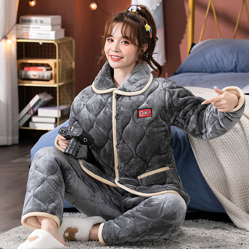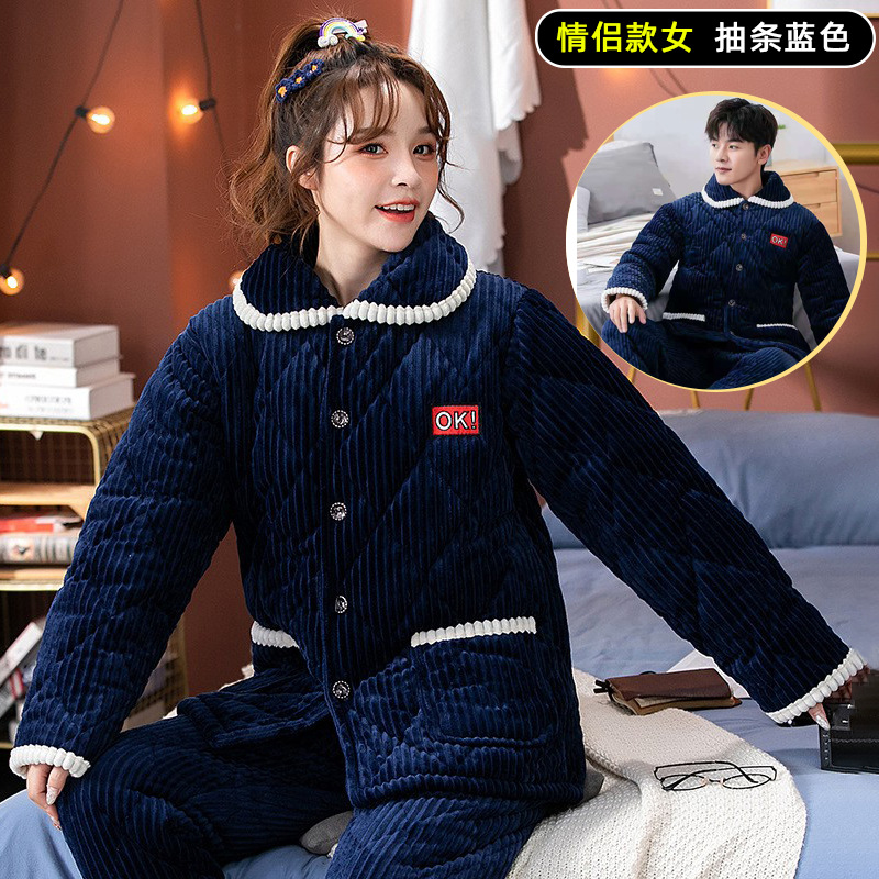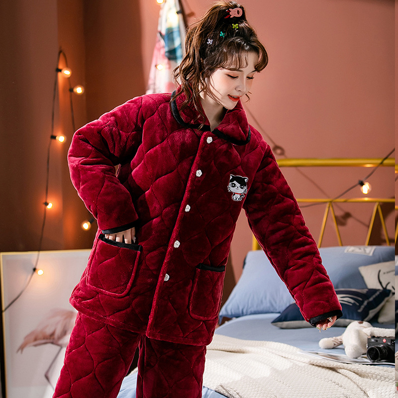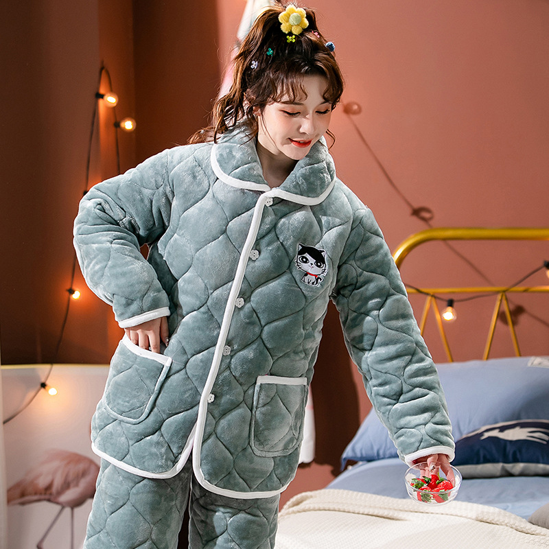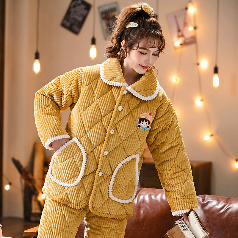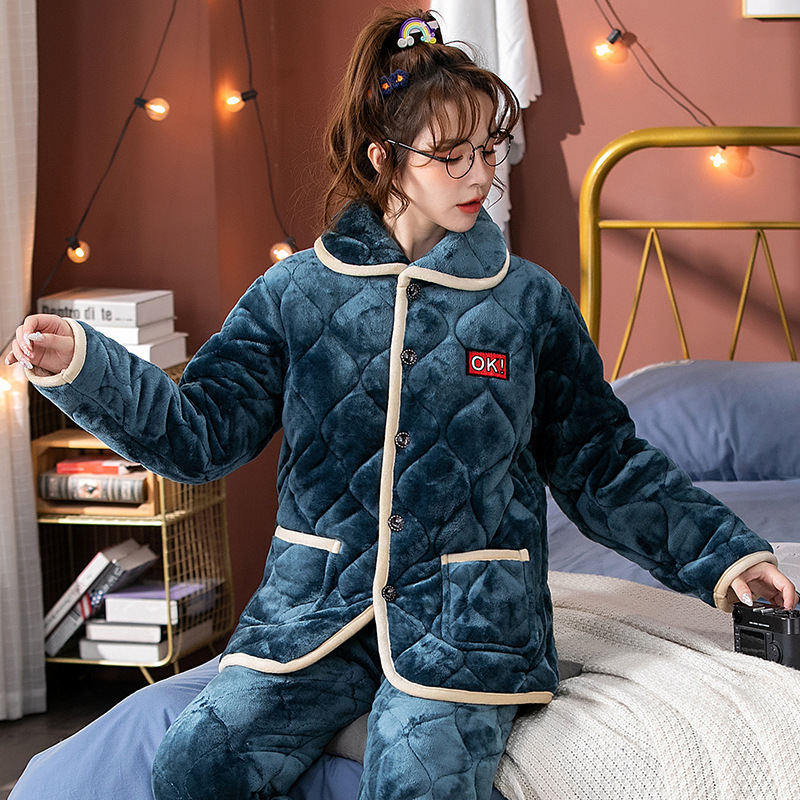 睡衣女冬季加绒加厚三层夹棉保暖甜美水晶绒套装法兰绒女士家居服