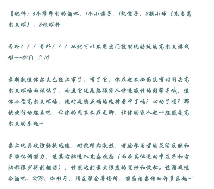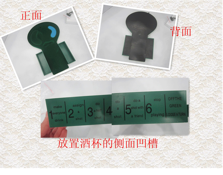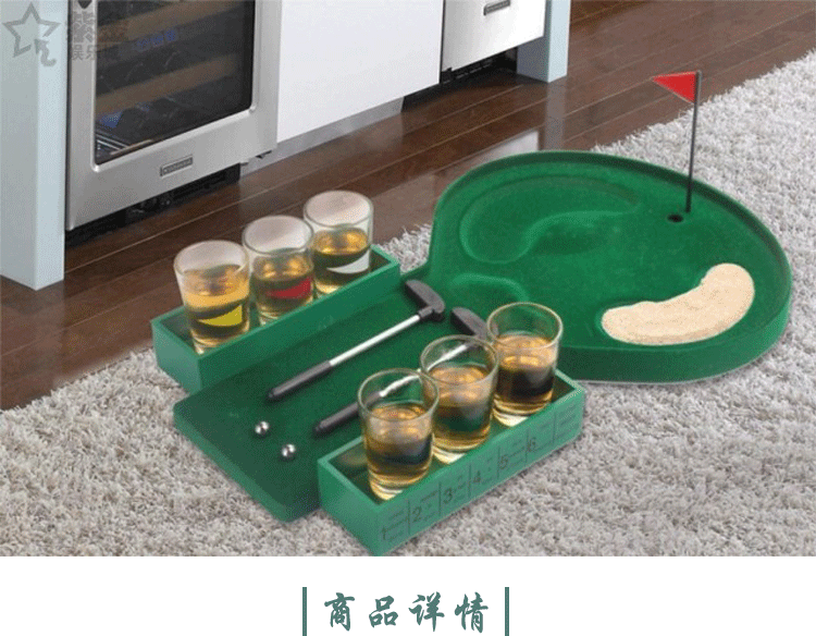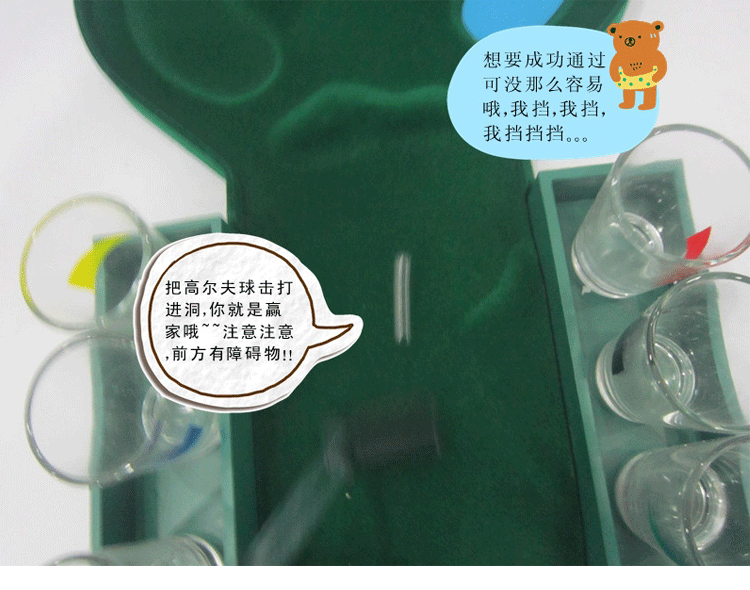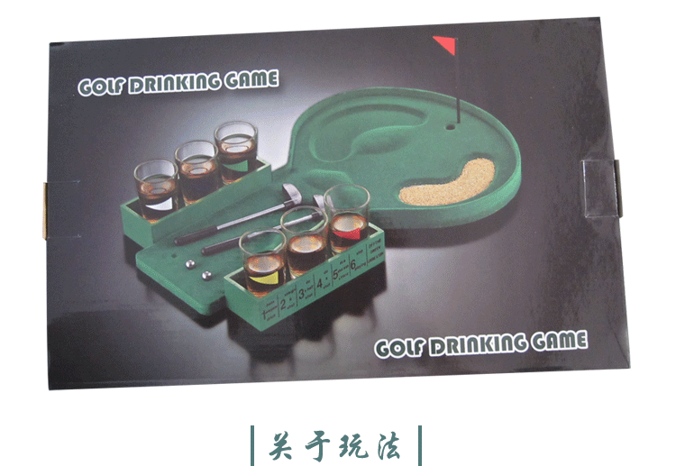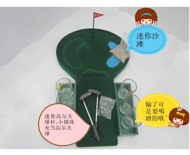 配件:6个带印刷的酒杯,1个小旗子,1包傻子,2颗小球(充当高尔夫球),2根球杆