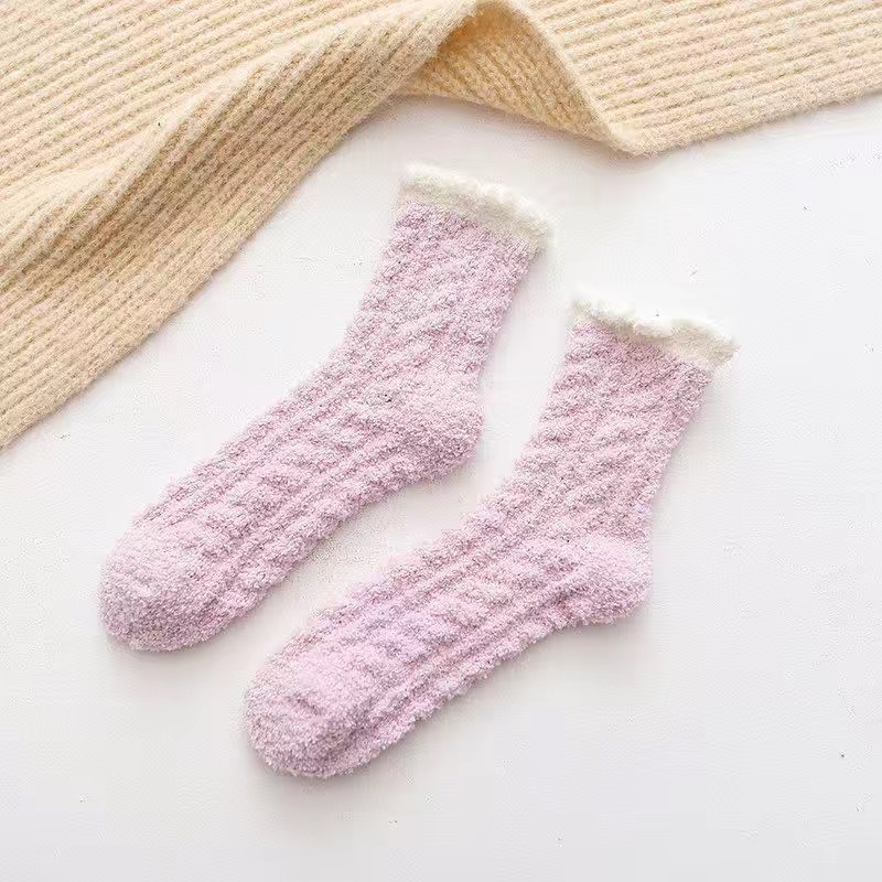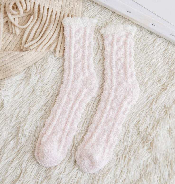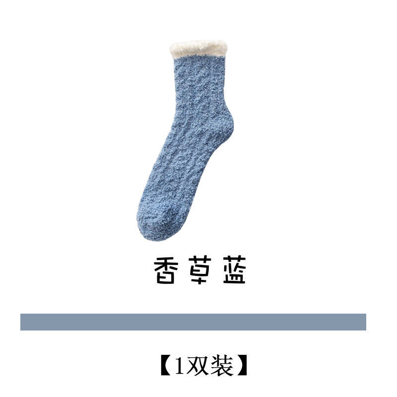 珊瑚绒加绒加厚麻花地板袜冬季家居半边绒睡眠袜子马卡龙纯色女袜