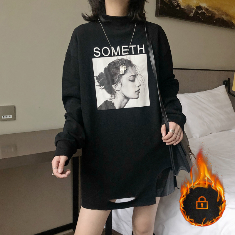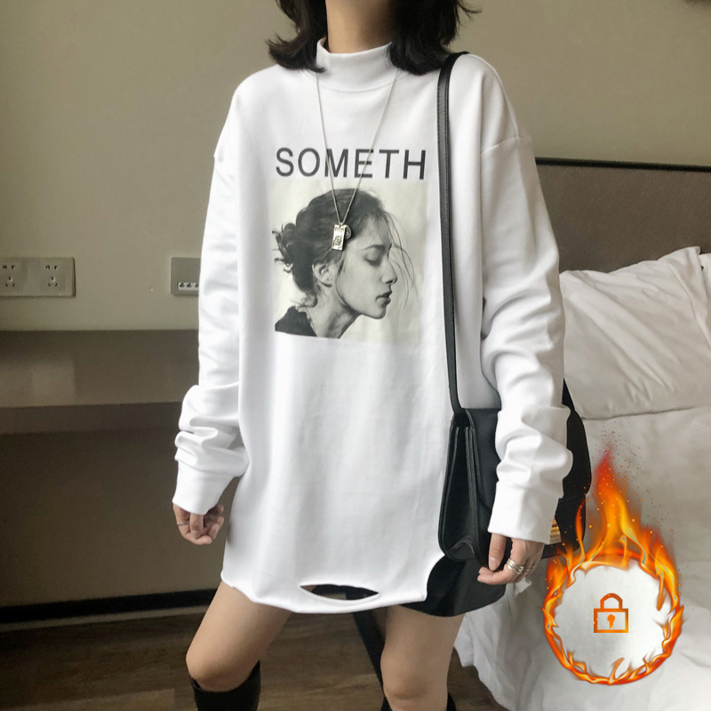 半高领打底衫女装秋冬宽松磨毛叠穿内搭打底加绒白色长袖t恤上衣
