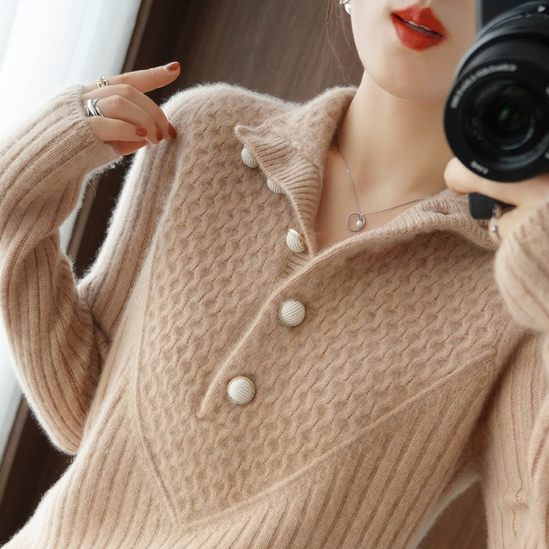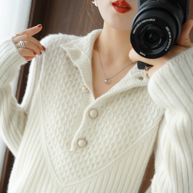 2021秋冬新款女半高领竖条珍珠扣加厚毛衣宽松套头气质显瘦打