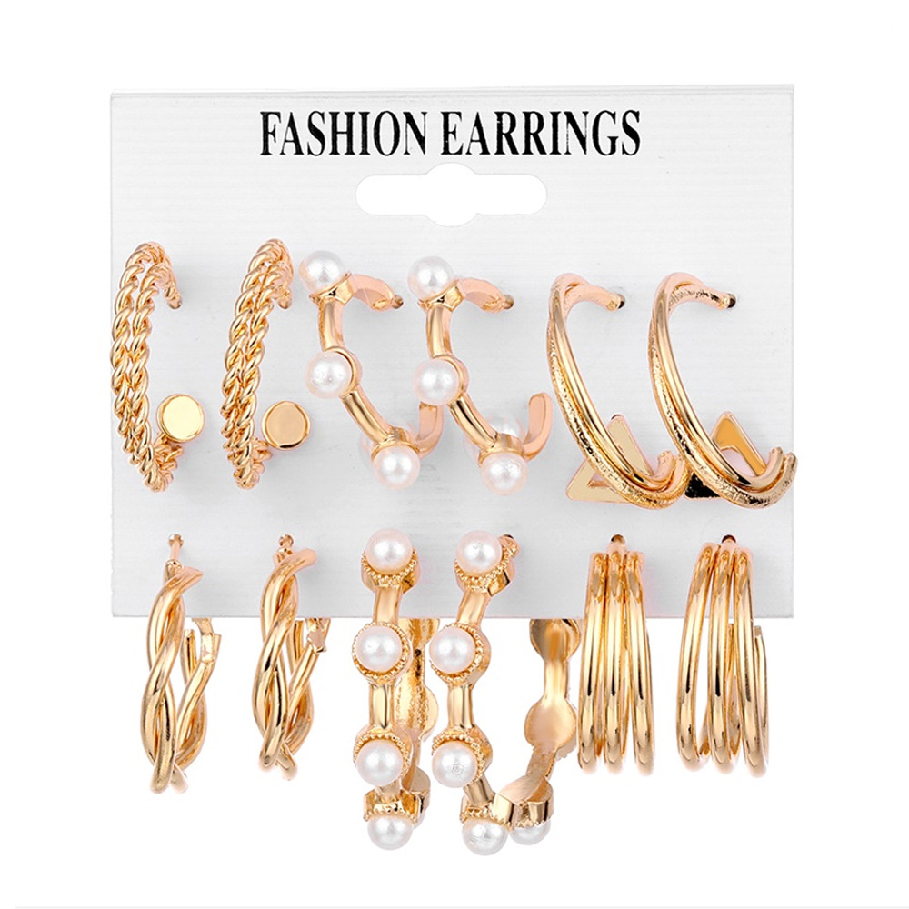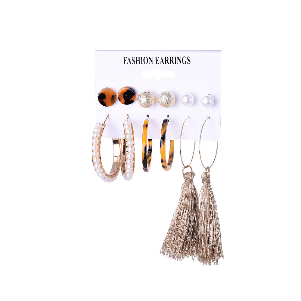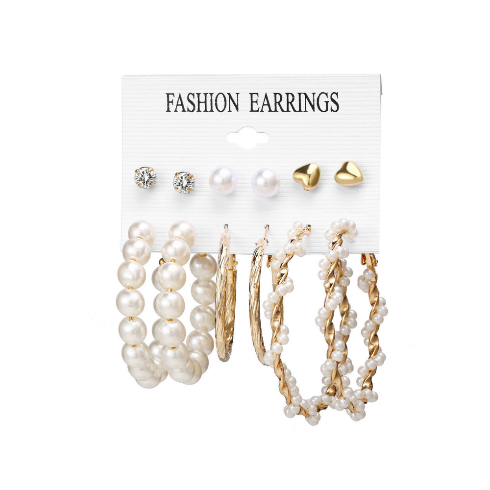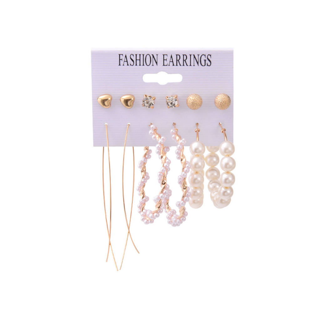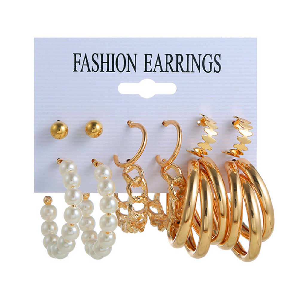 2021秋冬欧美跨境新款个性合金珍珠9对耳环 气质流苏叠戴风耳饰