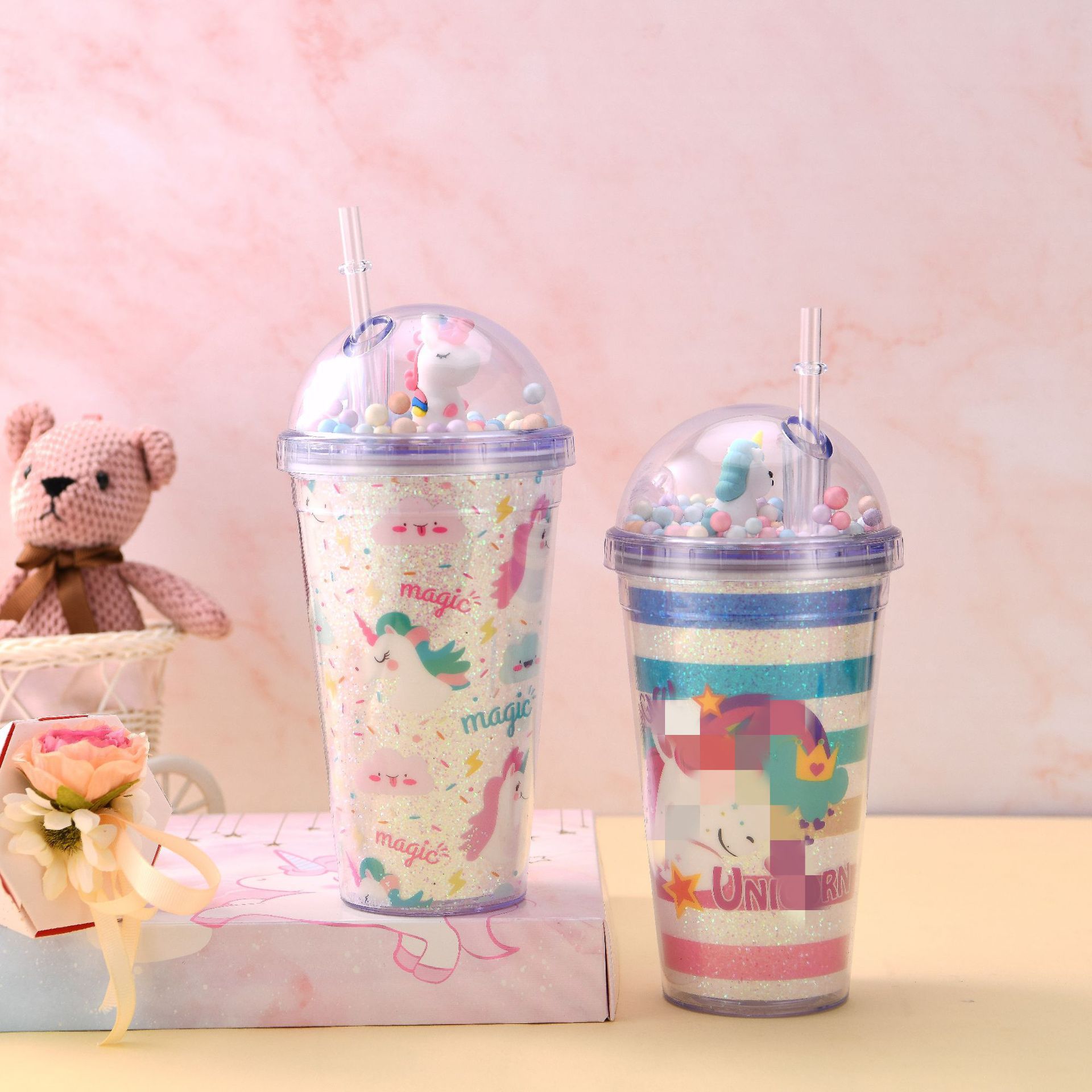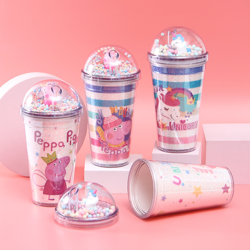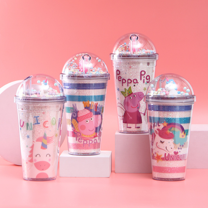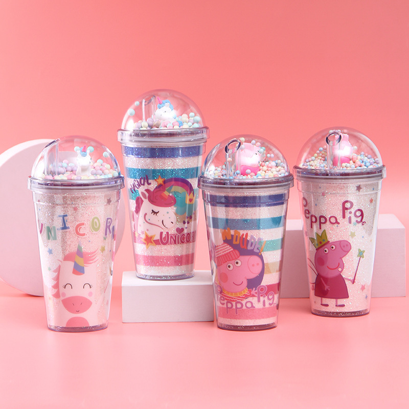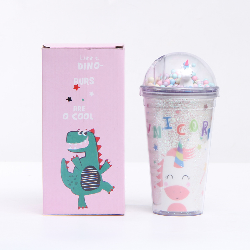 韩式学生少女夏日冰杯 独角兽情侣吸管杯 双层制冷塑料水杯定制