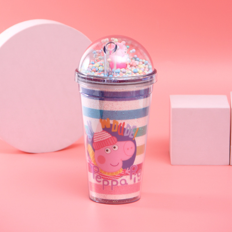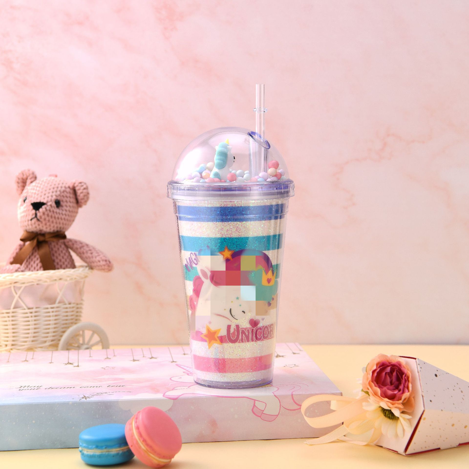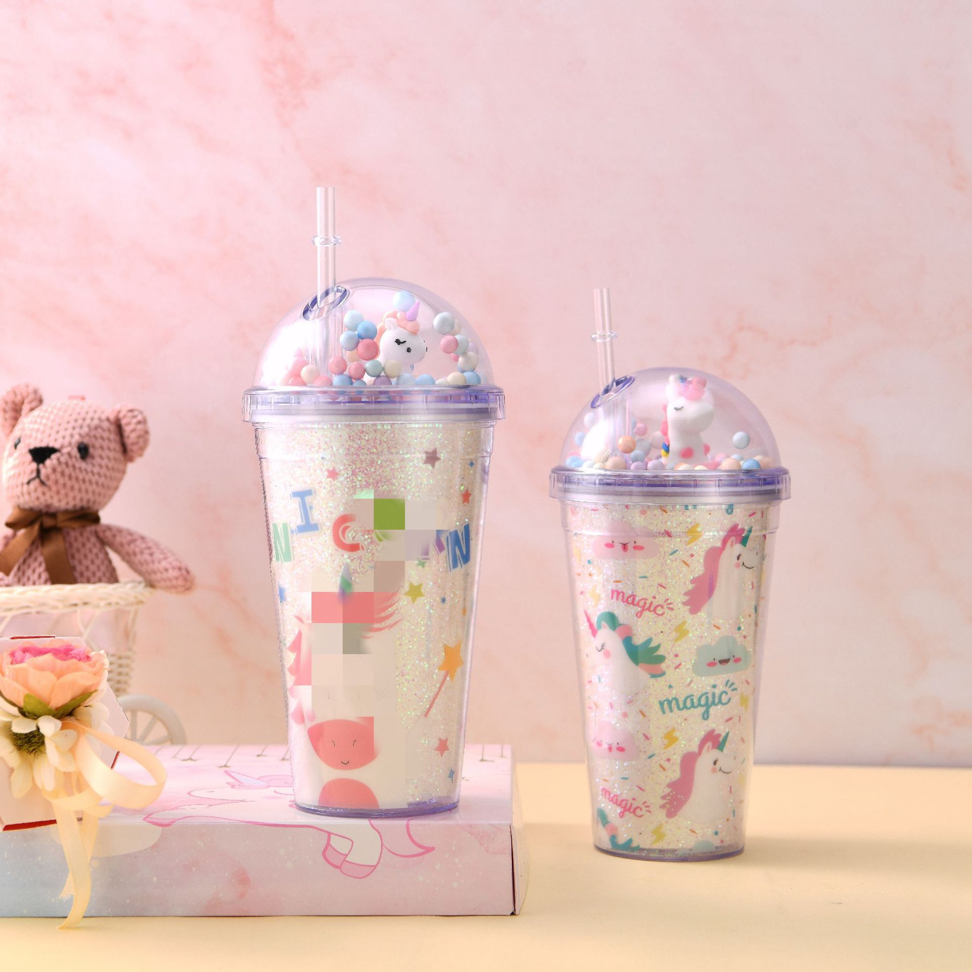 韩式学生少女夏日冰杯 独角兽情侣吸管杯 双层制冷塑料水杯定制