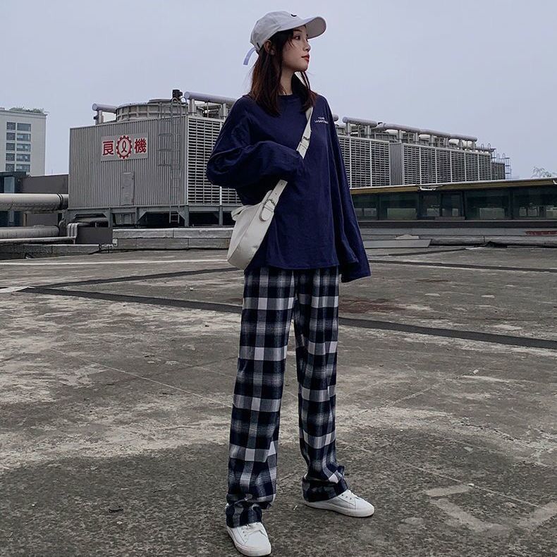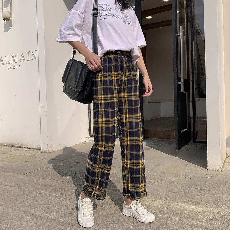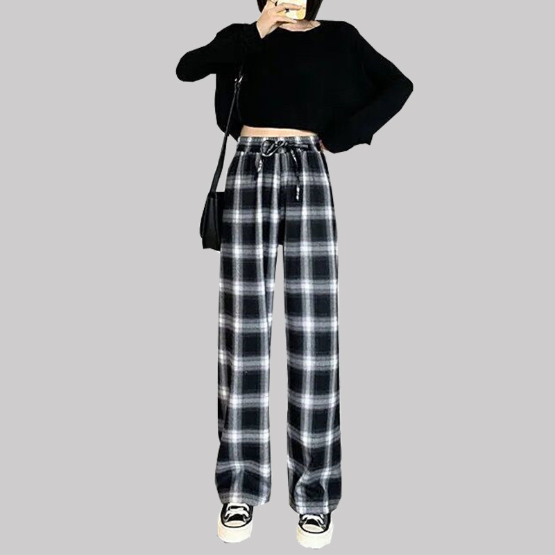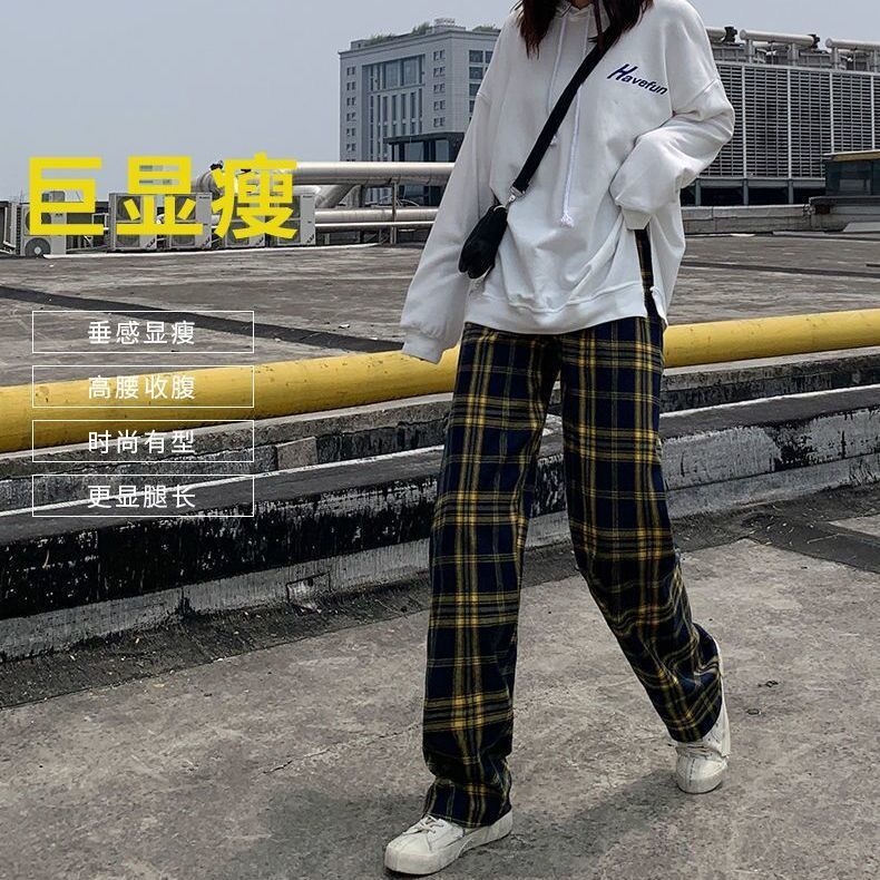 2021年春款黑白格子裤女宽松潮流高腰直筒垂感休闲裤复古阔腿裤子