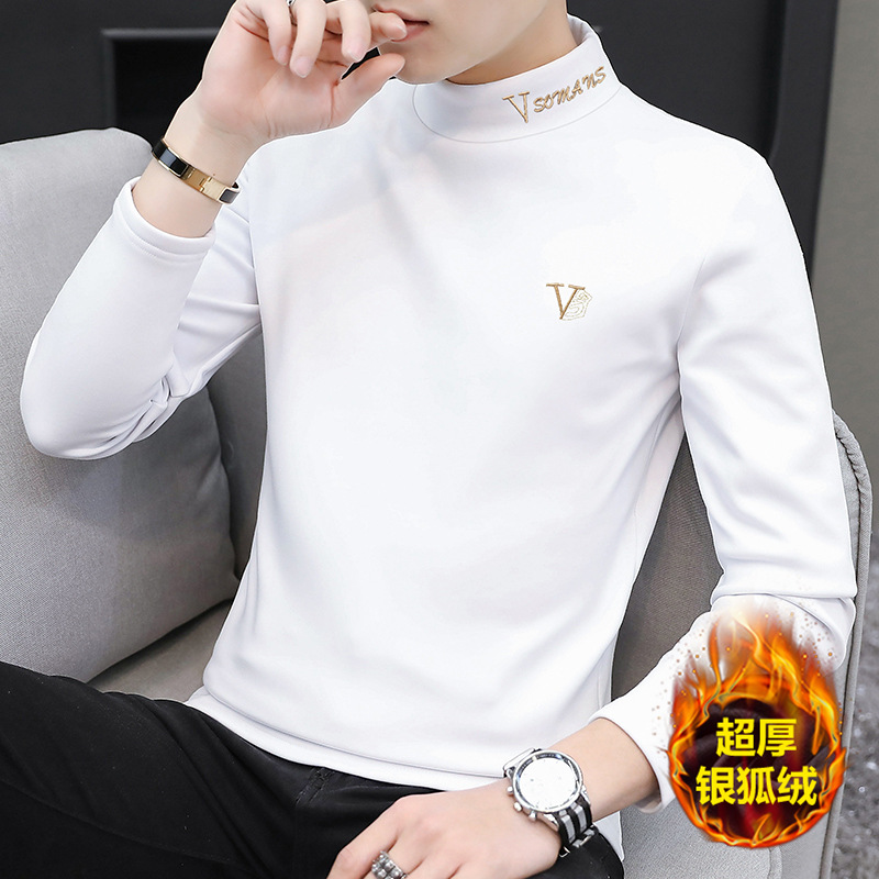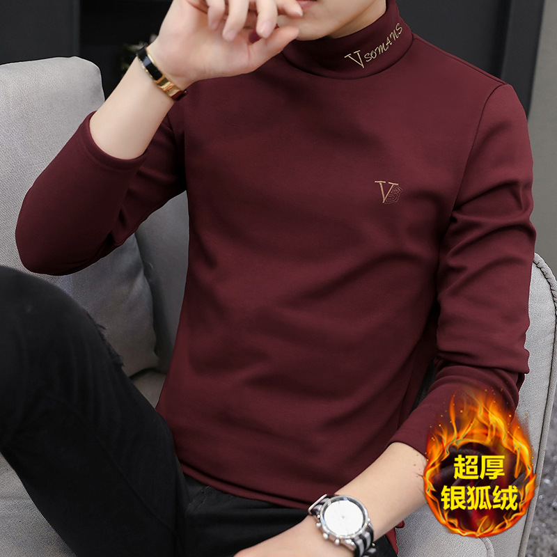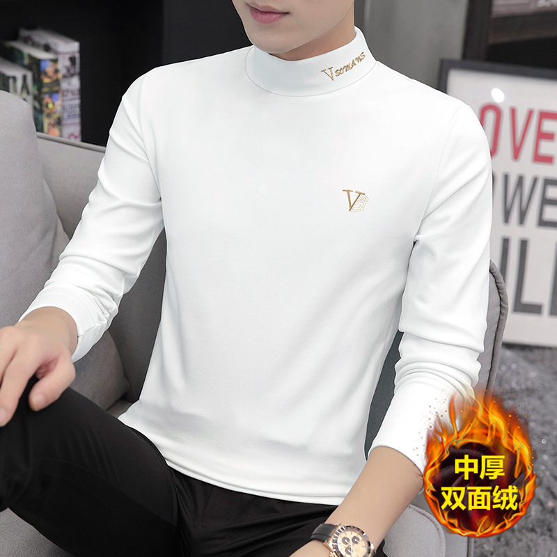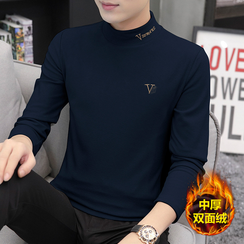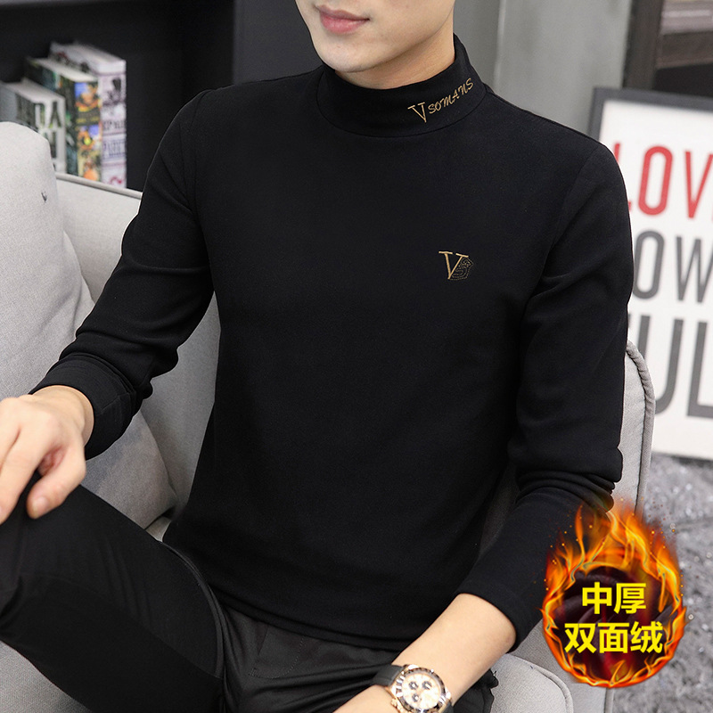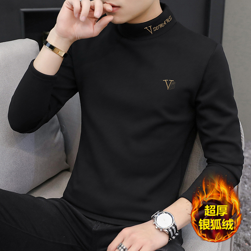 秋冬男士T恤修身保暖内搭半高领长袖秋衣服男加绒加厚打底衫中领