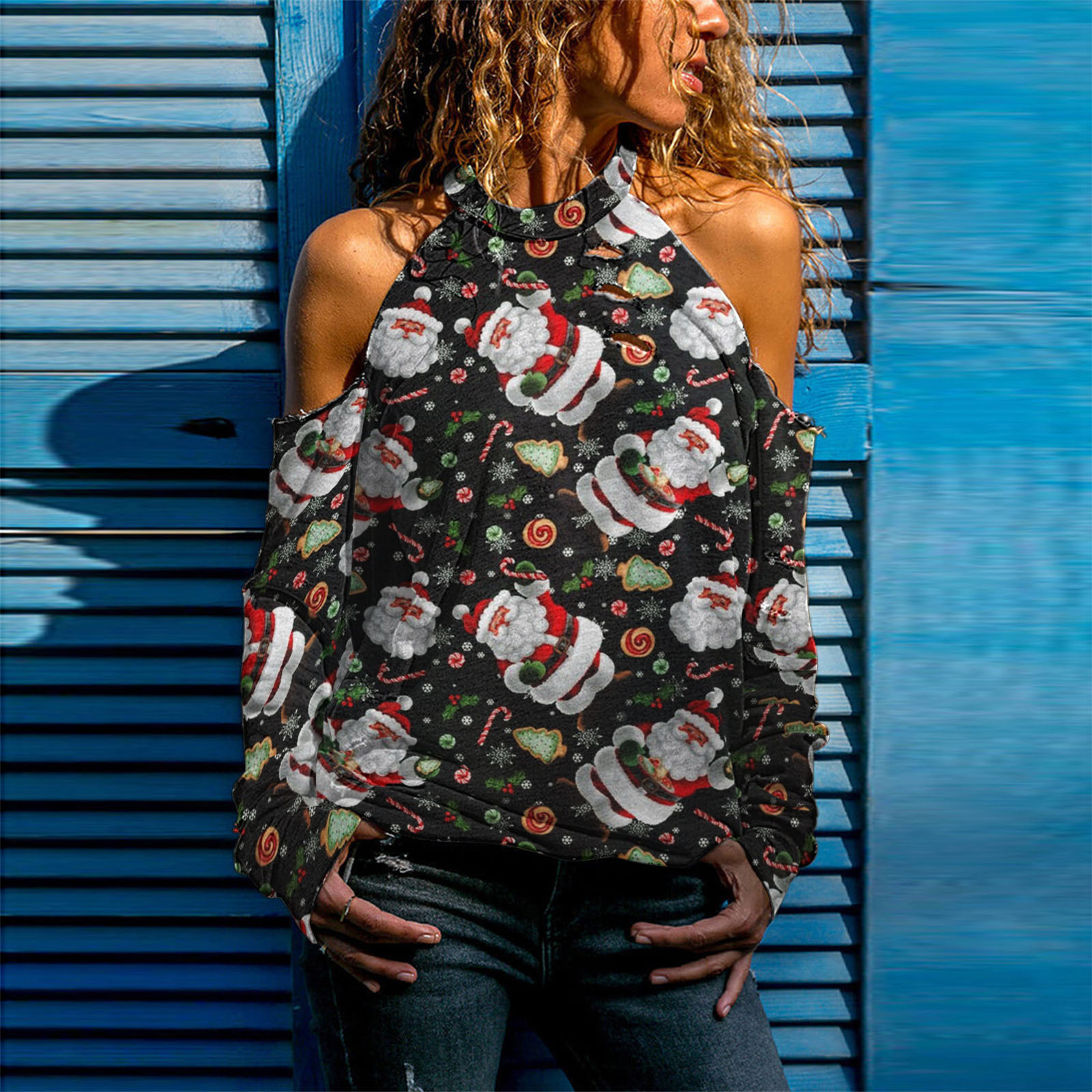 2021欧美亚马逊ebay独立站新款圣诞节女装破洞镂空长袖T恤上衣