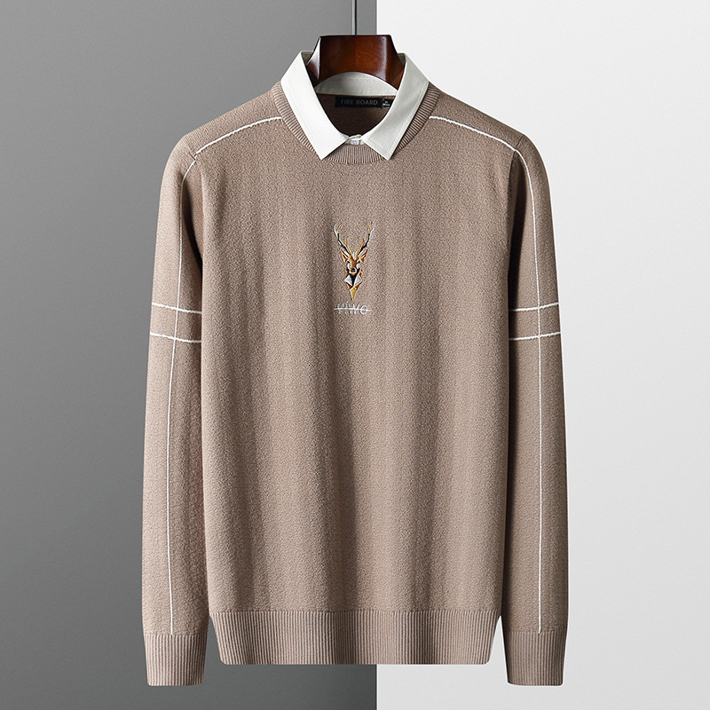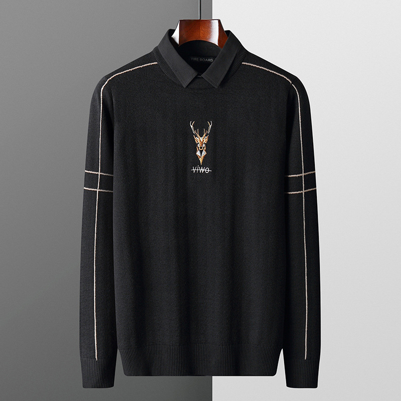 2021秋装毛衣男衬衫领假两件韩版潮流个性带假领刺绣针织衫外套潮