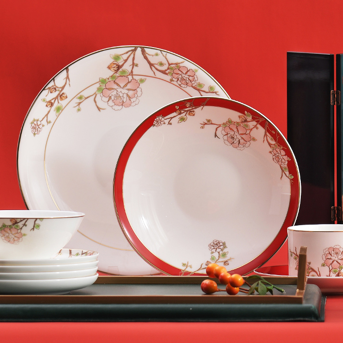 华光国瓷 家用骨瓷餐具碗碟套装 家用中式碗盘餐具套装婚庆 锦色