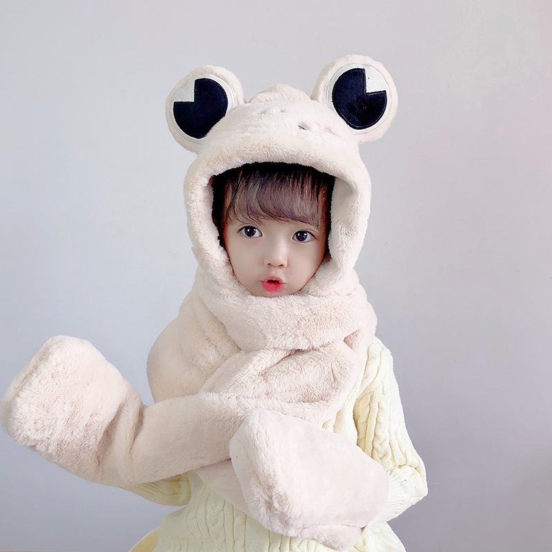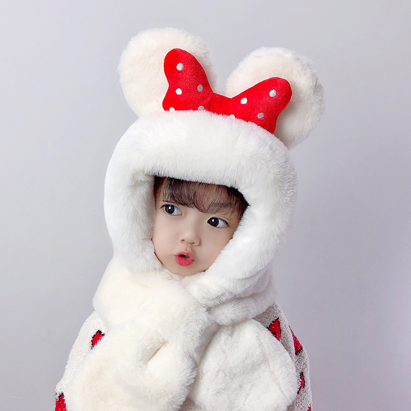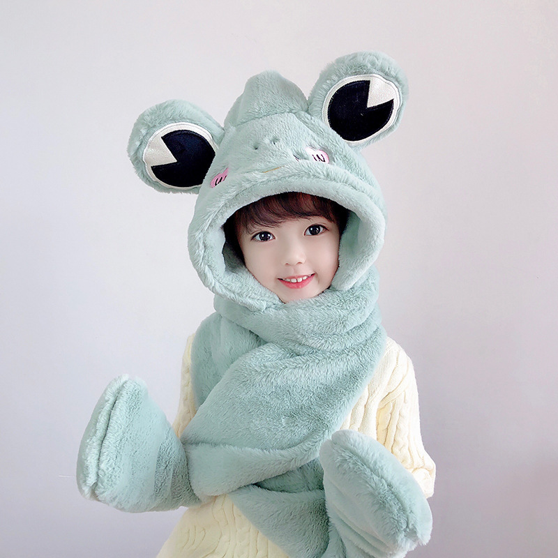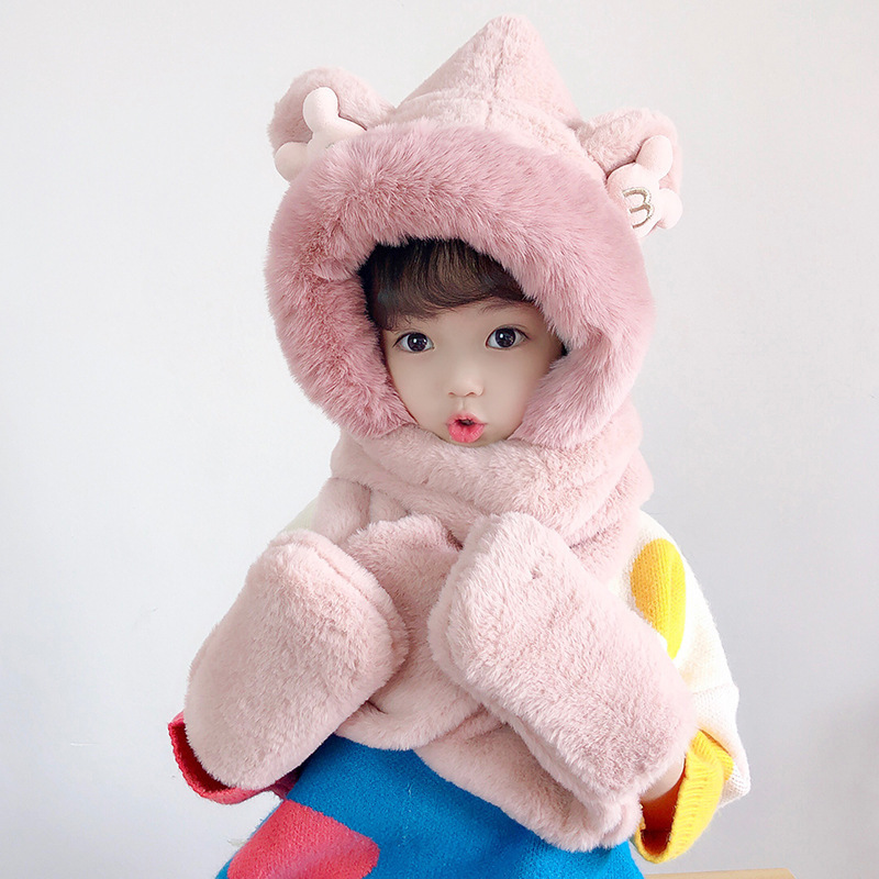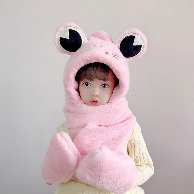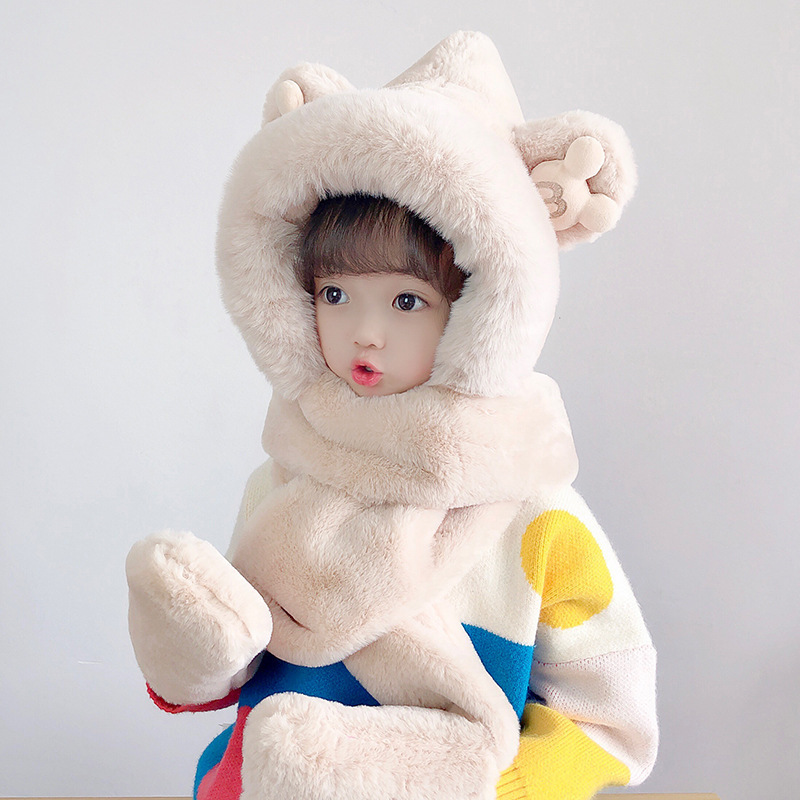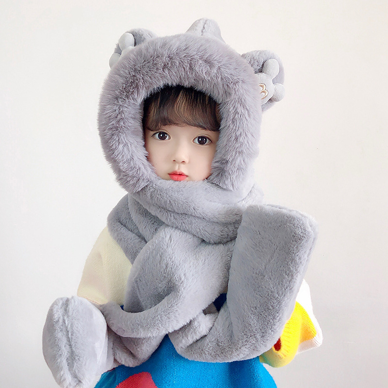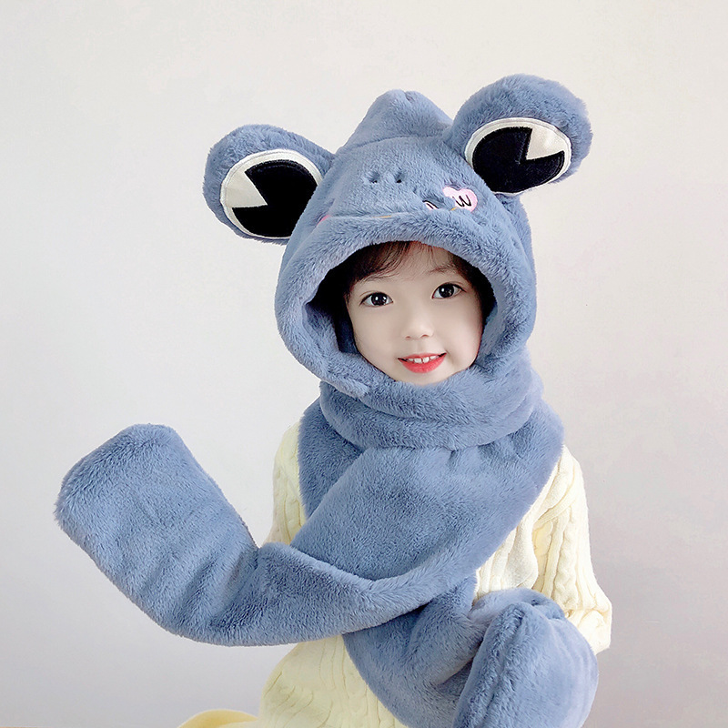厂家批发冬季加绒儿童帽子围巾手套一体帽毛绒卡通加厚防风帽