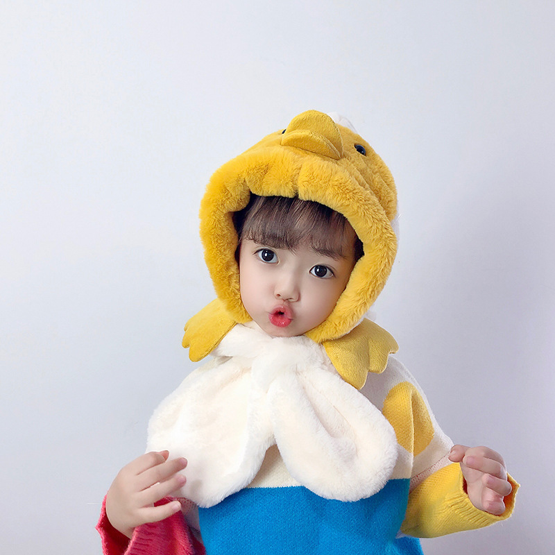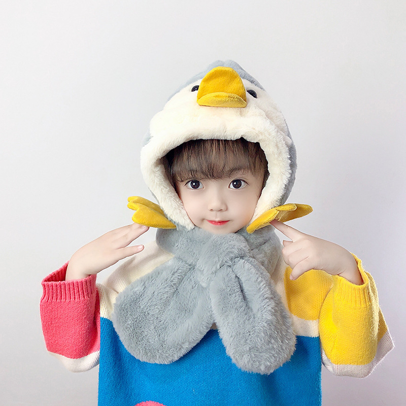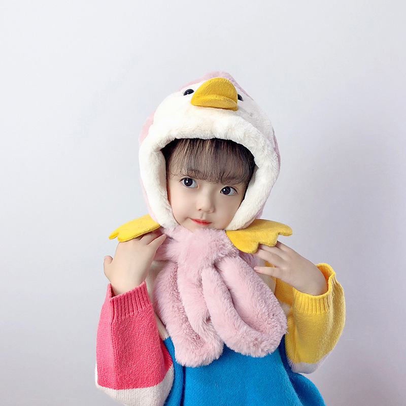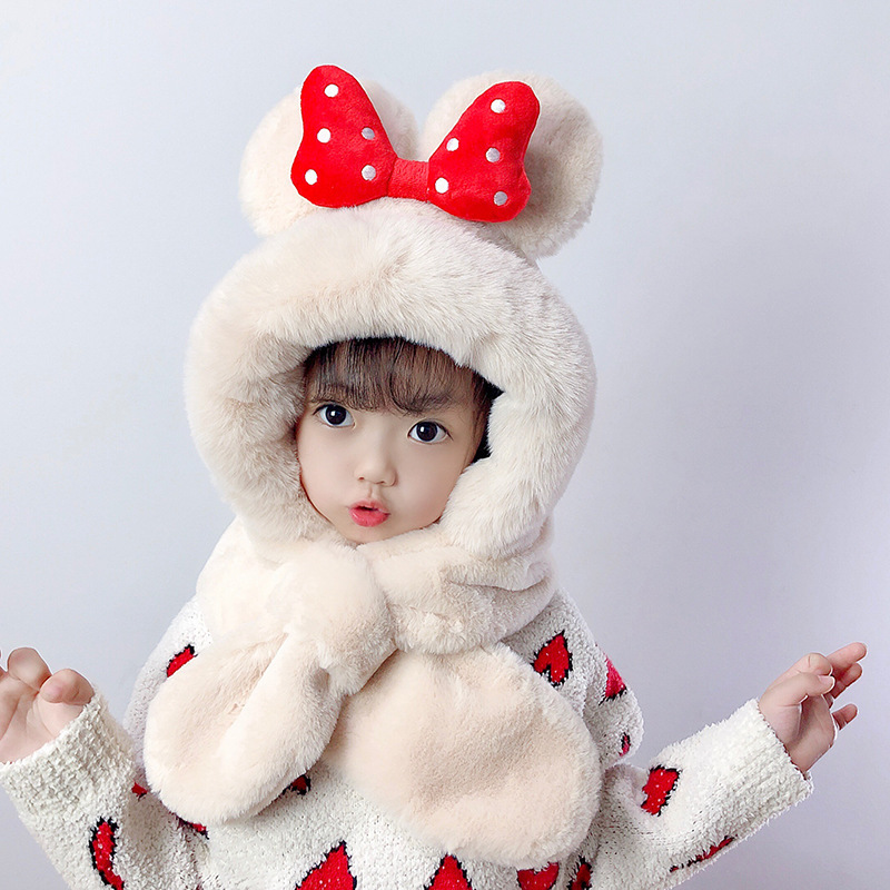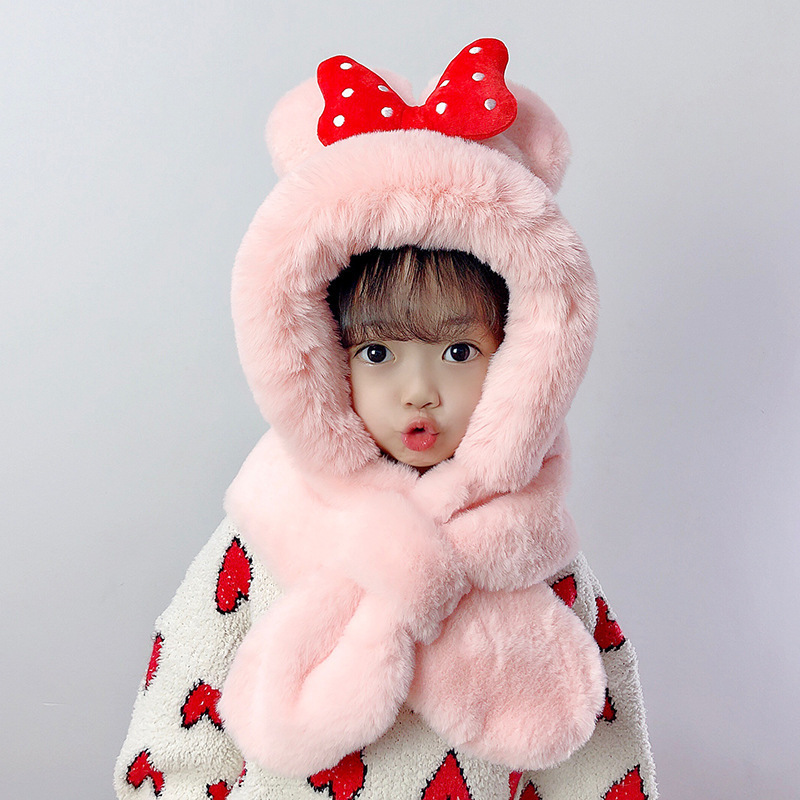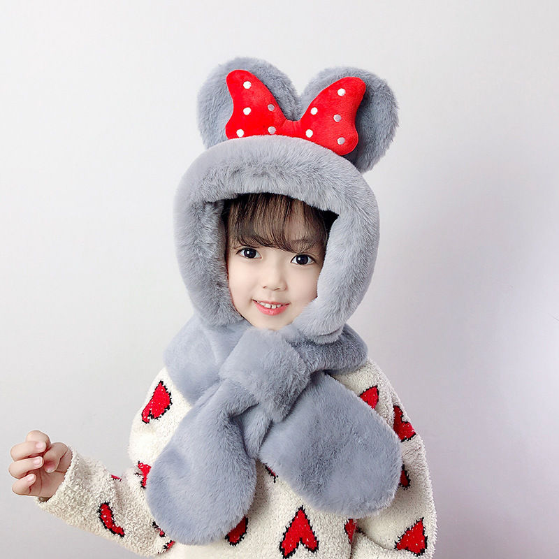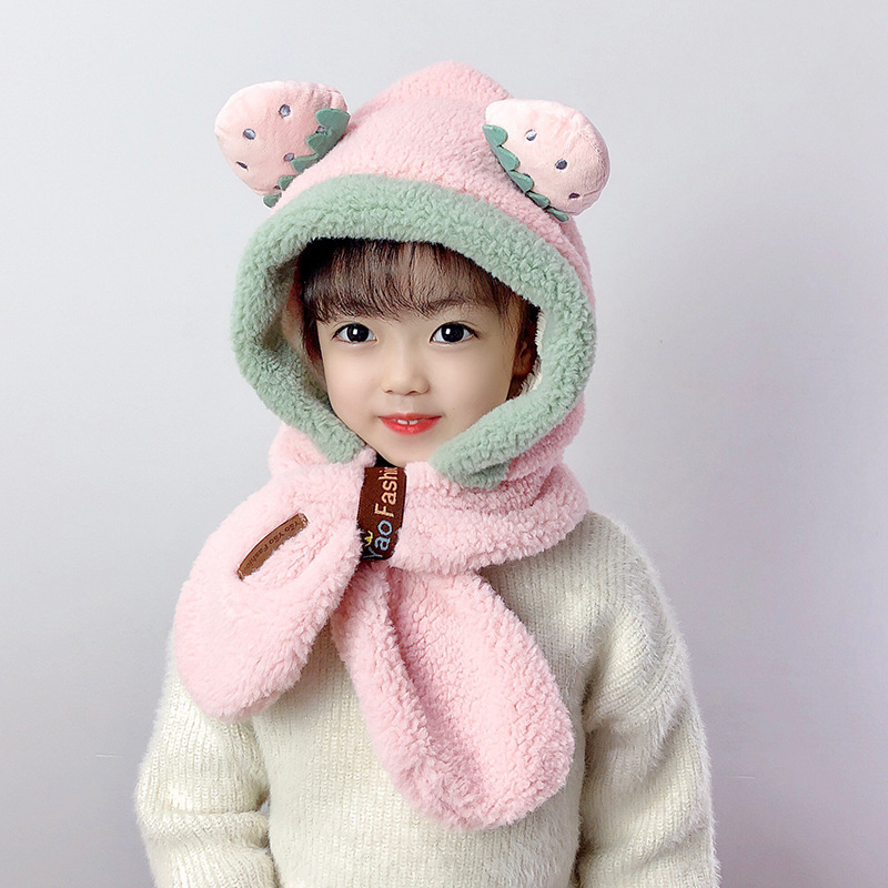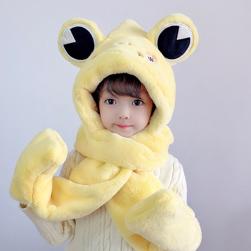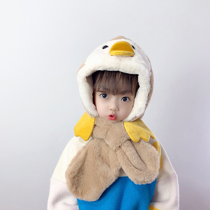 厂家批发冬季加绒儿童帽子围巾手套一体帽毛绒卡通加厚防风帽