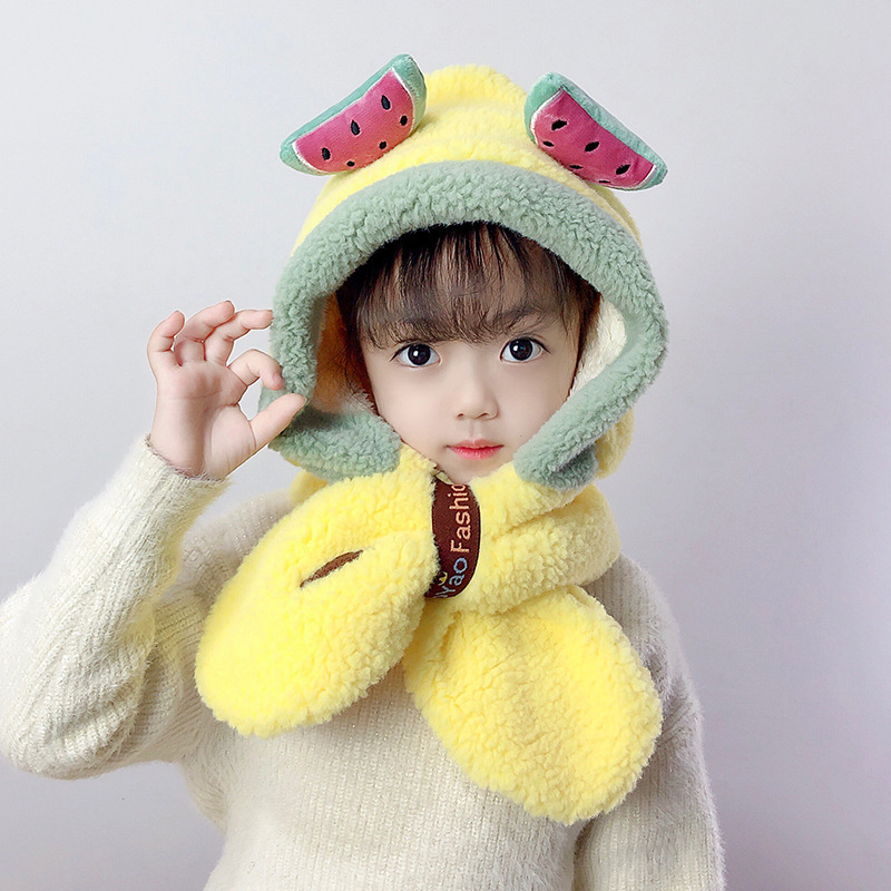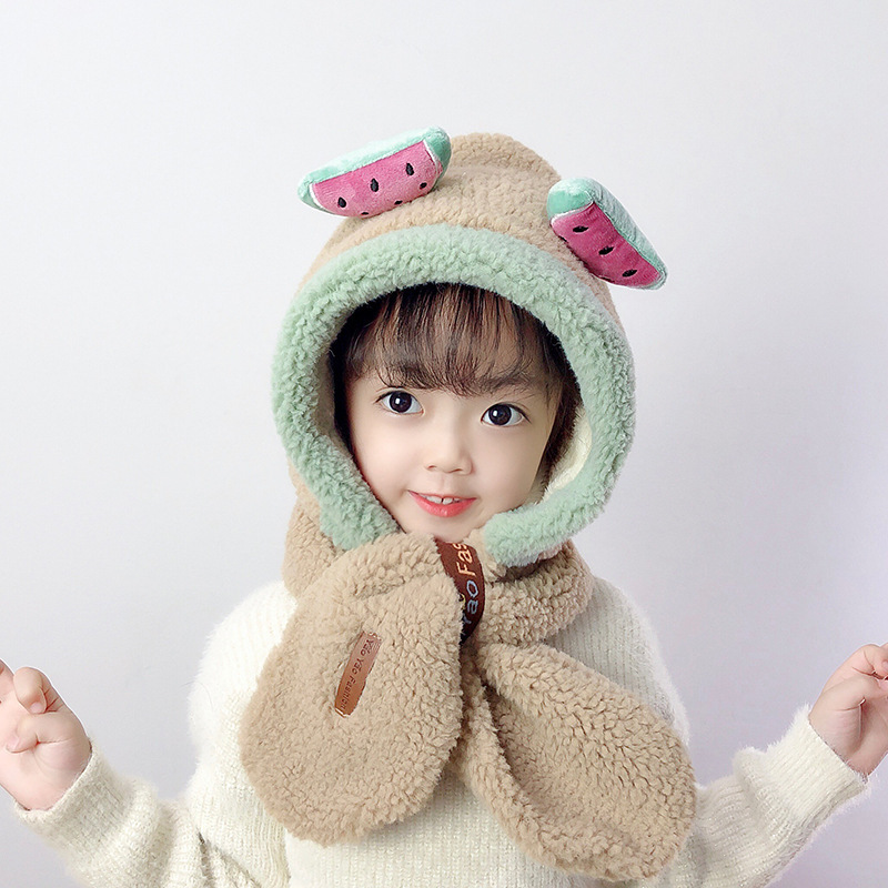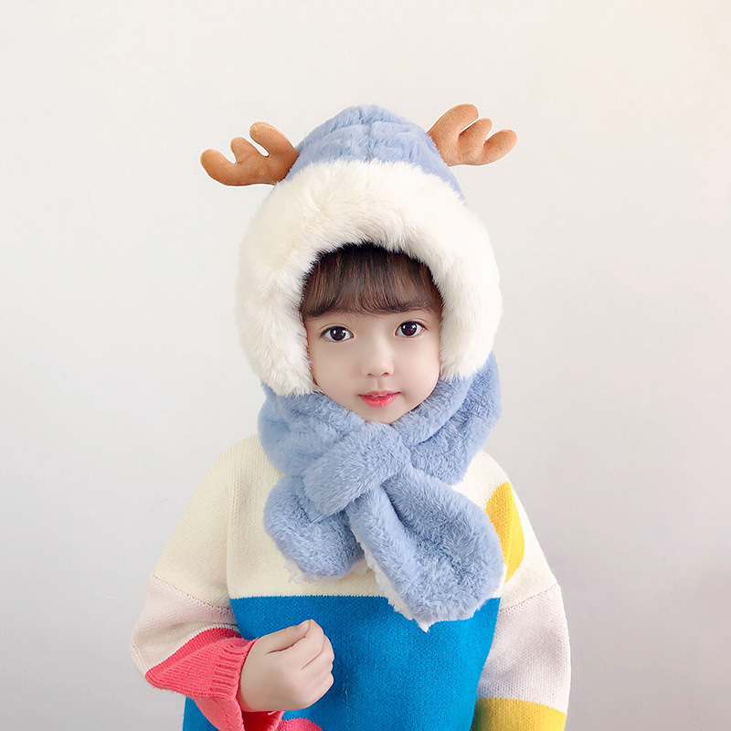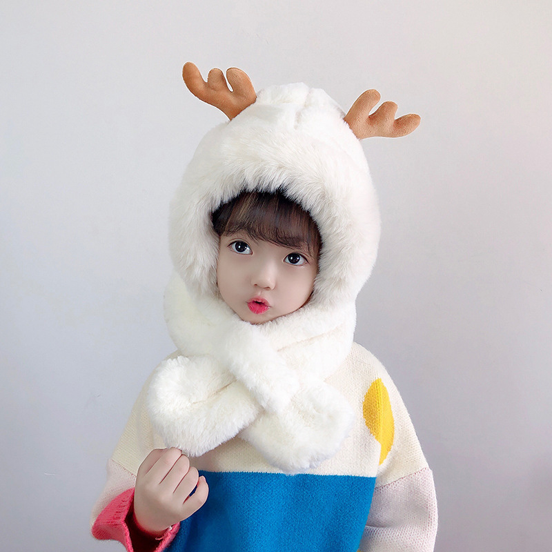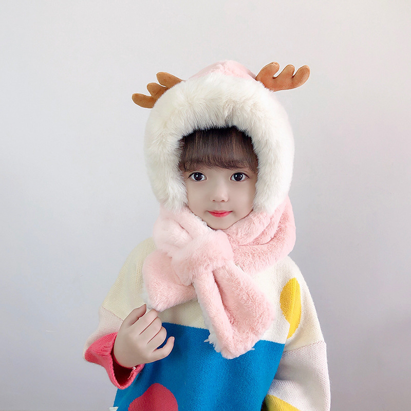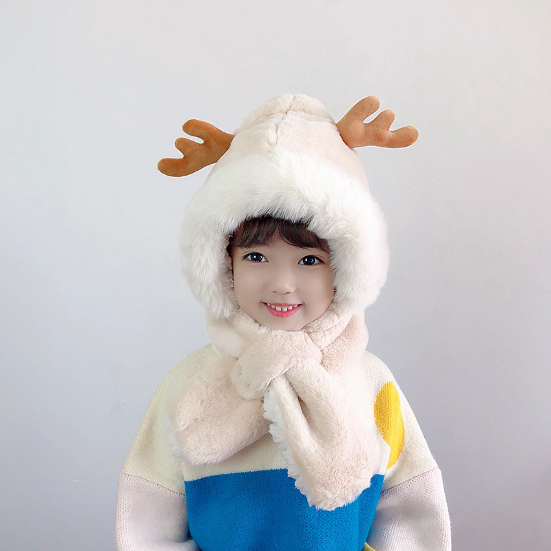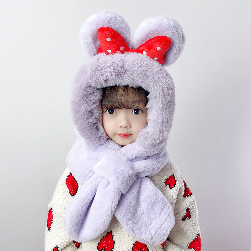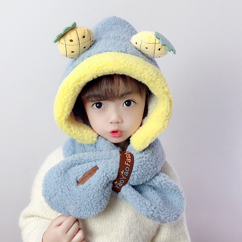 厂家批发冬季加绒儿童帽子围巾手套一体帽毛绒卡通加厚防风帽